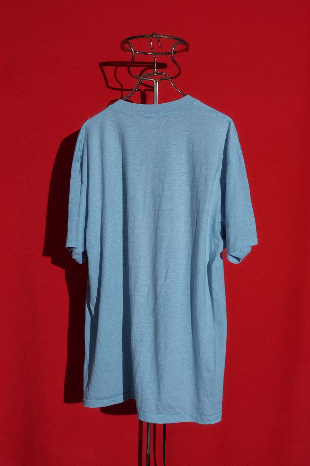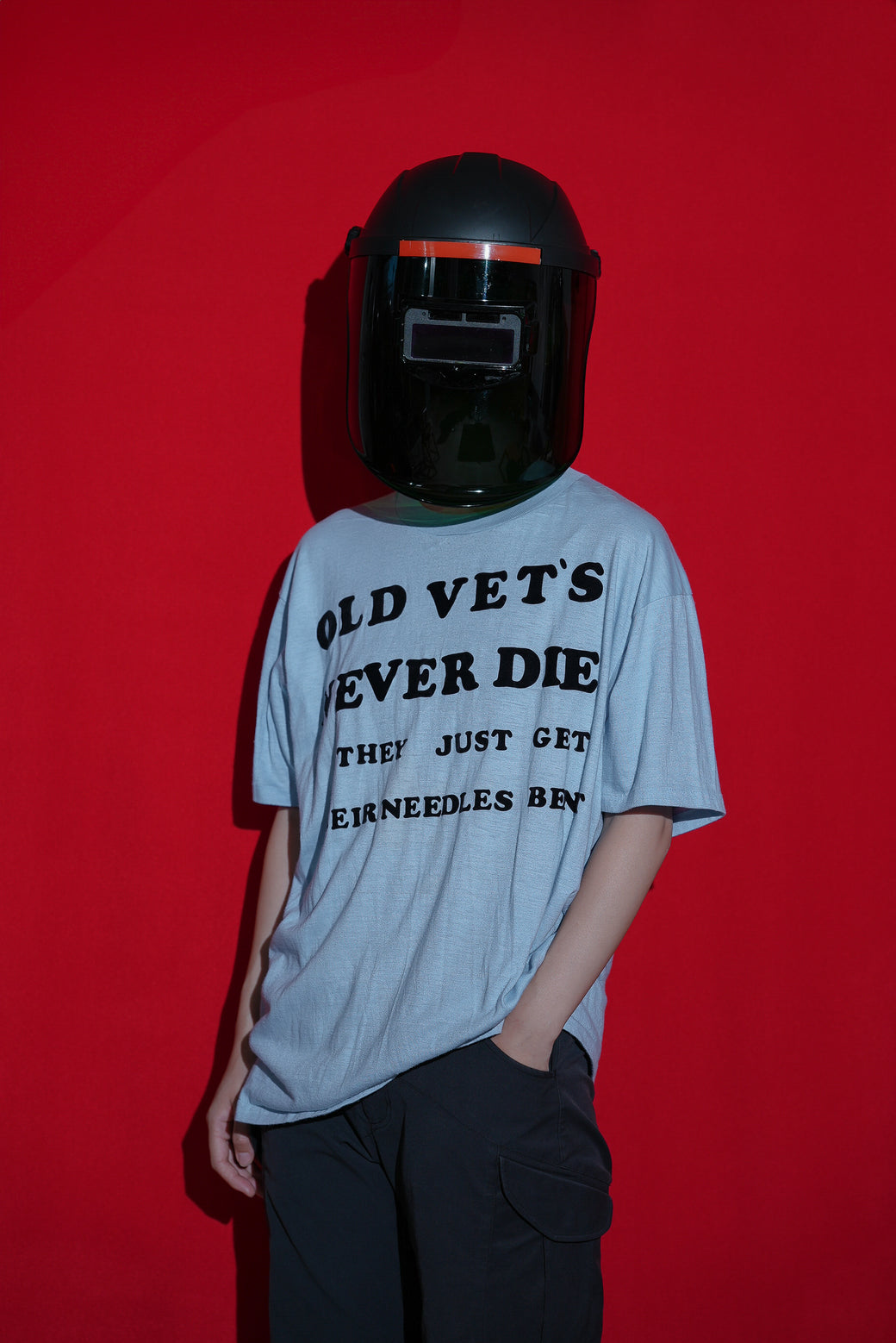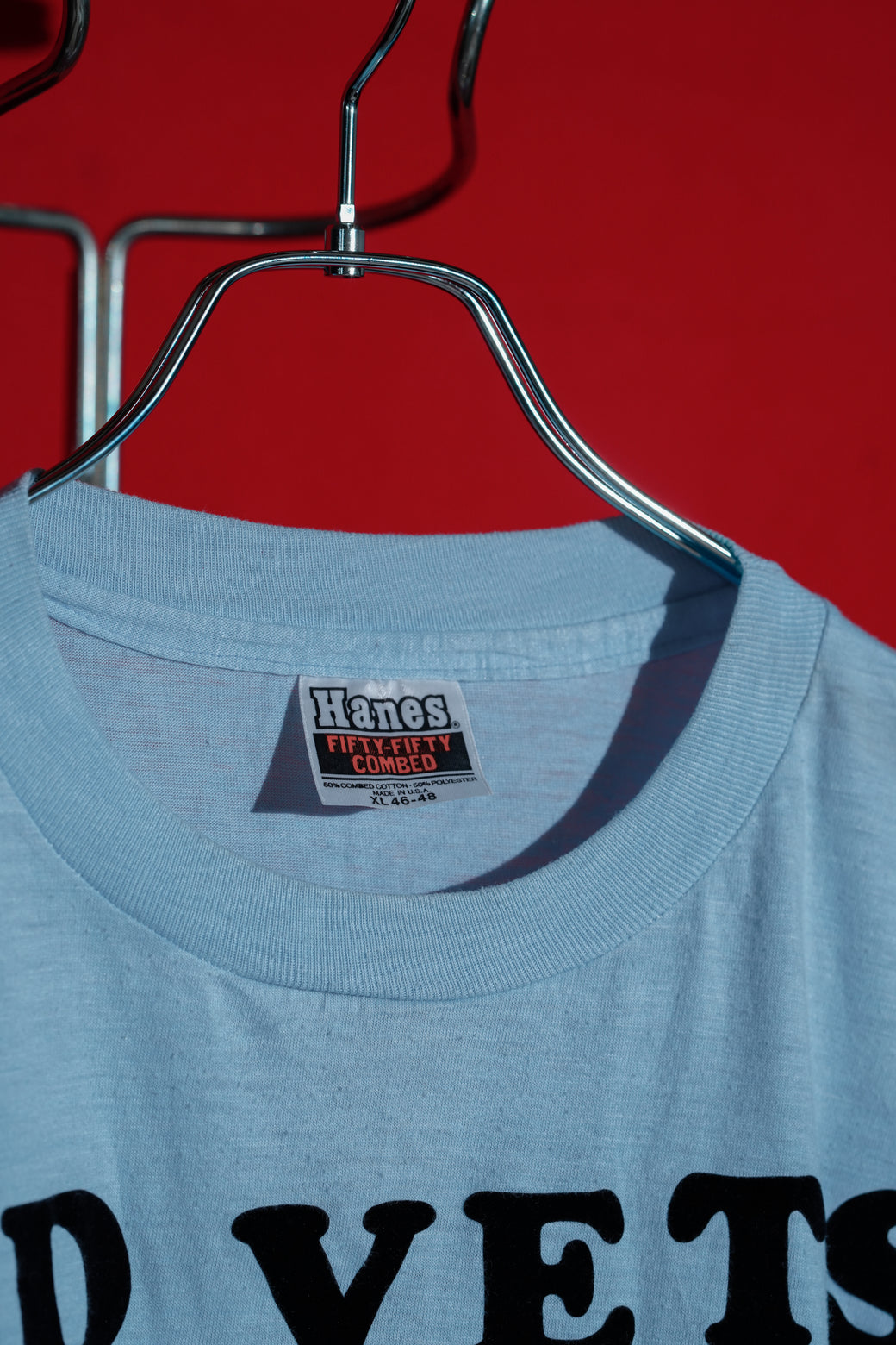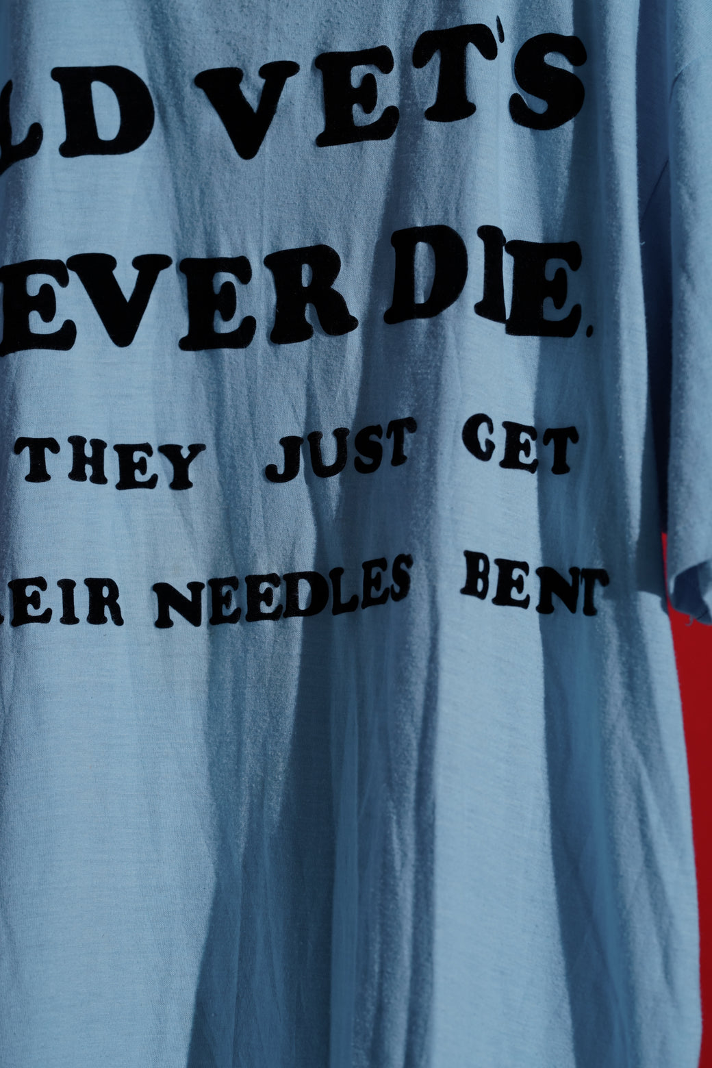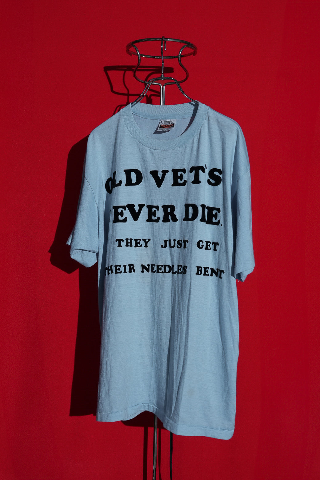 1980年代のブラックユーモアなTシャツ。おそらく老練の彫師か医師 (針仕事)による言葉で、"OLD VET'S NEVER DIE. THEY JUST GET THEIR NEEDLES BENT"「ベテランは死なない、ただ針が古びただけさ!!(=まだまだ現役だ)」とフェルト地でプリントされている。アメリカンのジョーク文化が詰まったアイテム。ボディは"Hanes"製でMADE IN USA。経年による適切な風合いを伴った良好なコンディション。