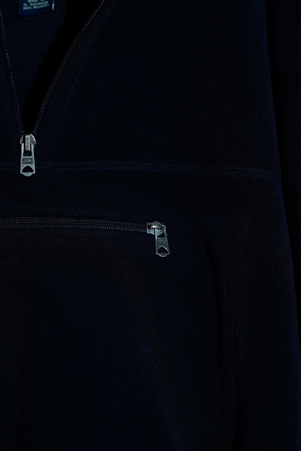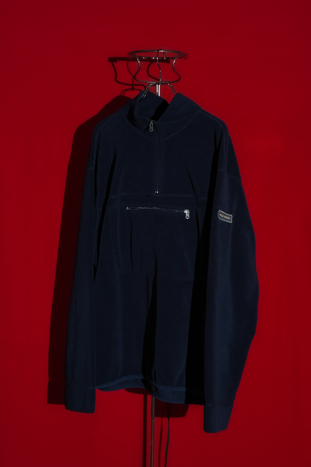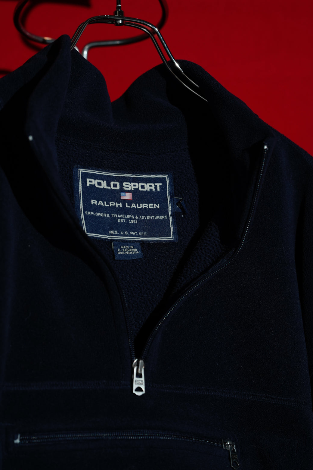 1990年代後期の「POLO SPORT」のプルオーバーフリース。ボディにハーフジップ仕様で胸元にジップポケット、腕部にはY2Kらしいカラーリングのパッチ付き。ボディカラーはダークネイビーで、生産はエルサルバドル製。経年による適切な風合いを伴った良好なコンディション。
