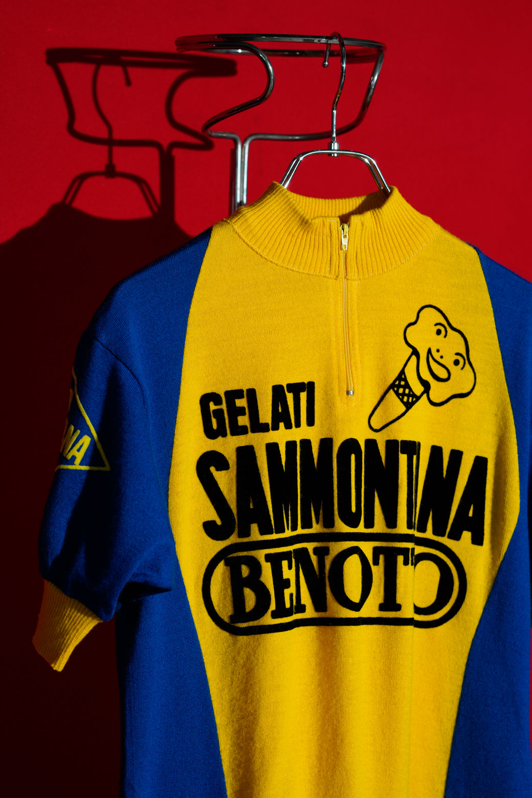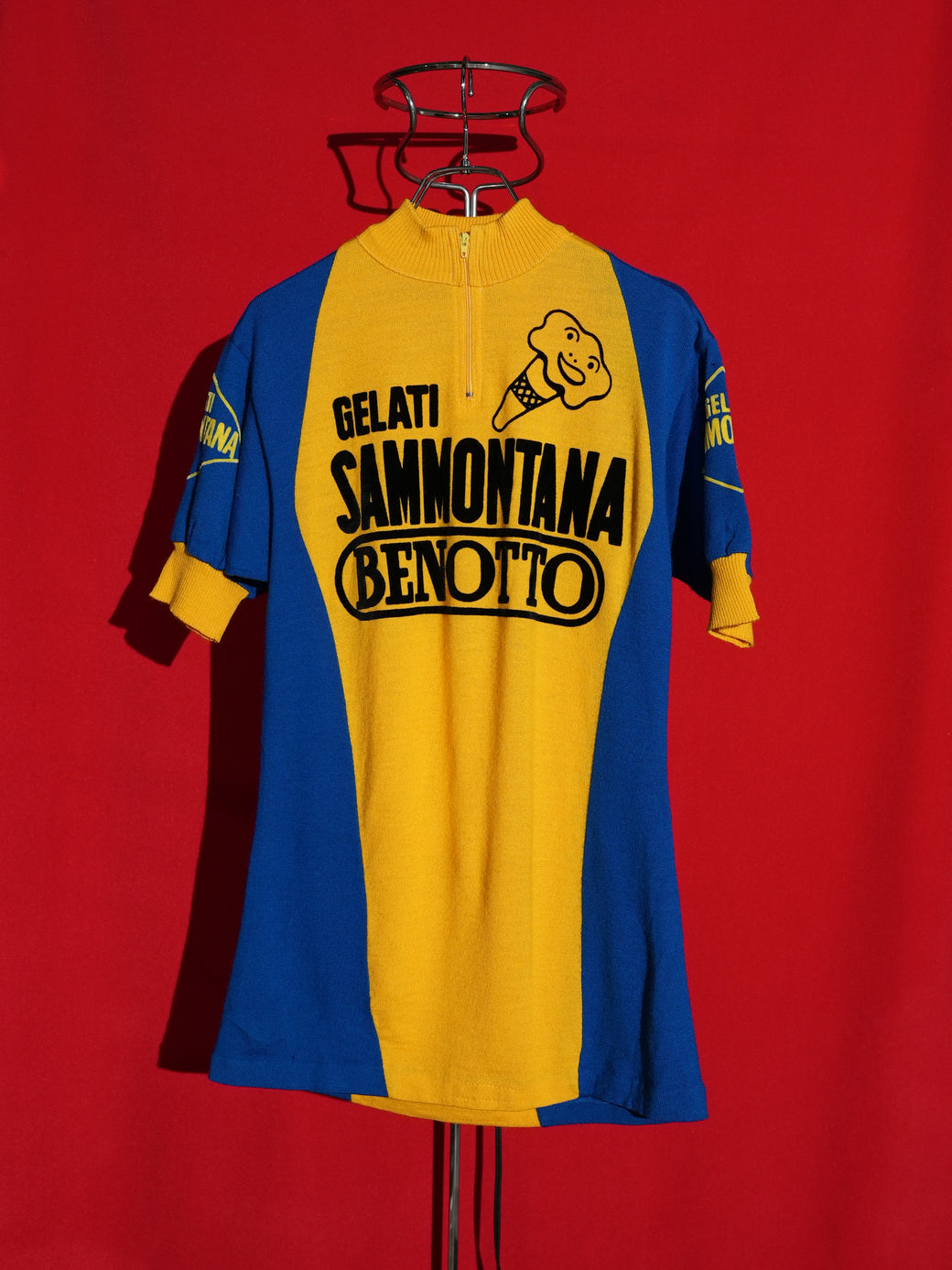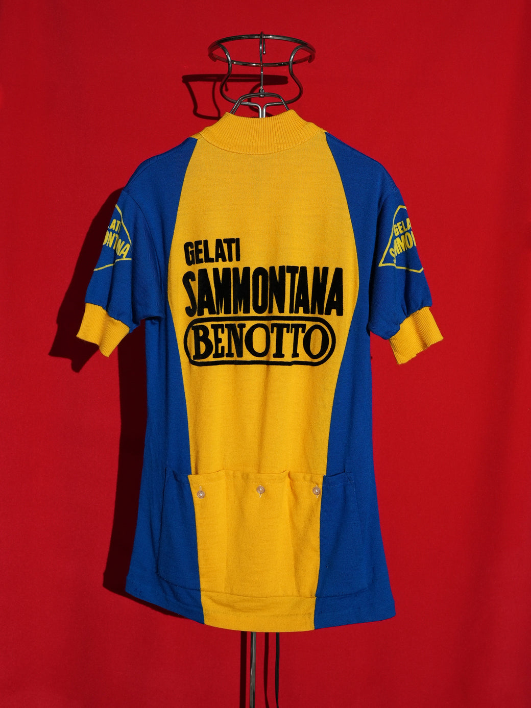 This is a cycling jersey from the Italian cycling manufacturer “Benotto” from the late 1970s. The graphics feature the ice cream brand “Gelati Sammontana,” which they sponsored. The graphics on the chest and back are applied using felt printing. The body is made by “CORIMA” and is MADE IN ITALY. Considering its age and competitive background, it remains in remarkably good condition.
