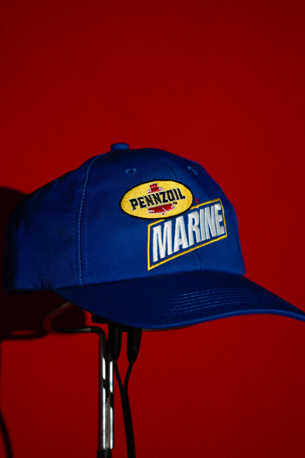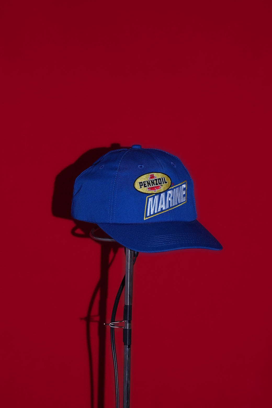 This is a PENNZOIL racing cap. The adjuster is a snapback. It is in good condition with appropriate patina from age.