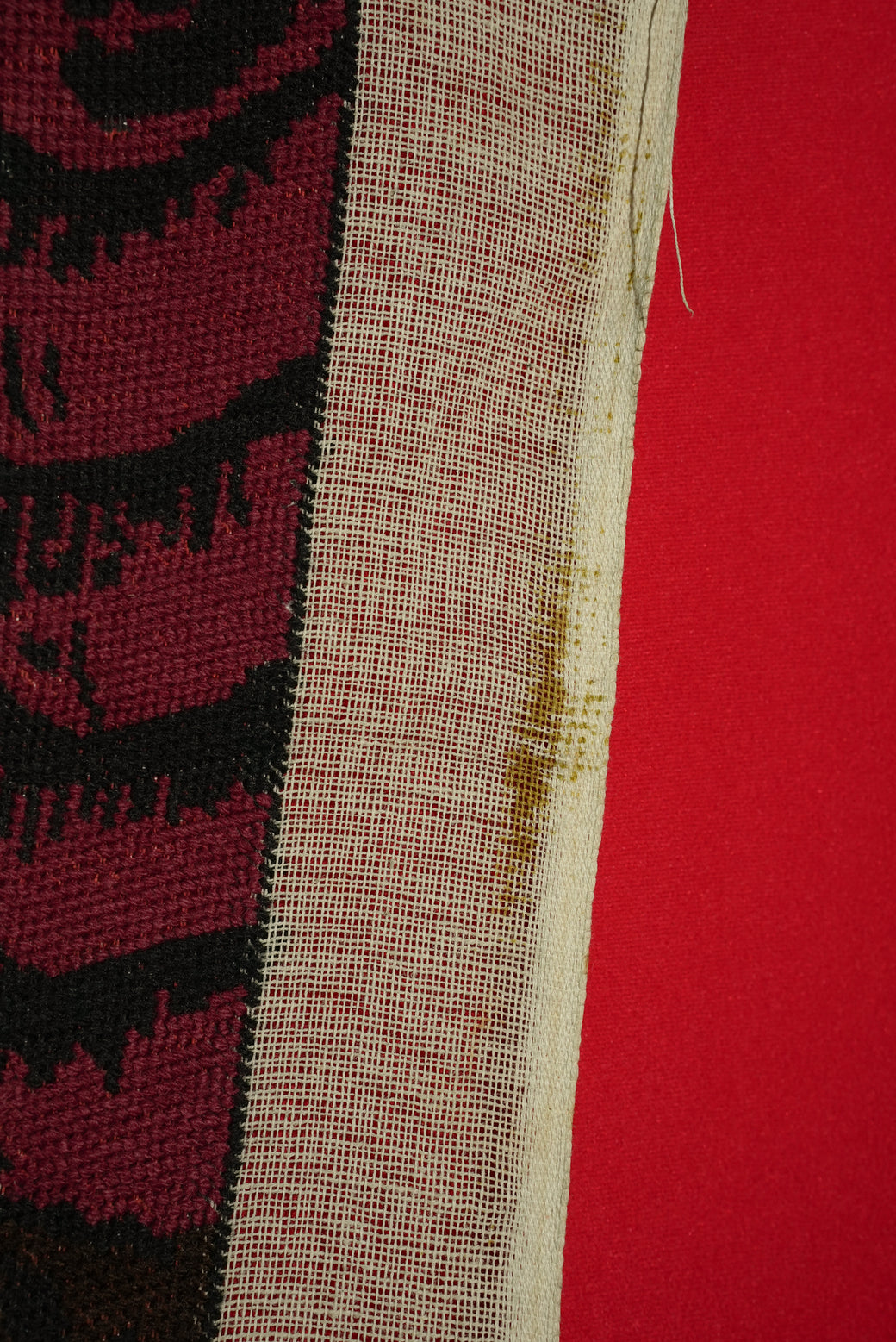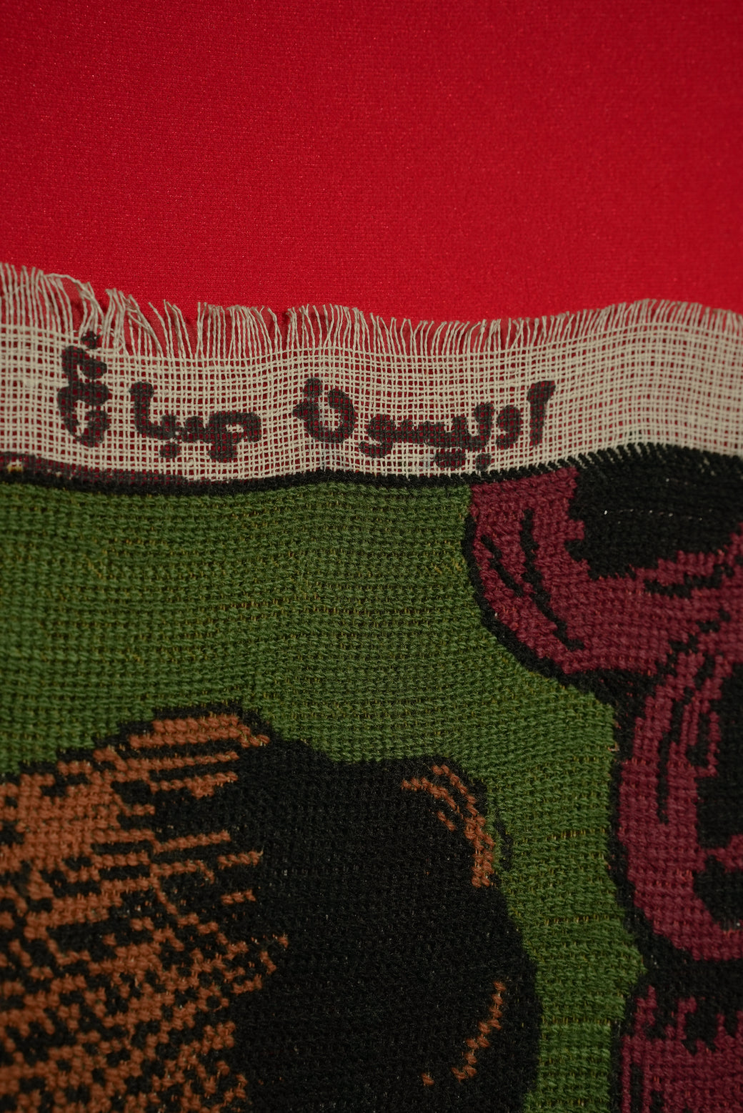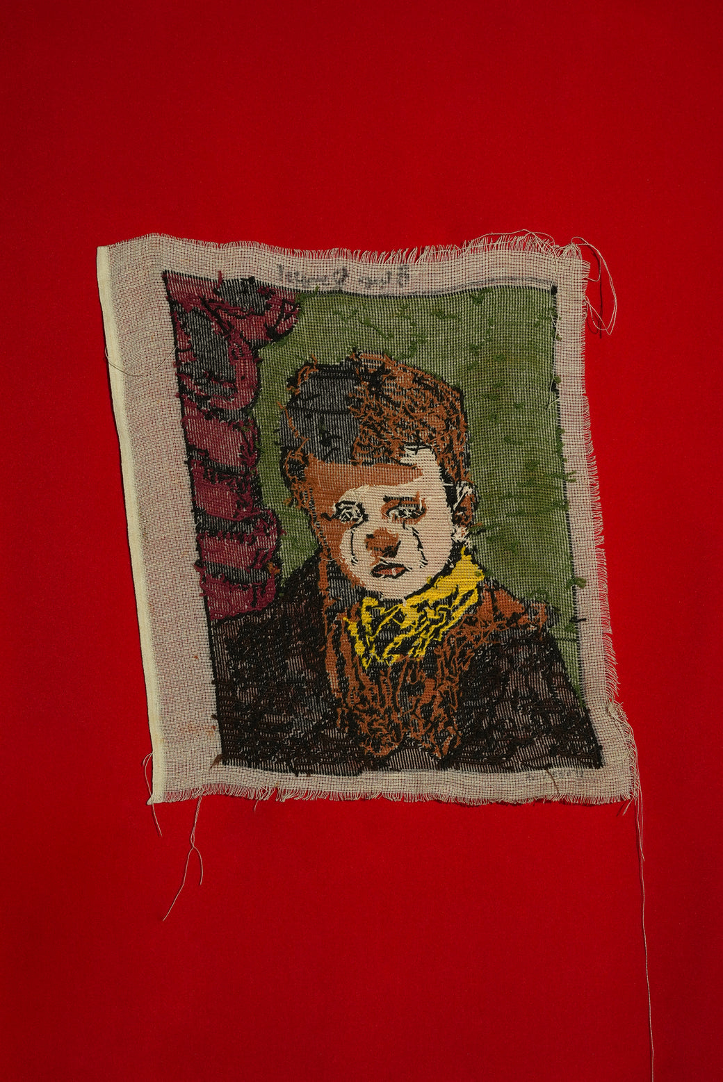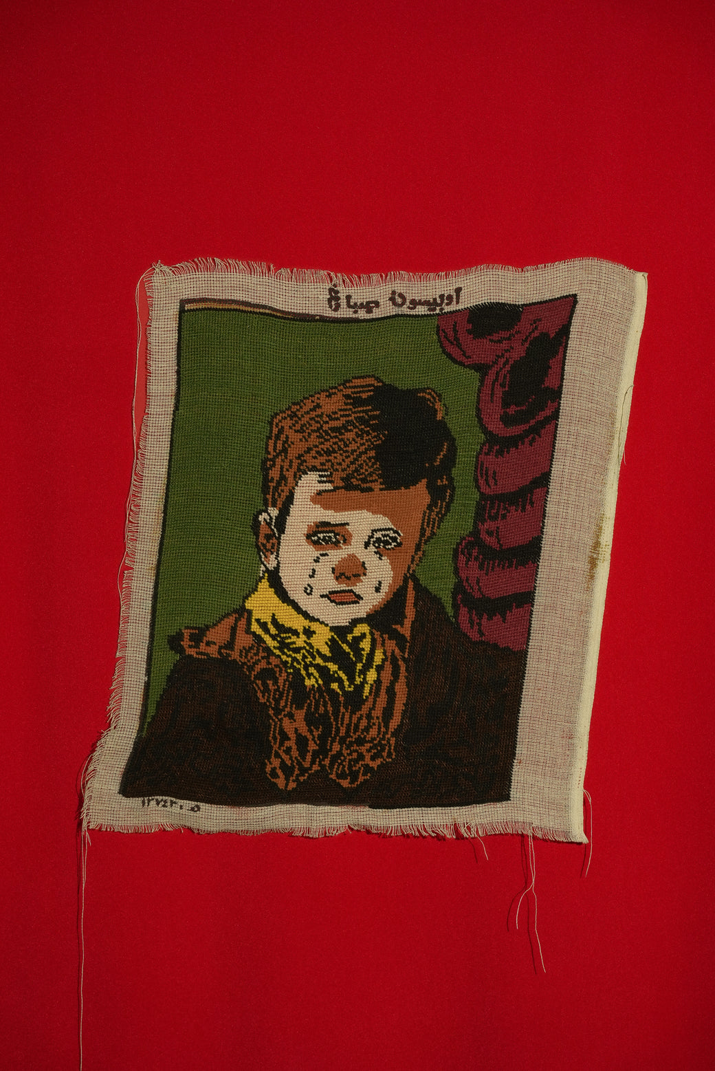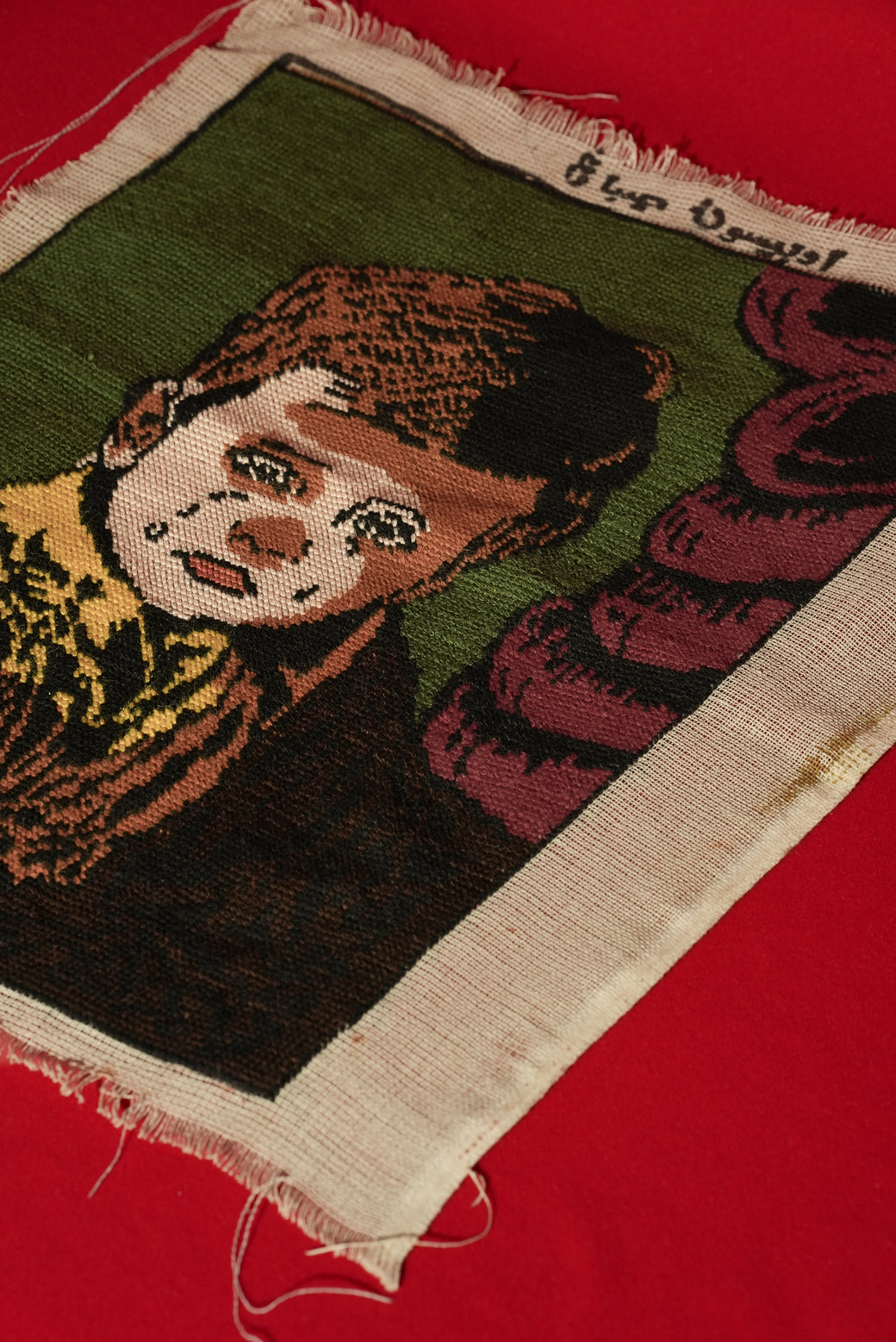 1975年製のペルシャなど中東由来のピクチャーラグの一種で、壁掛けや装飾に使われるタスペトリーアート。切ない肖像を描いたもので、感情的なテーマが多いのもピクチャーラグの特徴。素材は綿の基布にウールや絹糸で手織りされており、糸で図柄を織り込んだ本格的なタスペトリー。年号以外は読解が不能の為、工房や作家者は不明。経年による適切な風合いを伴ったコンディション。