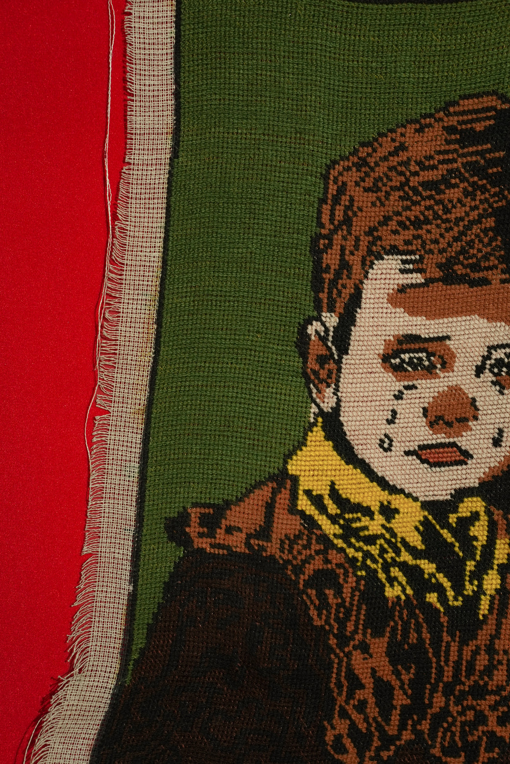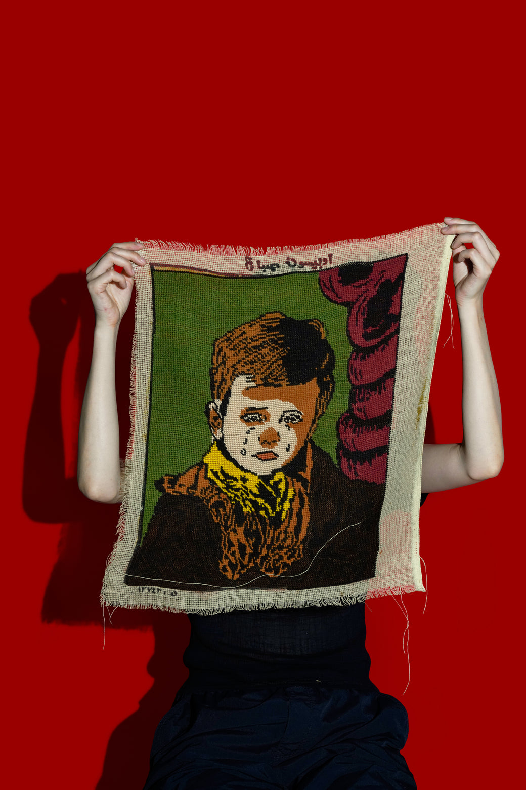 This is a type of picture rug originating from the Middle East, such as Persia, made in 1975. It is a tapestry art piece used for wall hangings or decoration. It depicts a poignant portrait, and emotional themes are a characteristic feature of picture rugs. The material is a cotton base fabric handwoven with wool or silk threads, a genuine tapestry where the design is woven into the threads. The workshop and artist are unknown as the inscription is illegible except for the year. It is in good condition with an appropriate patina from aging.