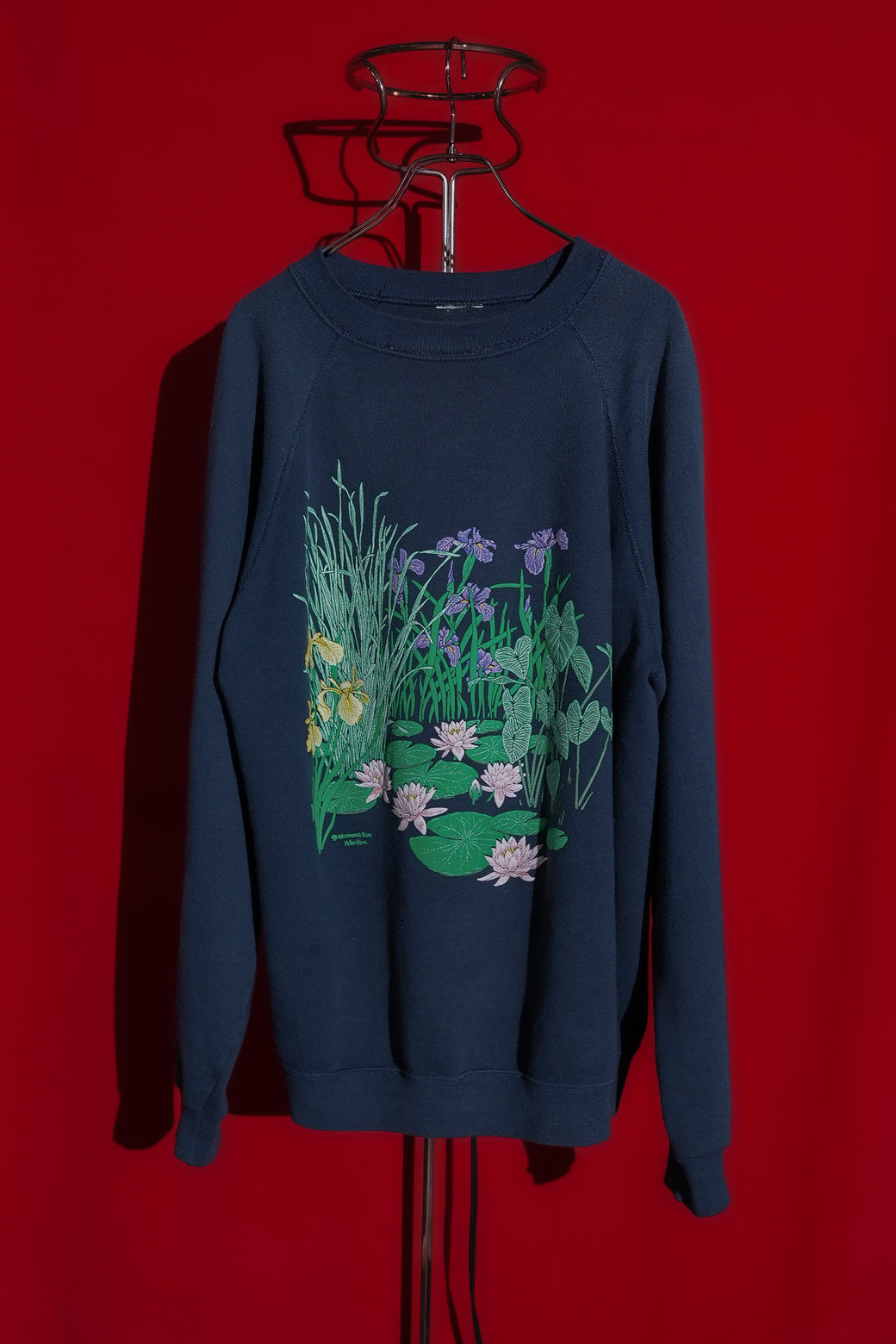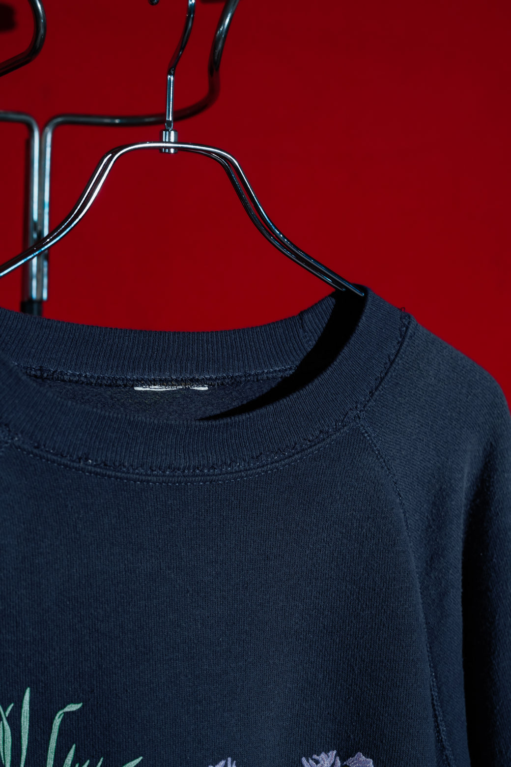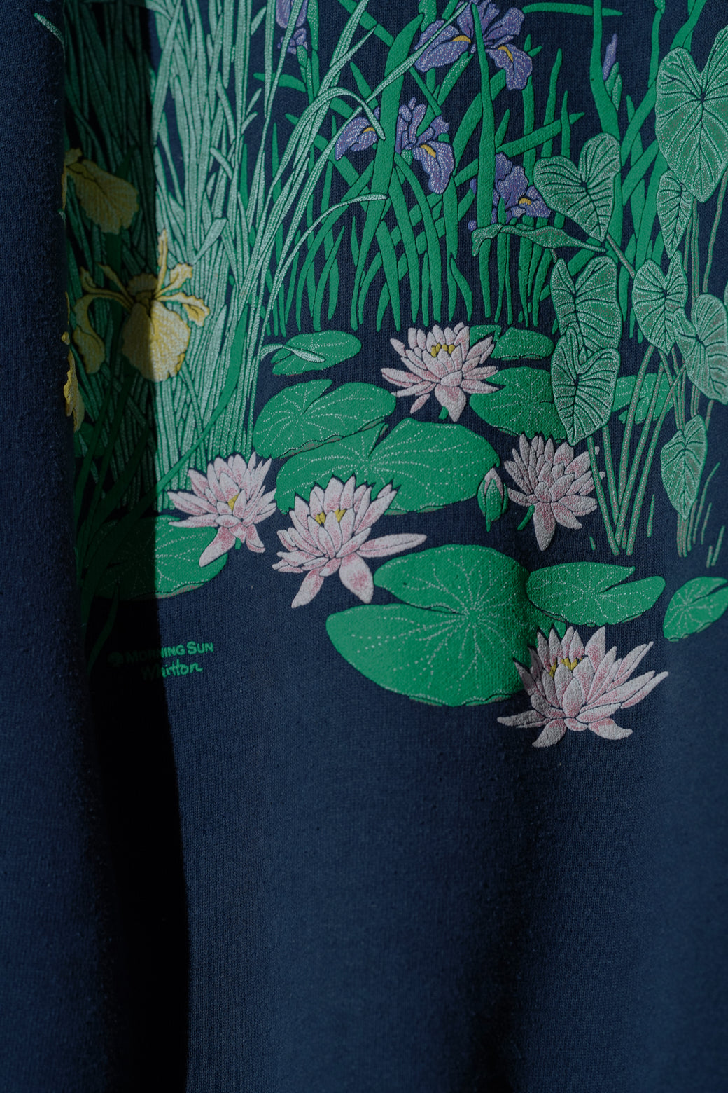 1980年代から1990年代にアメリカの自然系のアートプリントの衣類を展開していたブランド「Morning Sun」のボタニカルスウェット。 "Whitton"という、イラストレーターが水辺の風景を描いたグラフィック。製法はシルクスクリーン多色刷りのラバープリント。ボディはラグランスリーブで、生産国はMADE IN USA。経年による適切な風合いを伴ったコンディション。