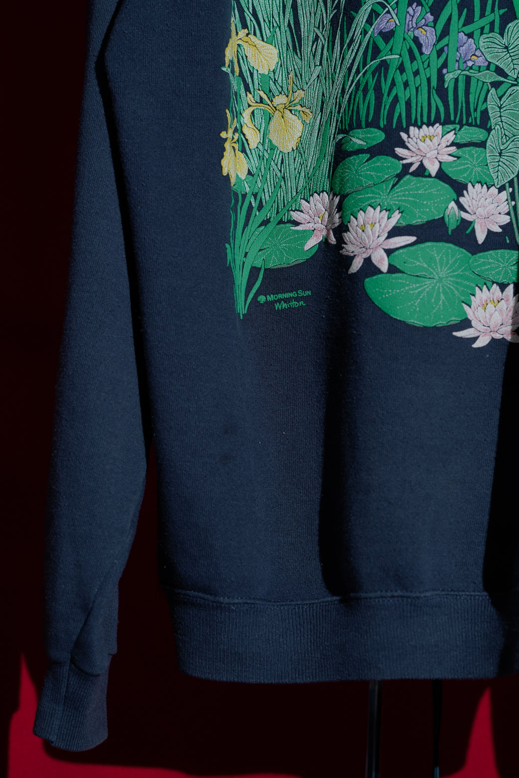 This is a botanical sweatshirt from “Morning Sun,” a brand that produced nature-inspired art print clothing in the 1980s. The graphic features a waterfront scene illustrated by “Whitton.” It's made using a multi-color rubber print silk-screen process. The body has raglan sleeves and is MADE IN USA. It shows appropriate signs of aging.