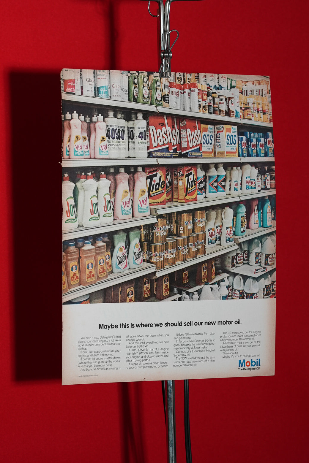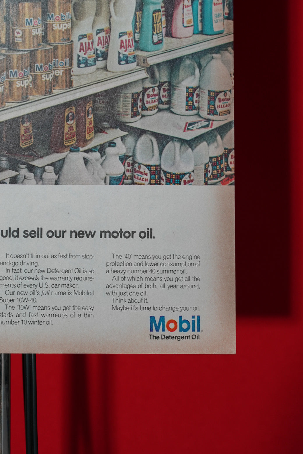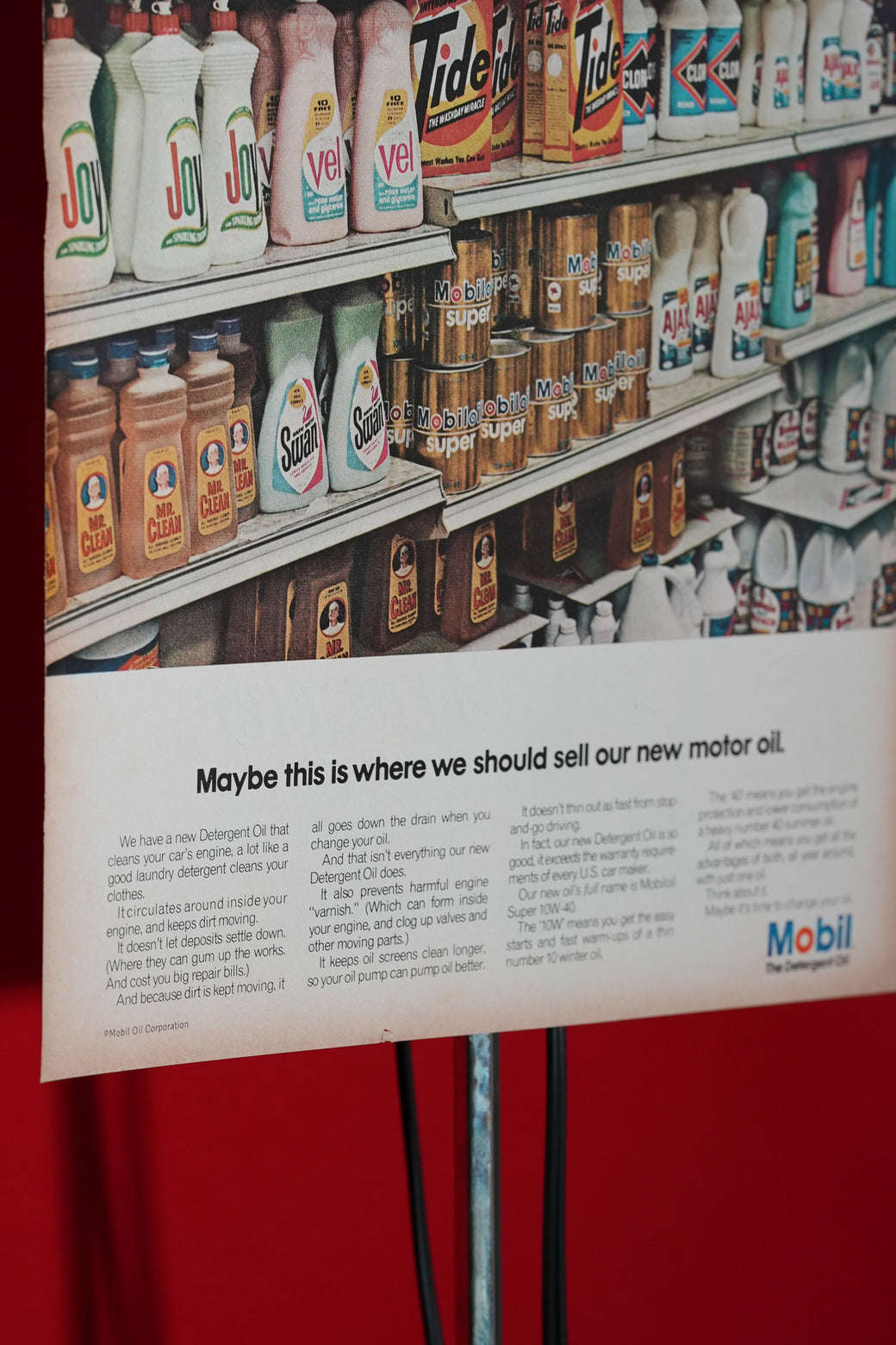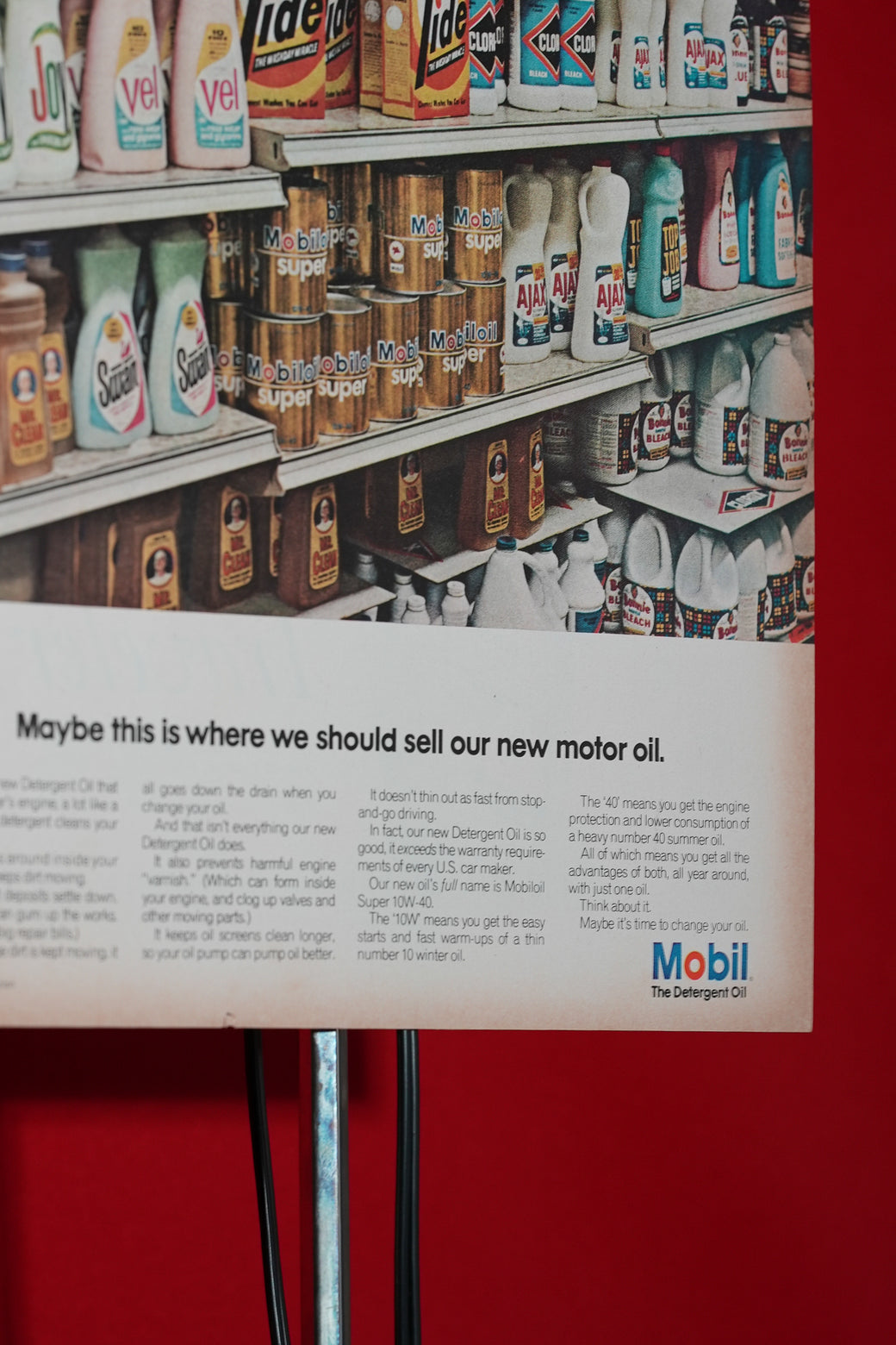 1969年のMOBILのビンテージのマガジン広告、エンジンモーターオイルの洗浄添加剤を洗剤売り場に紛れ込ませて、「綺麗に保つ」という訴求するユニークな広告。経年による適切な風合いを伴った良好なコンディション。