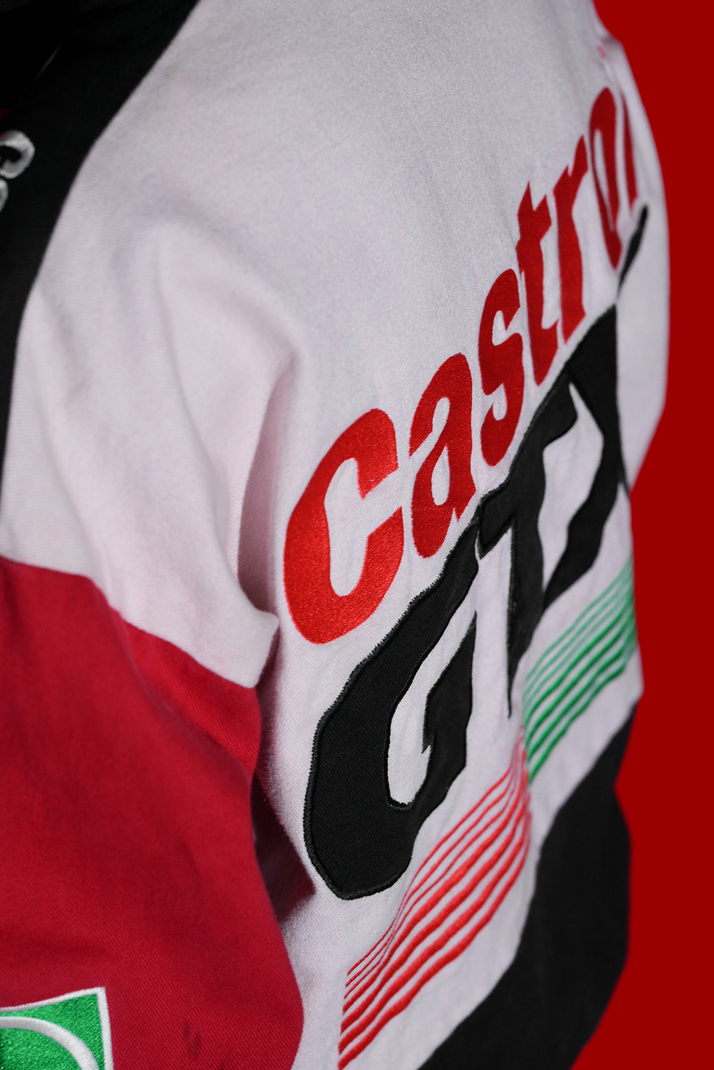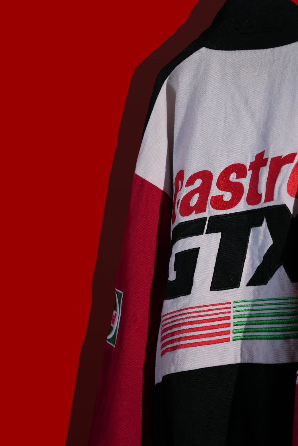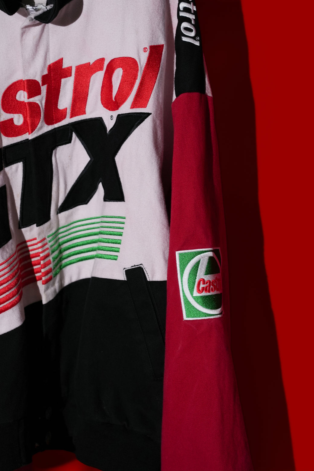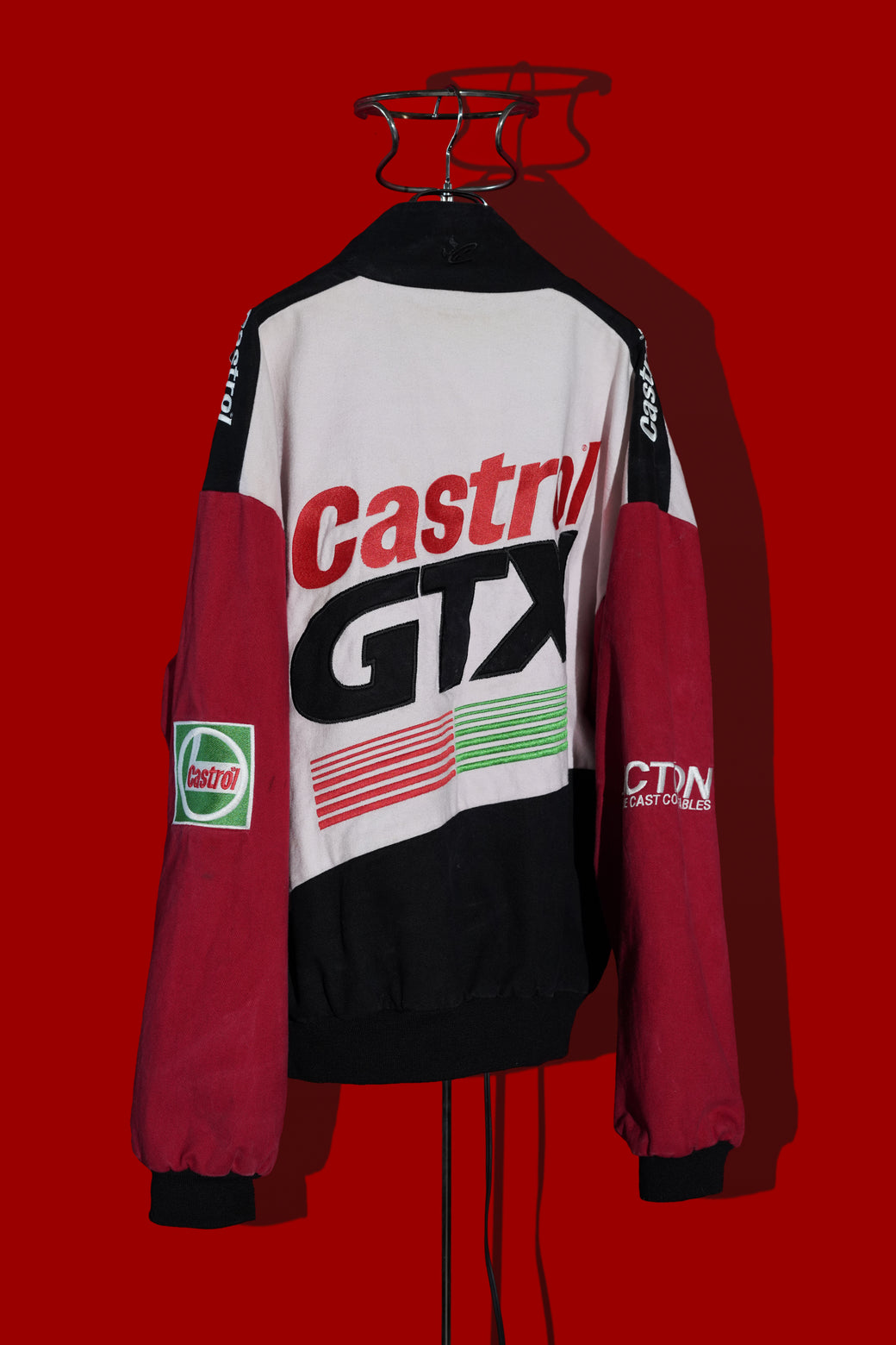 This is a racing jacket from the American motorsports brand “Chase Authentics.” The graphics feature the sponsored brand “Castrol GTX.” The graphics on the chest, back, and sleeves are embroidered. The white areas have a slight pink tint, but the overall condition shows appropriate aging with a well-worn look.