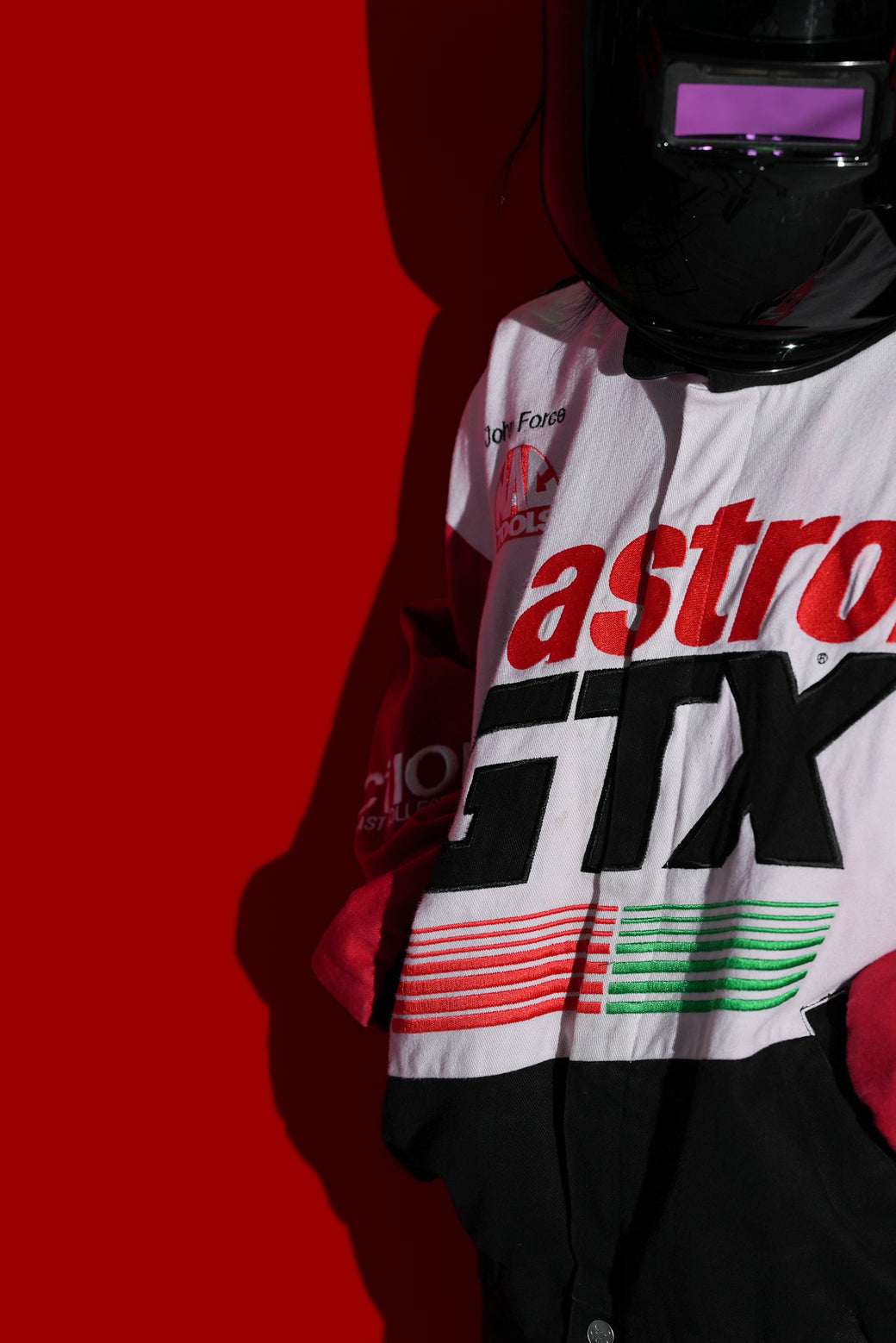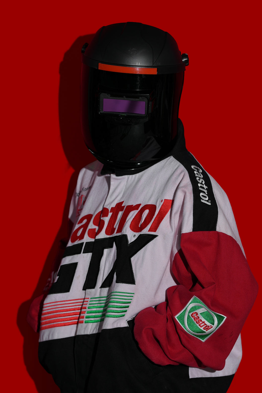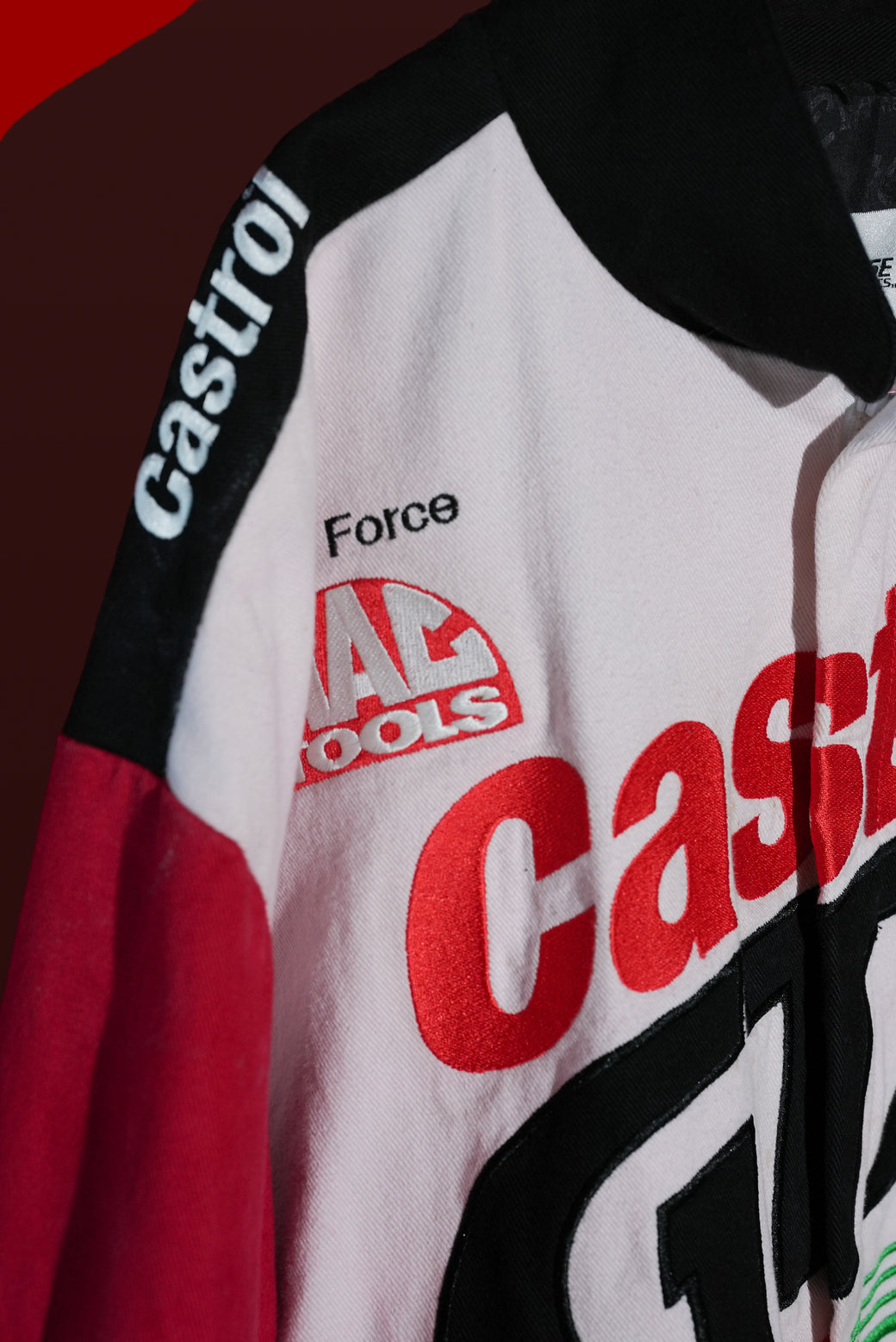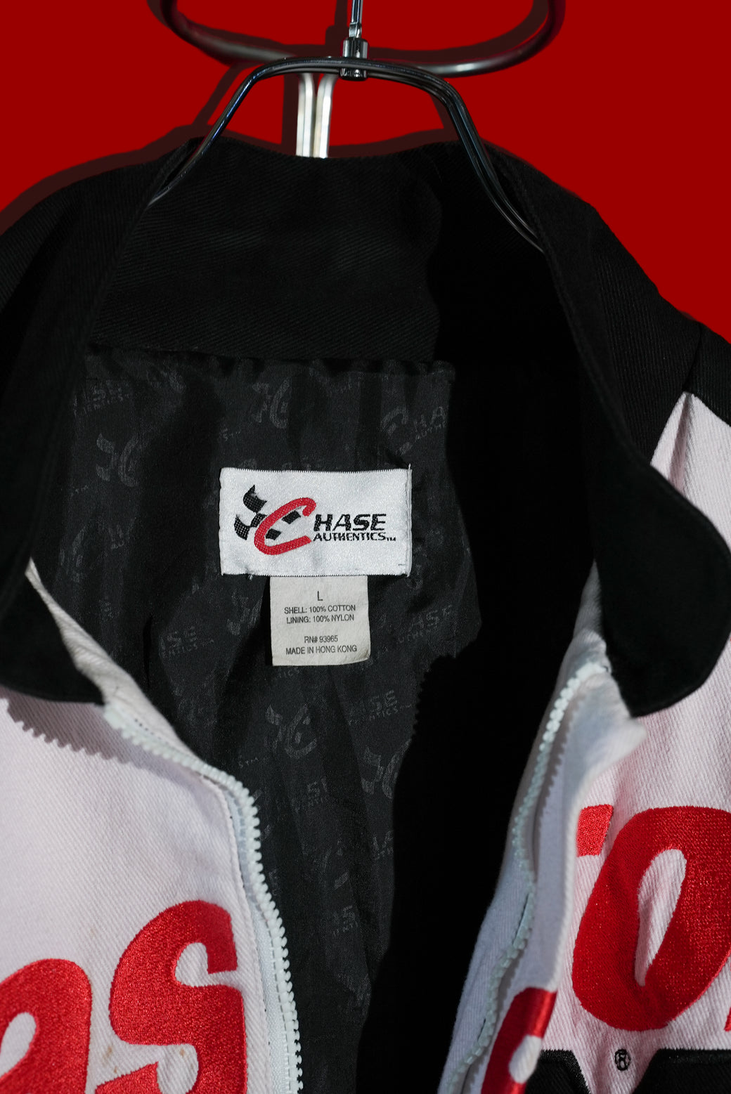 This is a racing jacket from the American motorsports brand “Chase Authentics.” The graphics feature the sponsored brand “Castrol GTX.” The graphics on the chest, back, and sleeves are embroidered. The white areas have a slight pink tint, but the overall condition shows appropriate aging with a well-worn look.