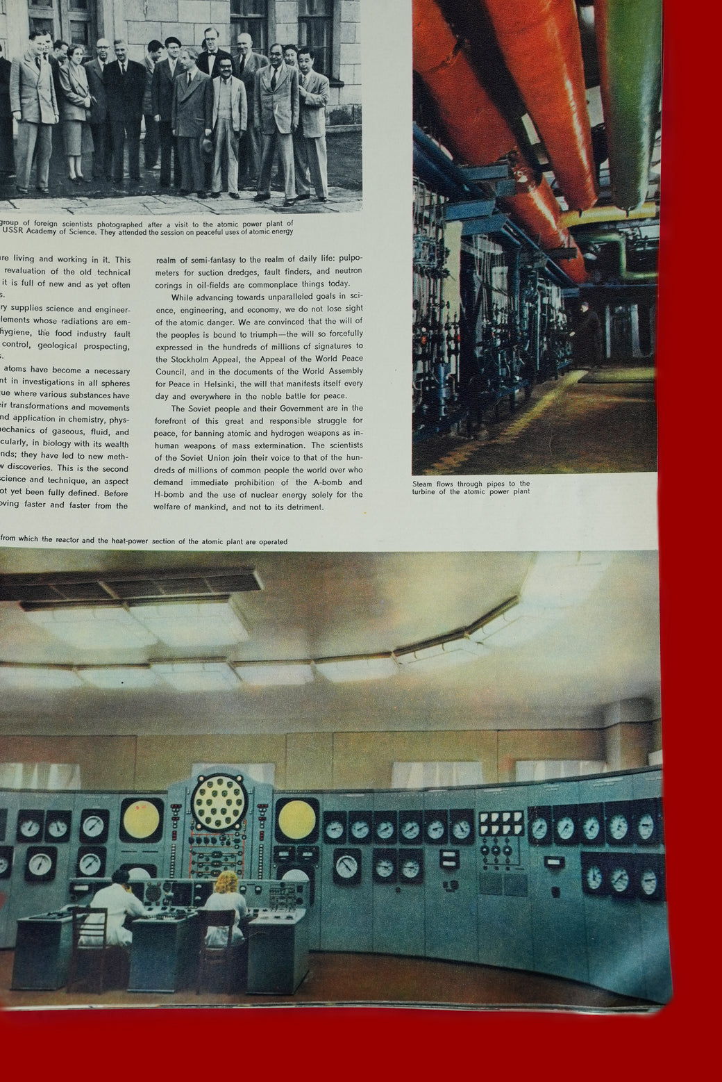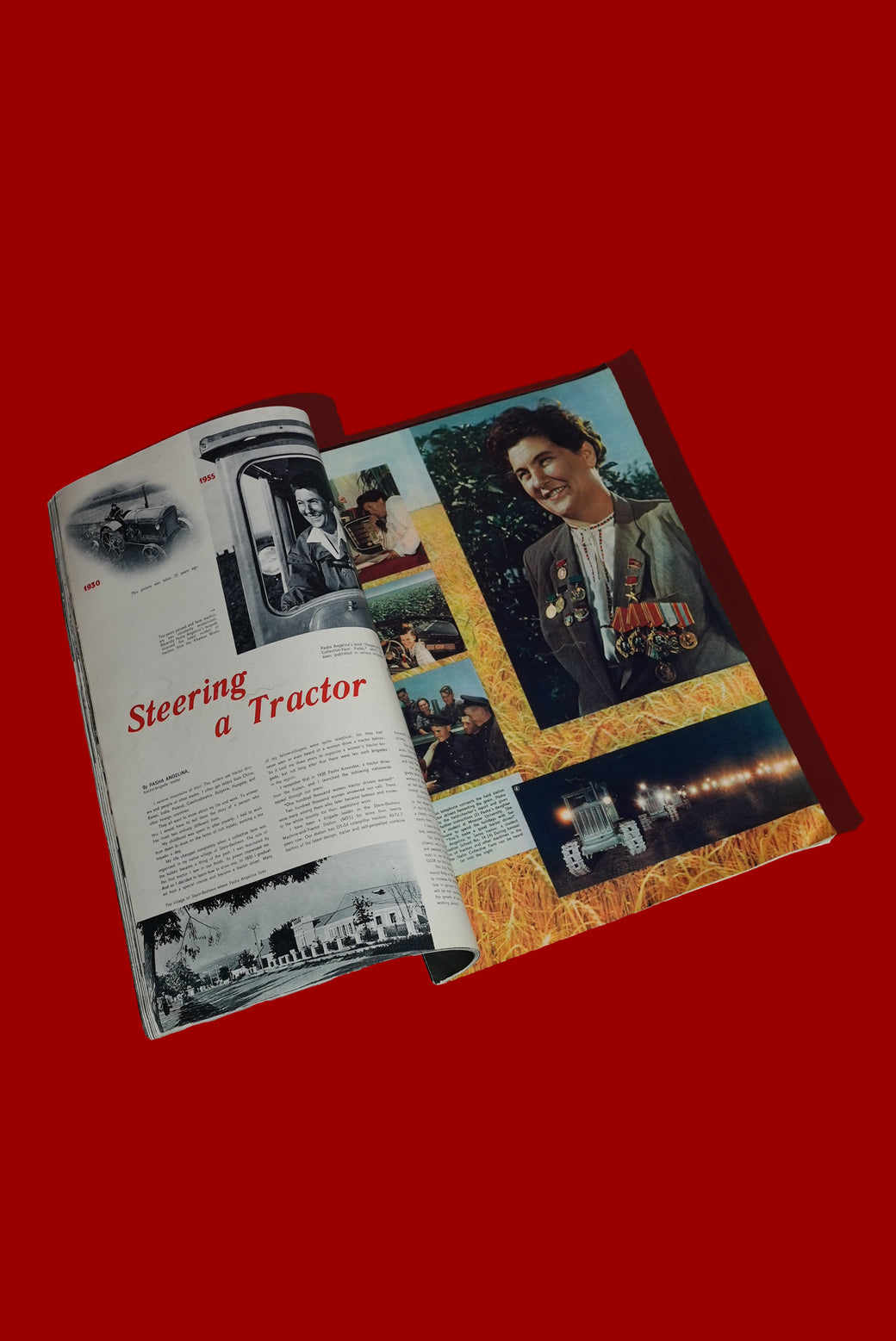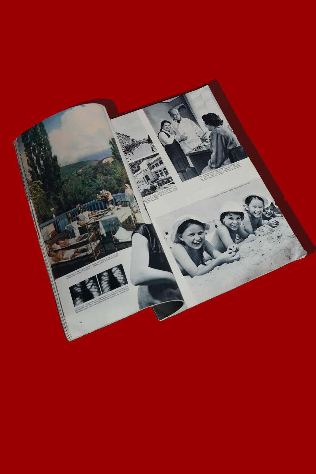 A journal chronicling the Soviet Union during the Cold War era, it served as a propaganda medium featuring renowned photographers such as Flepto, Shaykhet, Ignatovich, and Shagin. It maintains good condition with appropriate patina from age.