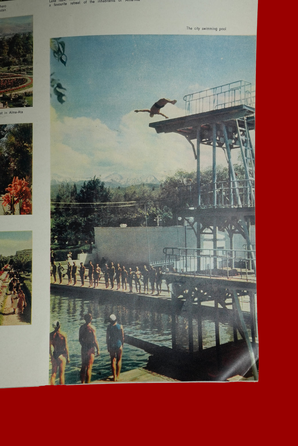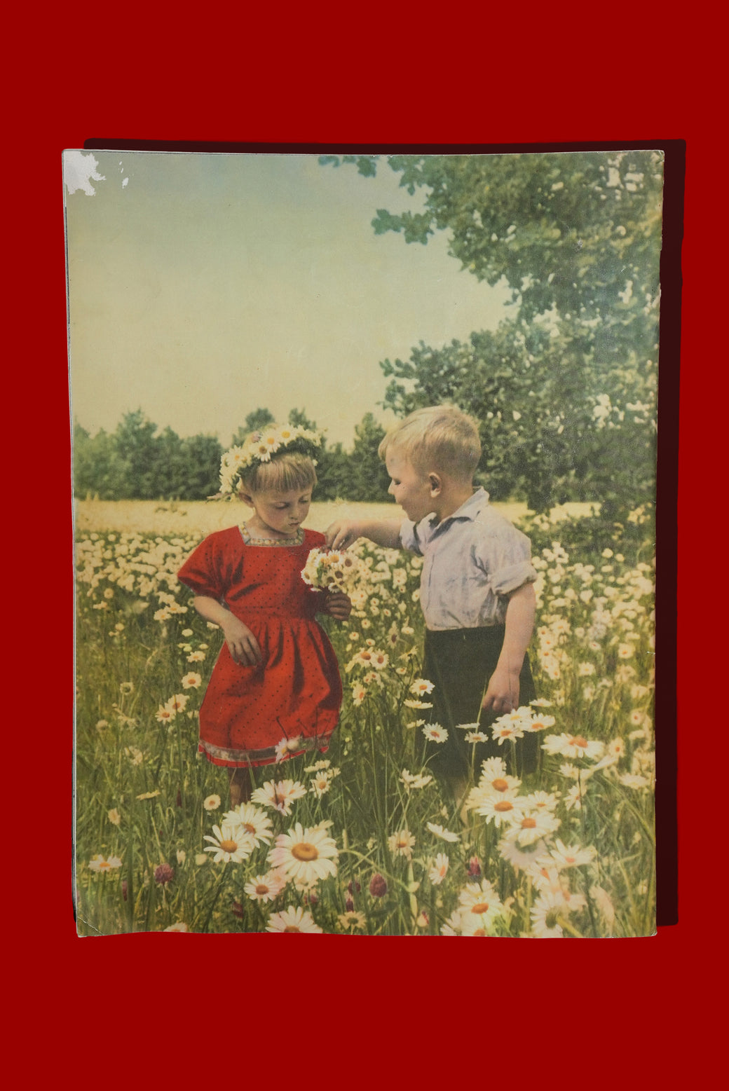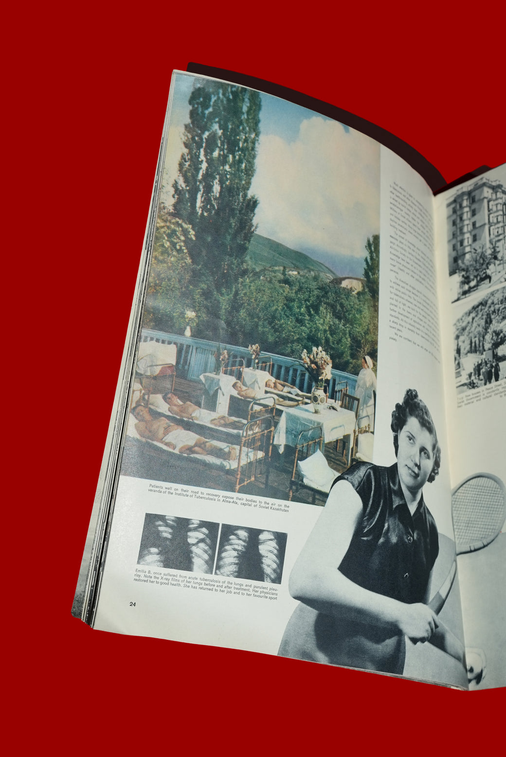A journal chronicling the Soviet Union during the Cold War era, it served as a propaganda medium featuring renowned photographers such as Flepto, Shaykhet, Ignatovich, and Shagin. It maintains good condition with appropriate patina from age.
