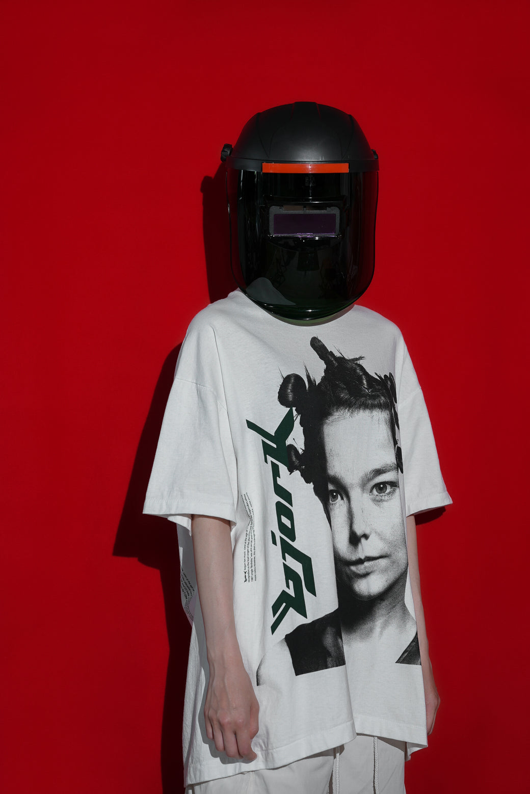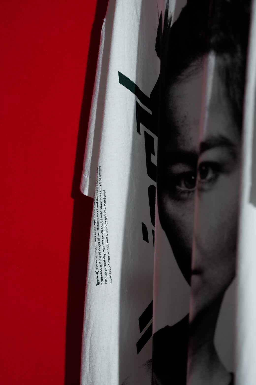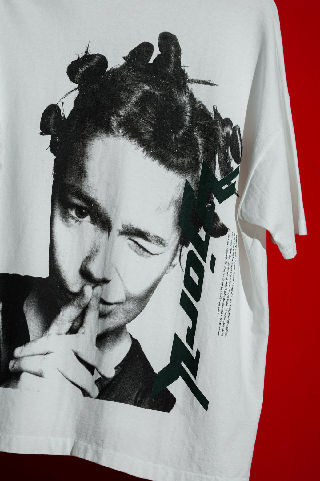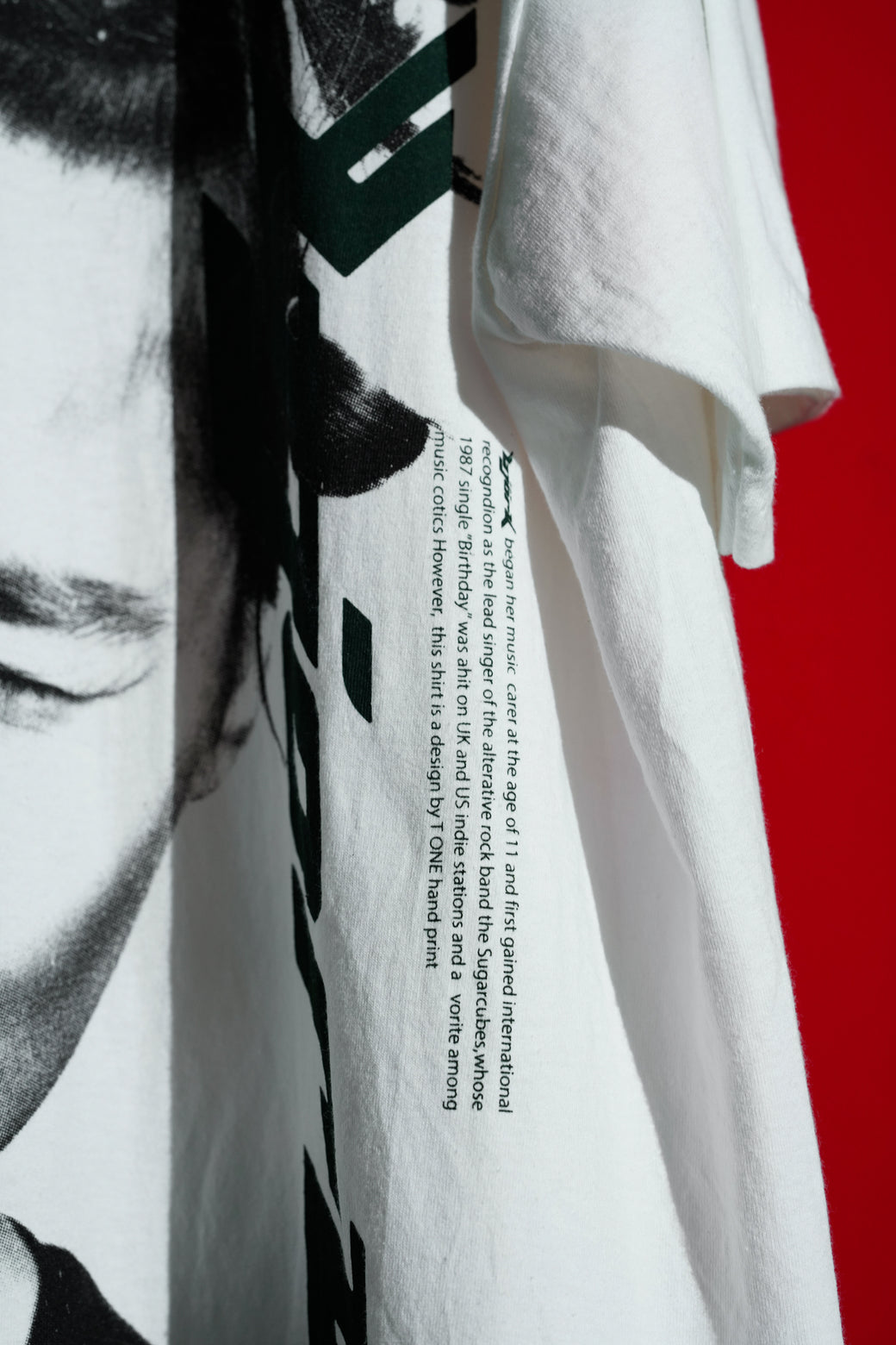 BjörkのグラフィックTシャツ。前後の表情が違う、アンオフィシャルならではの希少なグラフィックが秀逸。デッドストックに近いコンディション。