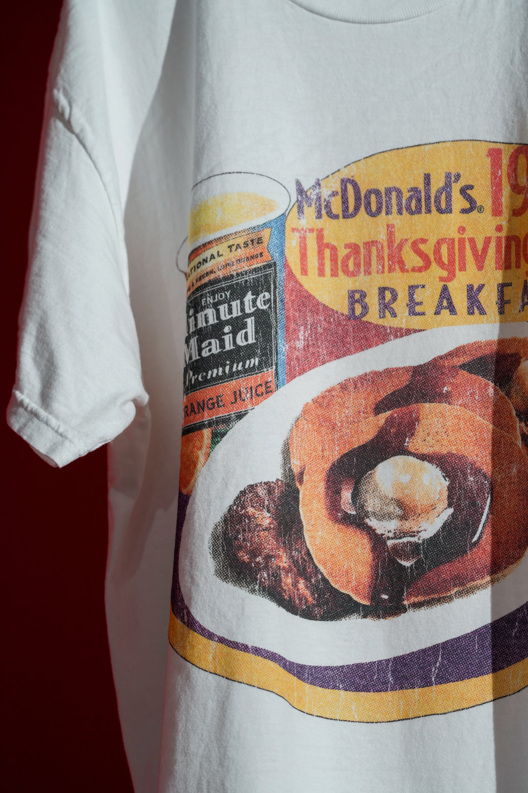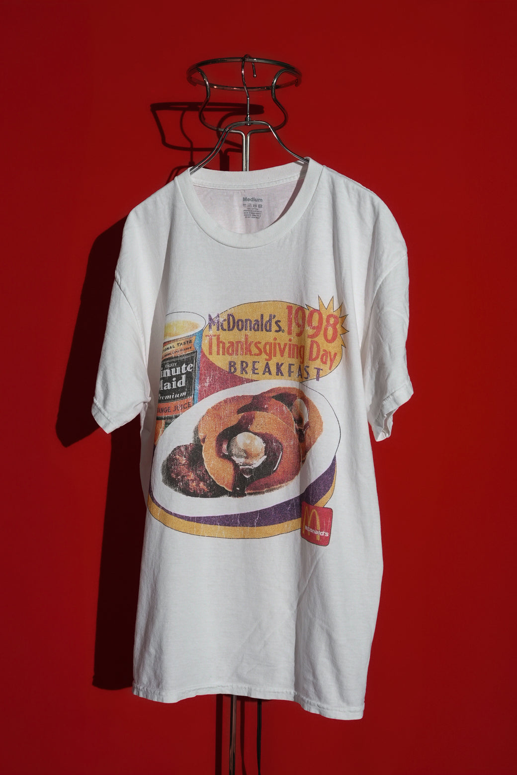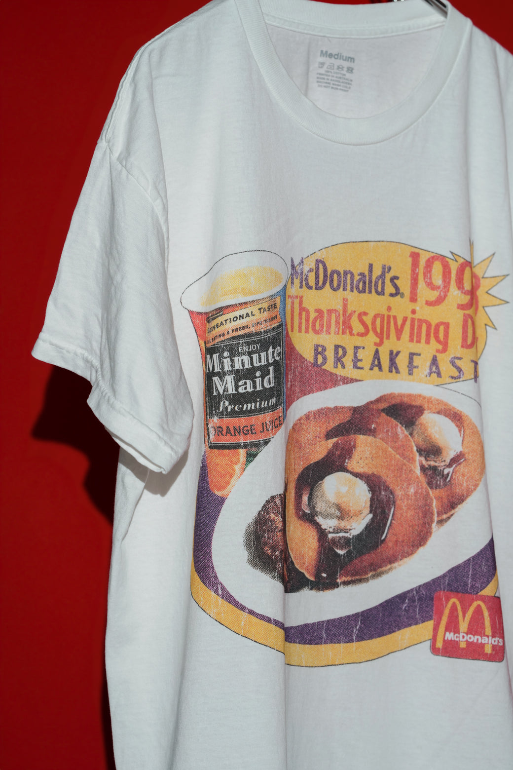 1998年のマクドナルドのプロモーションTEE。サンクスギビングデイのブレックファーストメニューがプリント。ボディはINDONESIA製でプリントは AUSTRALIA製。経年による適切な風合いを伴った良好なコンディション。