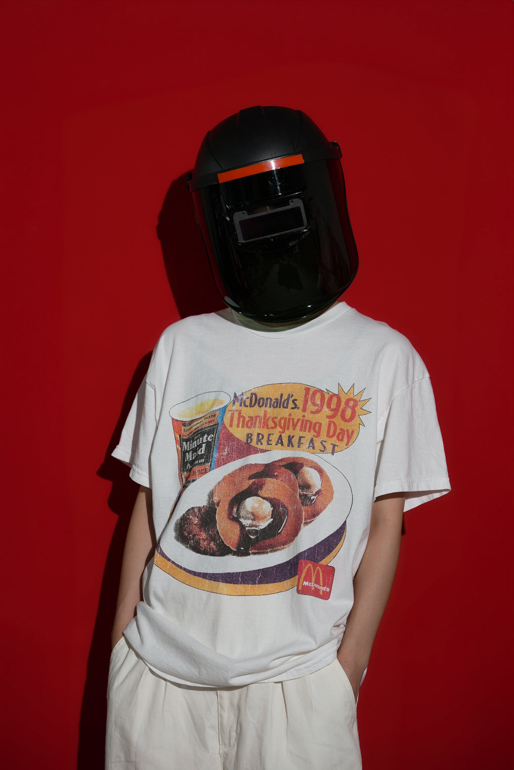 This is a 1998 McDonald's promotional T-shirt. It features a print of the Thanksgiving Day Breakfast Menu. The body is made in INDONESIA, and the print is made in AUSTRALIA. It is in good condition with appropriate aging characteristics.
