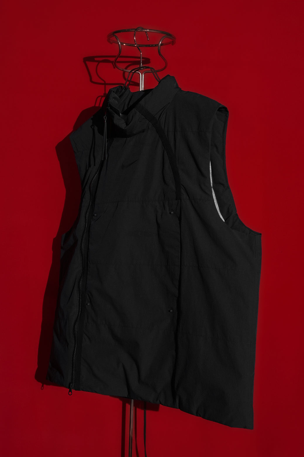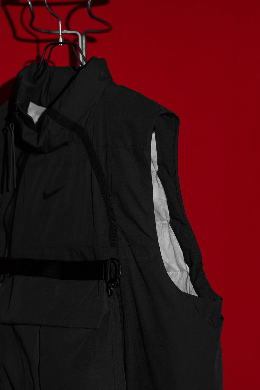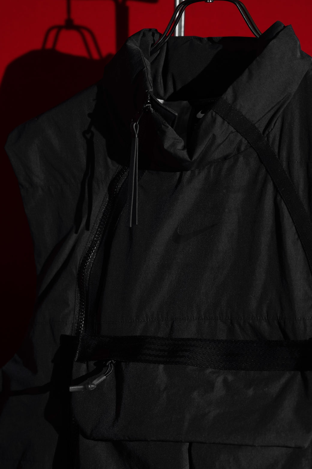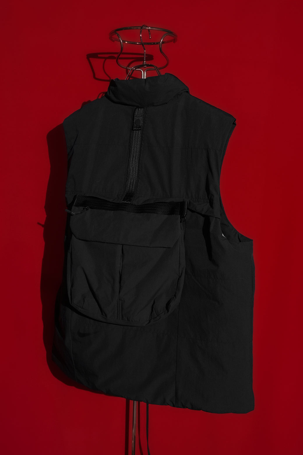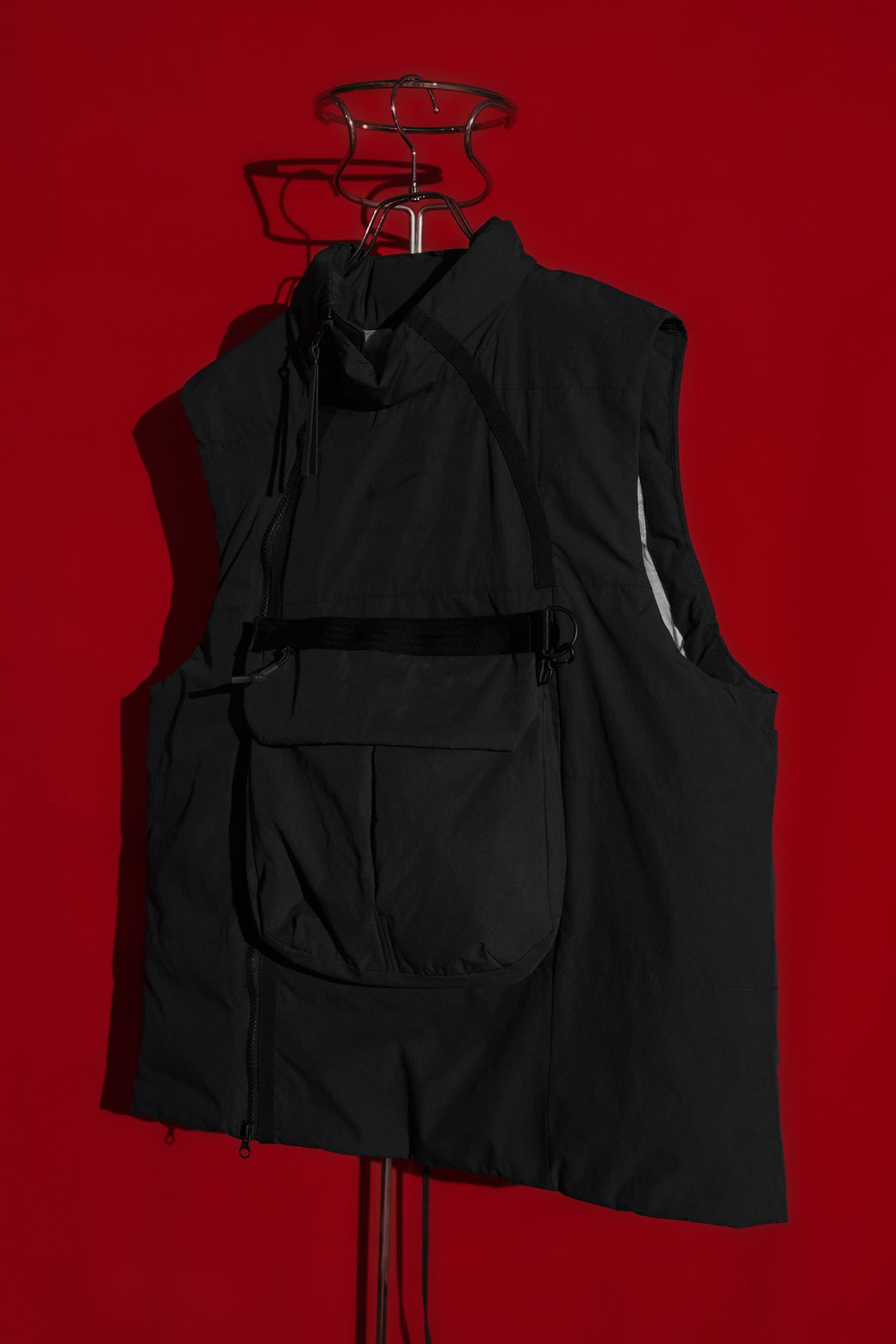 NIKE TECK PACKのマルチな機能性を持つフィルベスト。ショルダーバッグは前後にスナップ式で着脱可能で、インナーはリサイクル素材が使用されたマーブル模様。良好なコンディション。