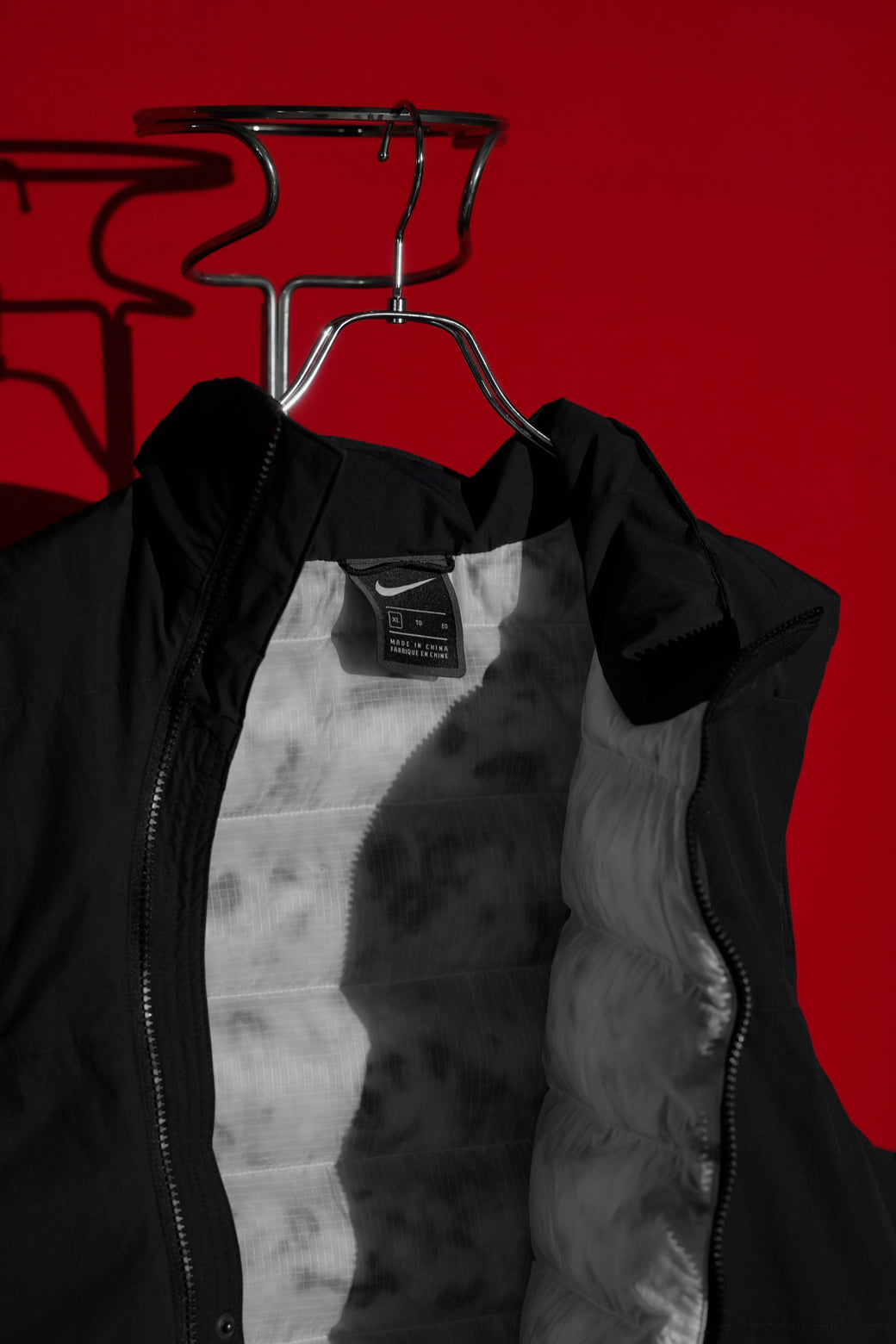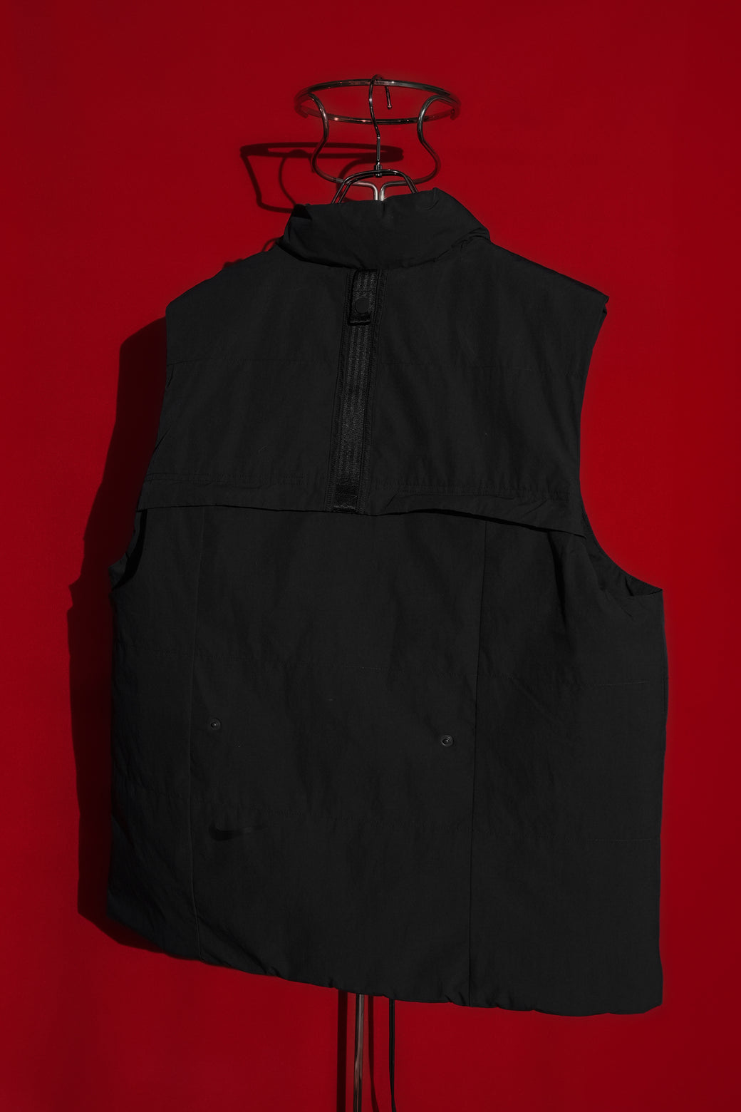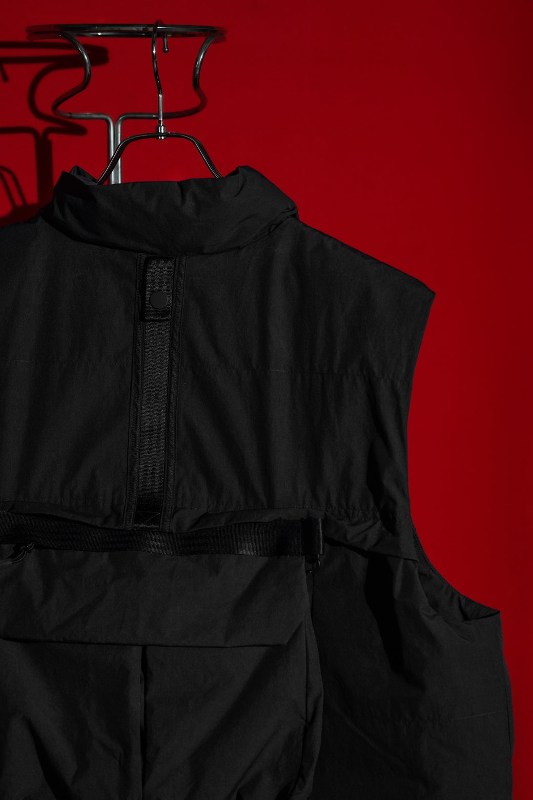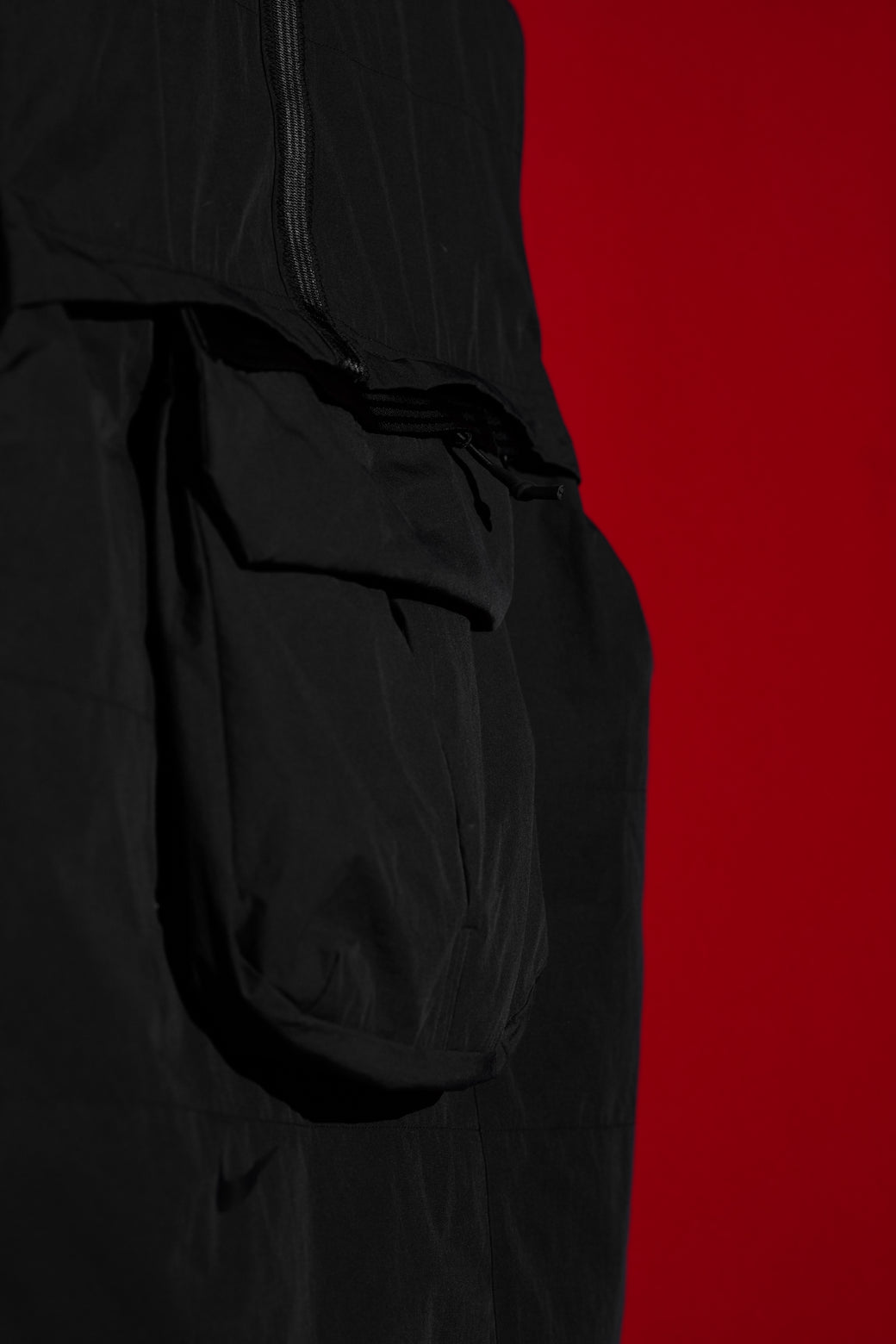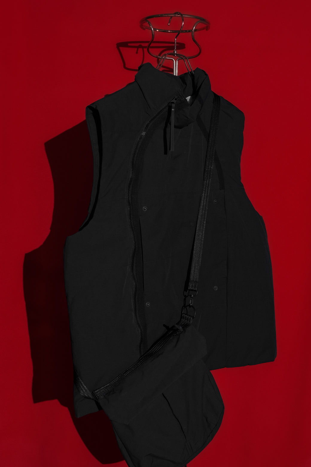 NIKE TECK PACKのマルチな機能性を持つフィルベスト。ショルダーバッグは前後にスナップ式で着脱可能で、インナーはリサイクル素材が使用されたマーブル模様。良好なコンディション。