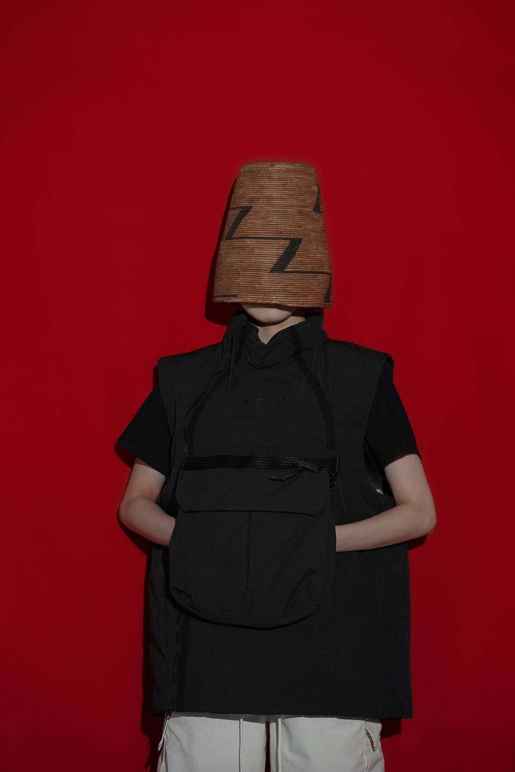 This is the Nike Tech Pack Fillbest, featuring versatile functionality. The shoulder bag attaches and detaches with snaps at the front and back, while the inner lining features a marble pattern made from recycled materials. It is maintained in excellent condition.