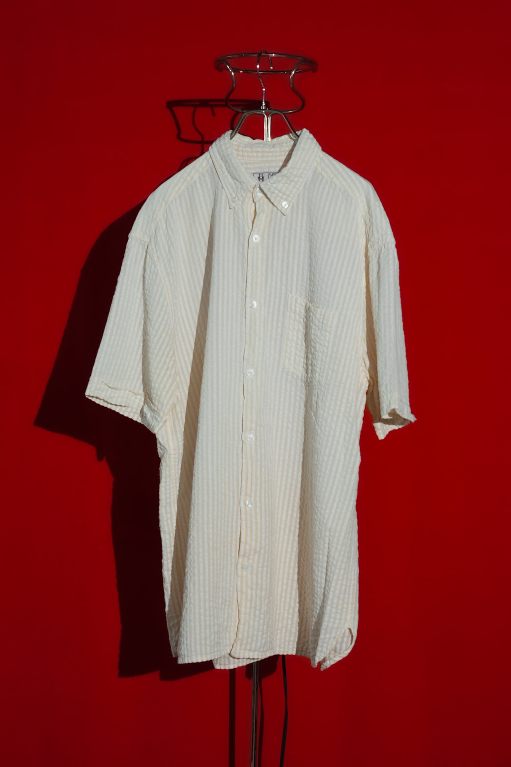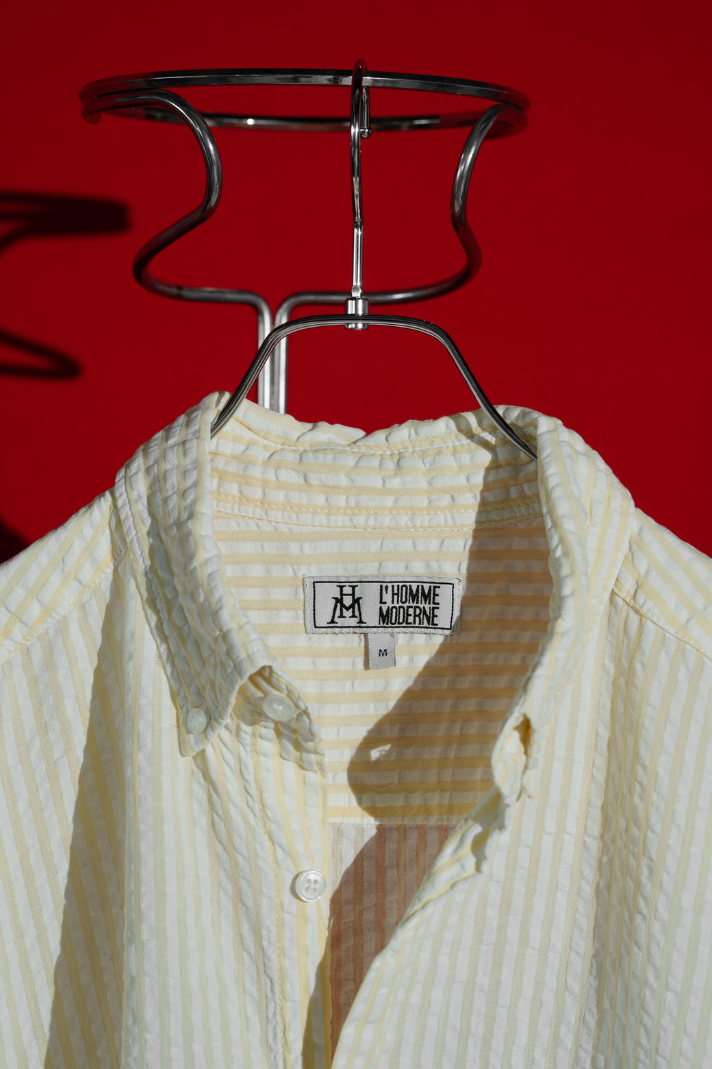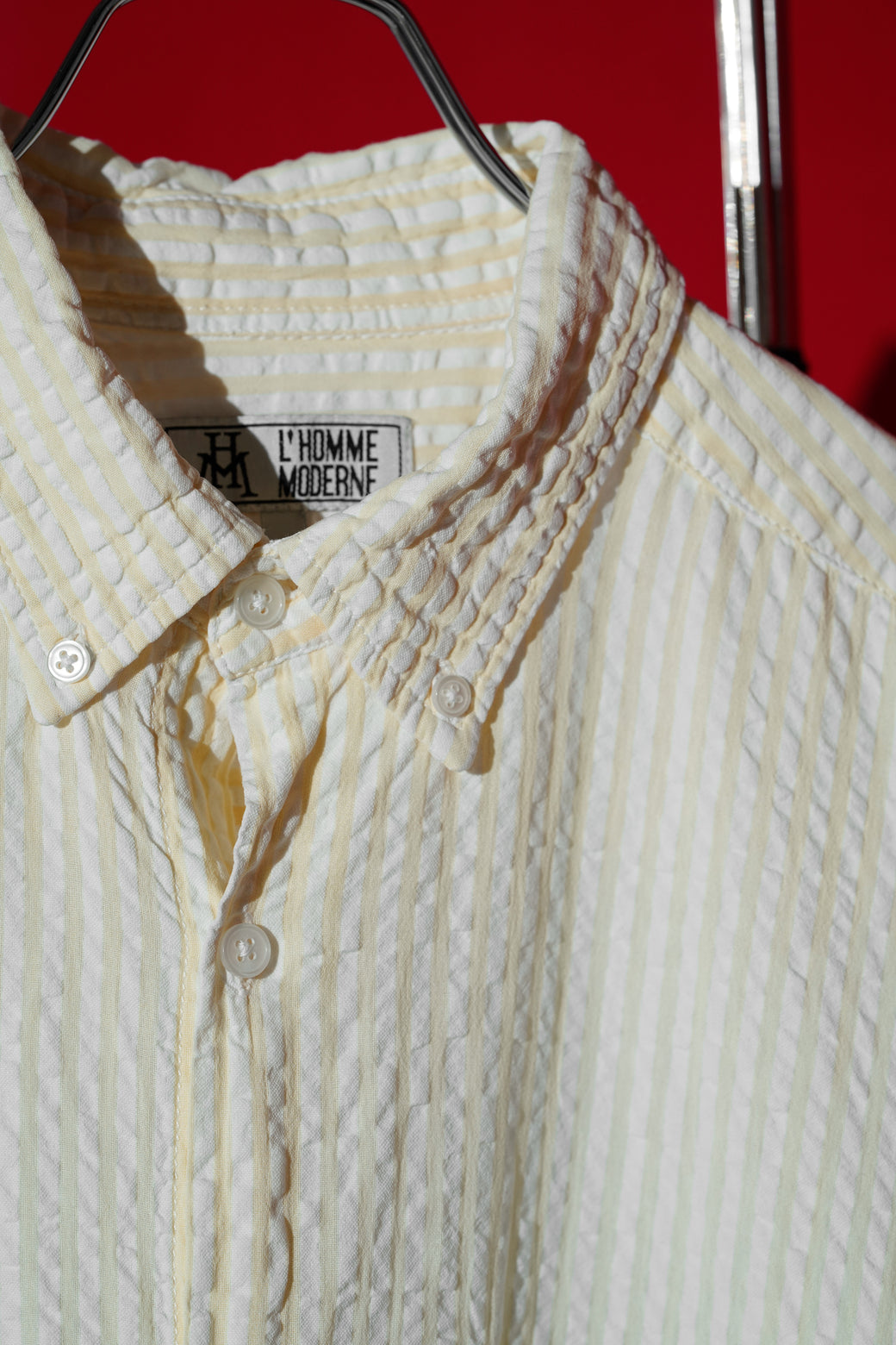 フランス発祥のブランドである「L'HOMME MODERNE」のシアサッカーのボタンダウンシャツ。経年による適切な風合いを伴った良好なコンディション。