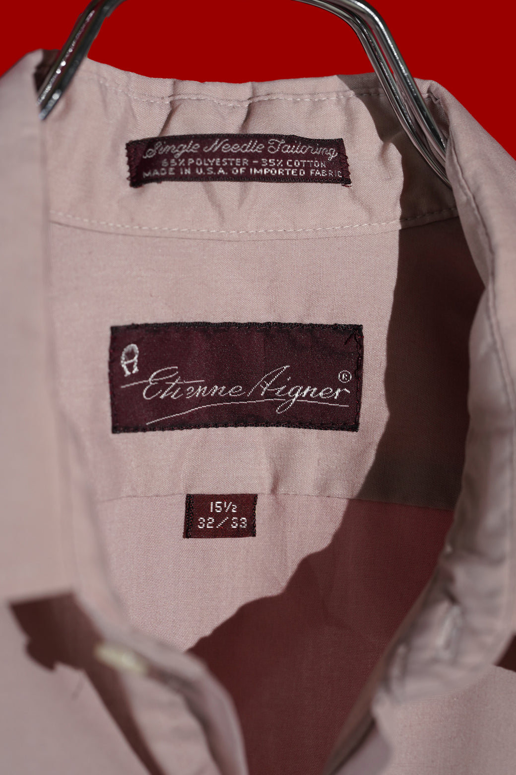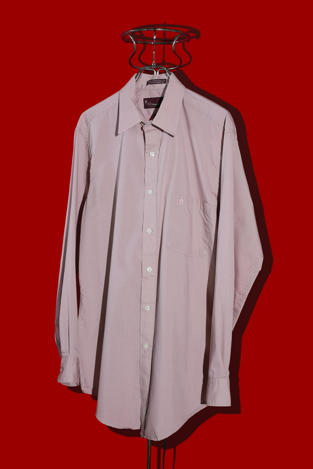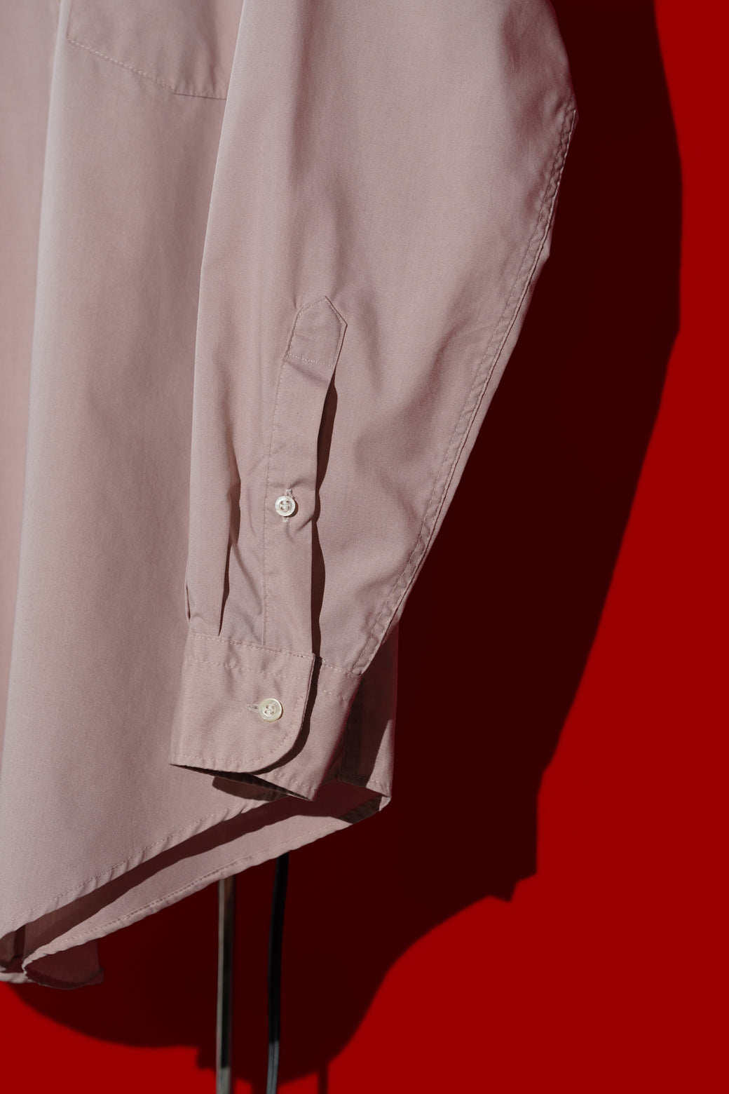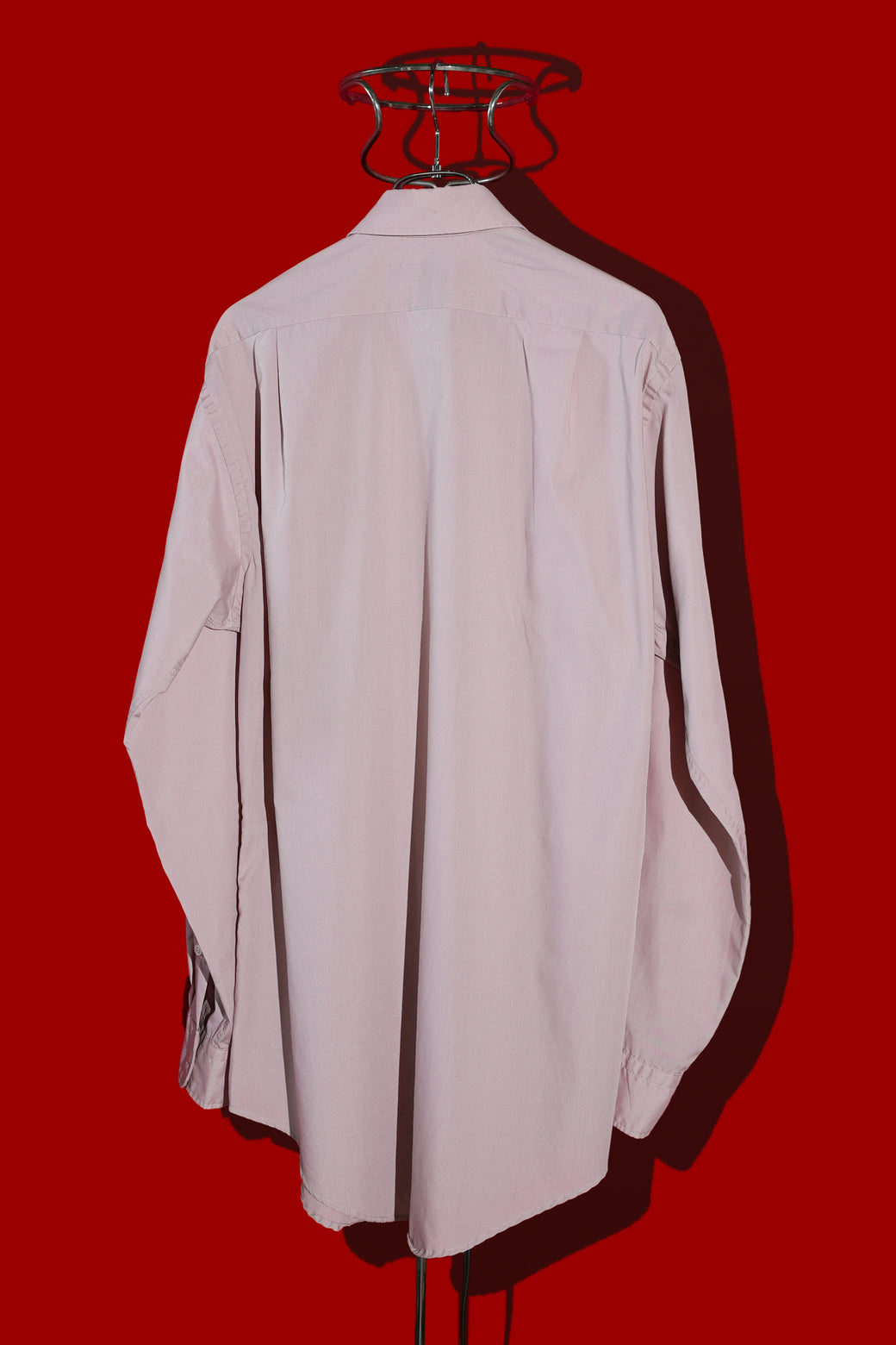 淡いピンクのスタンダードなトラッドシャツ。経年による適切な風合いを伴い良好なコンディションを維持。胸ポケット部に小さなシミあり。
