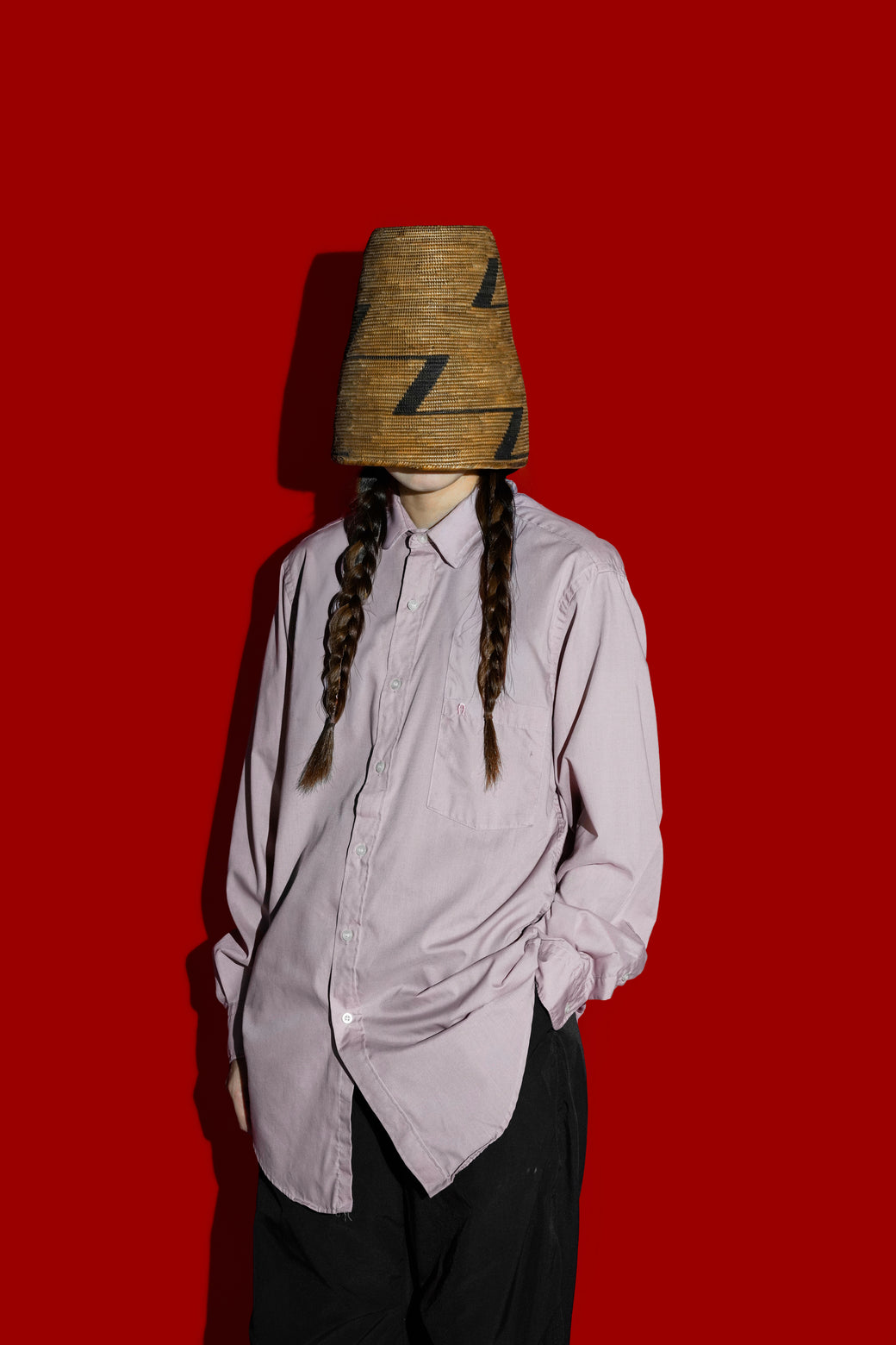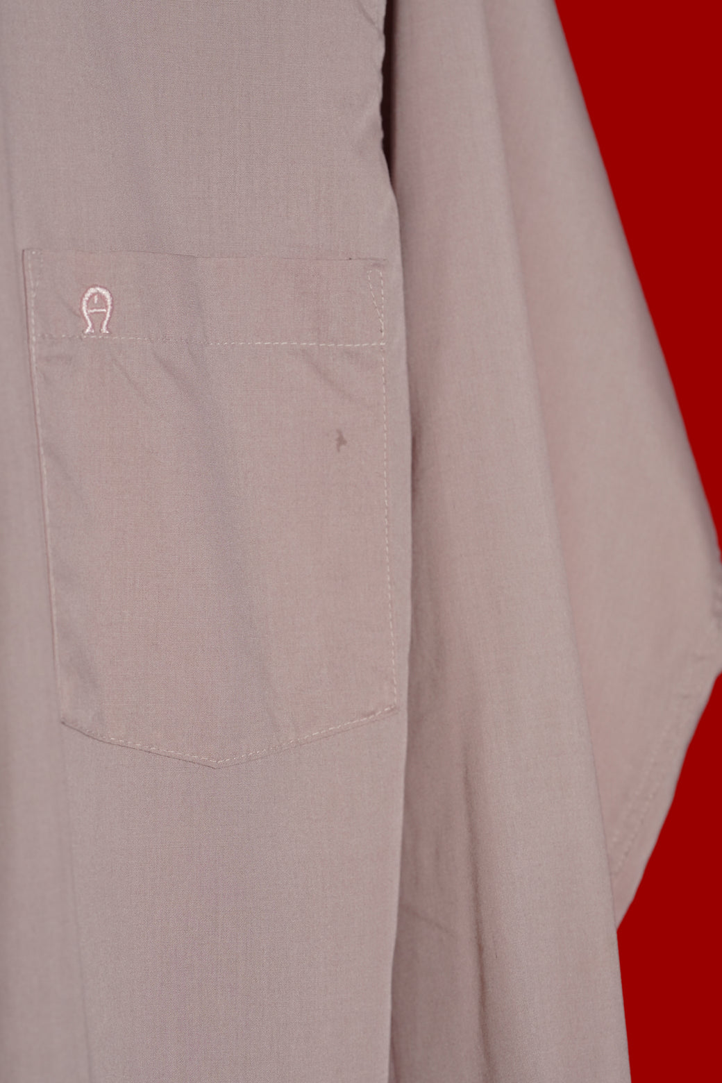 This is a standard traditional shirt in a soft pink. It maintains good condition with an appropriate aged patina. There is a small stain on the chest pocket.