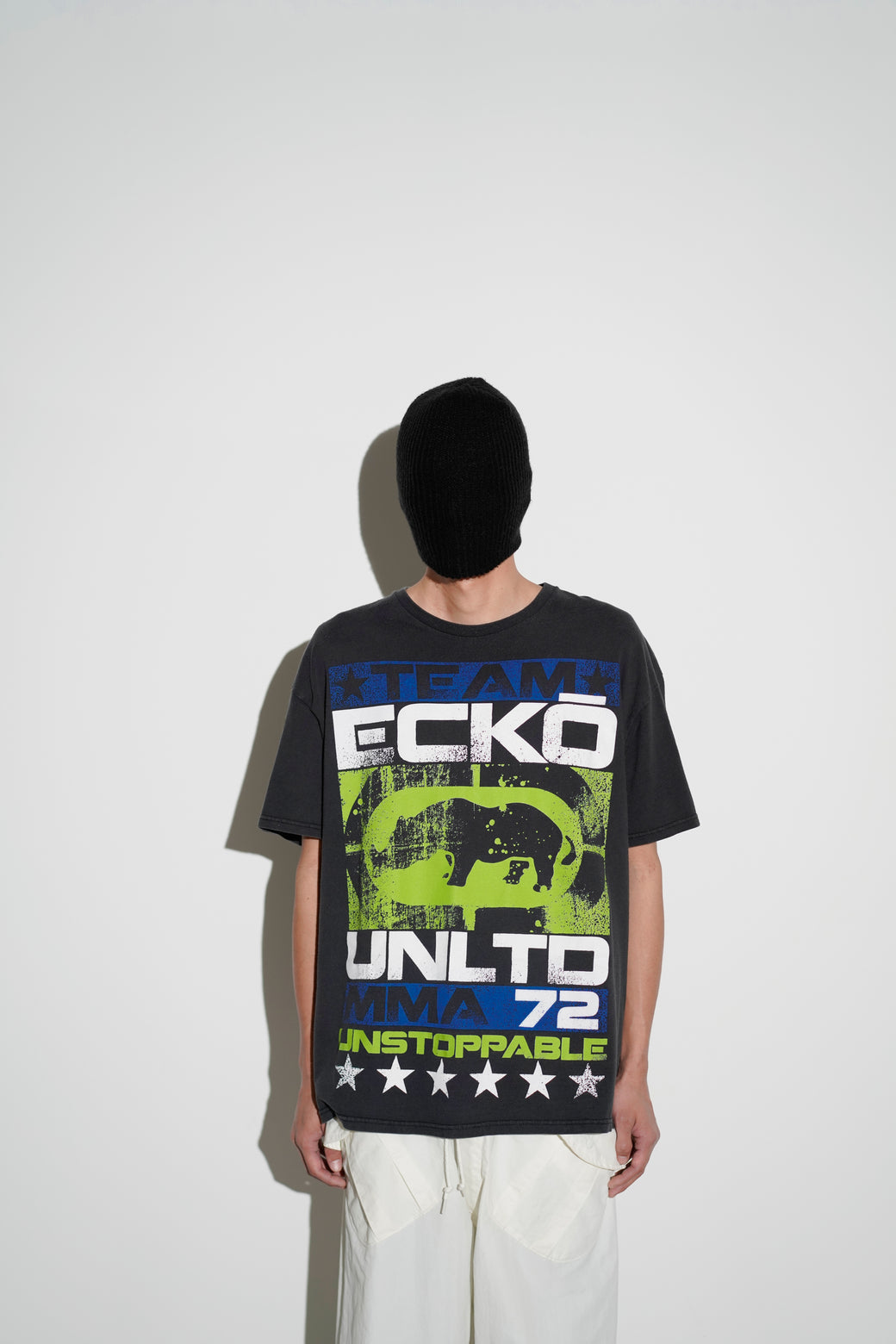 This is a T-shirt from the 2000s “Ecko Unltd.” collection. Featuring graphics prominently showcasing mixed martial arts culture, such as ‘MMA’ and “UNSTOPPABLE.” It is in good condition with an appropriate aged look.