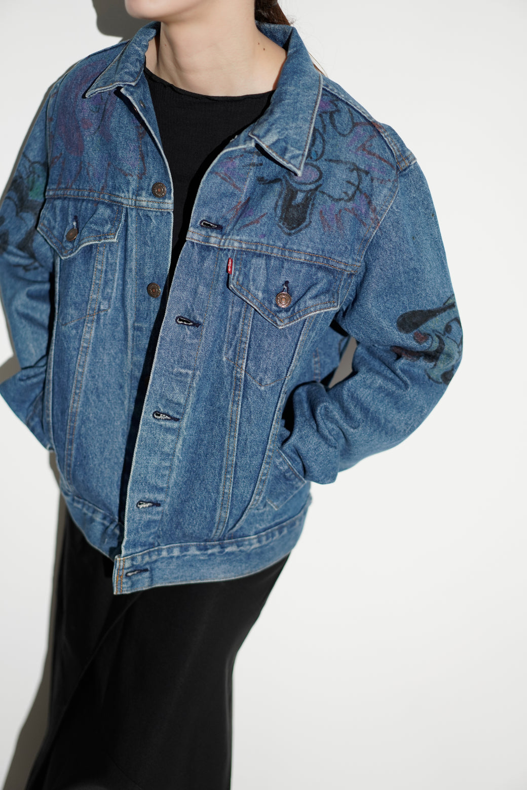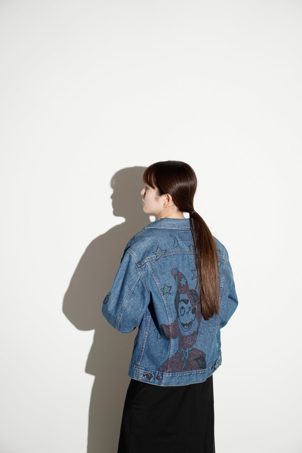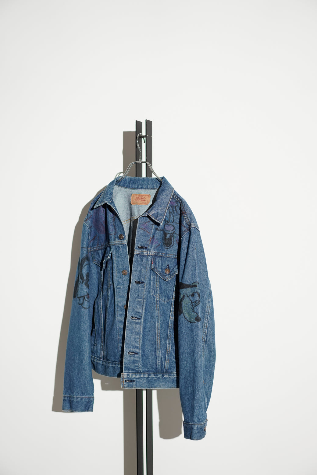 1990年代の"Levi’s" のグラフィティデニムジャケット。USAメイドの「70506-0216」 をベースに、背面・袖・フロントにもミッキーキャラクターが施されたハンドペイントカスタム。デニムの経年と手描きの褪色が調和してアートピースとしての希少性はあるが、ノリで着用したいピース。経年による適切な風合いを伴った良好なコンディション。