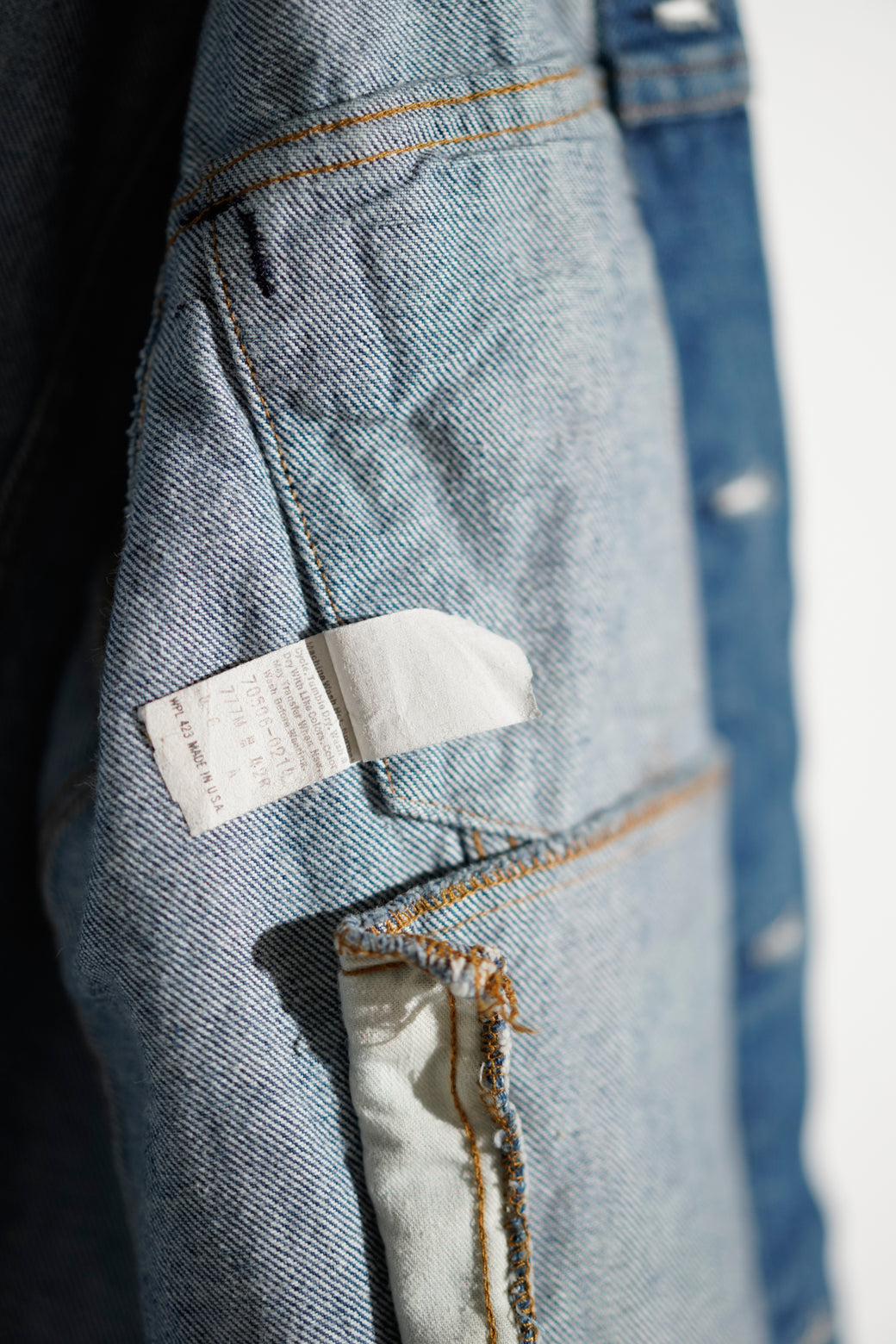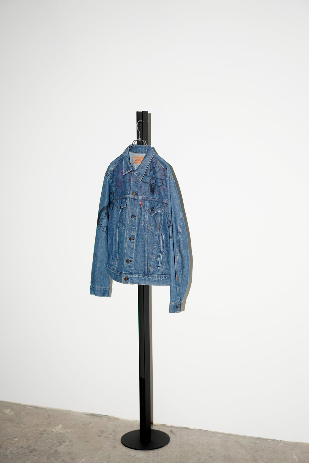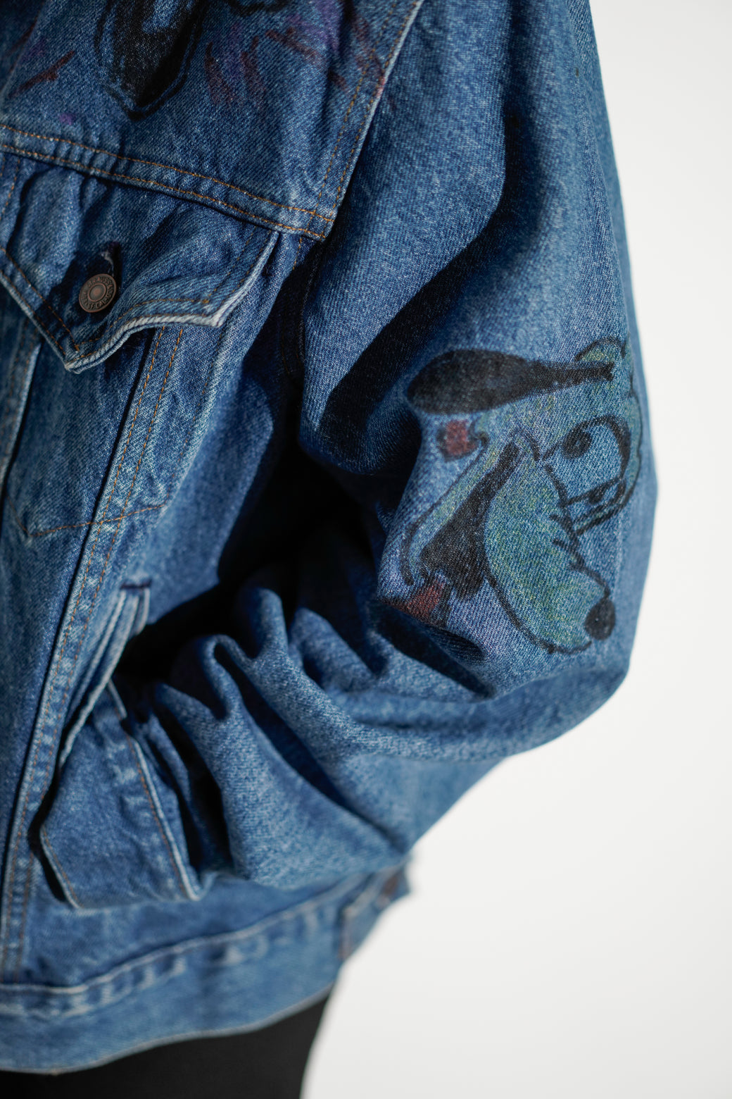 1990年代の"Levi’s" のグラフィティデニムジャケット。USAメイドの「70506-0216」 をベースに、背面・袖・フロントにもミッキーキャラクターが施されたハンドペイントカスタム。デニムの経年と手描きの褪色が調和してアートピースとしての希少性はあるが、ノリで着用したいピース。経年による適切な風合いを伴った良好なコンディション。
