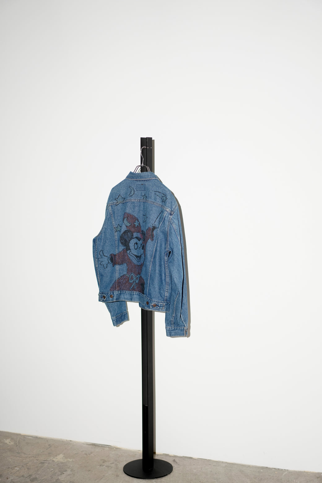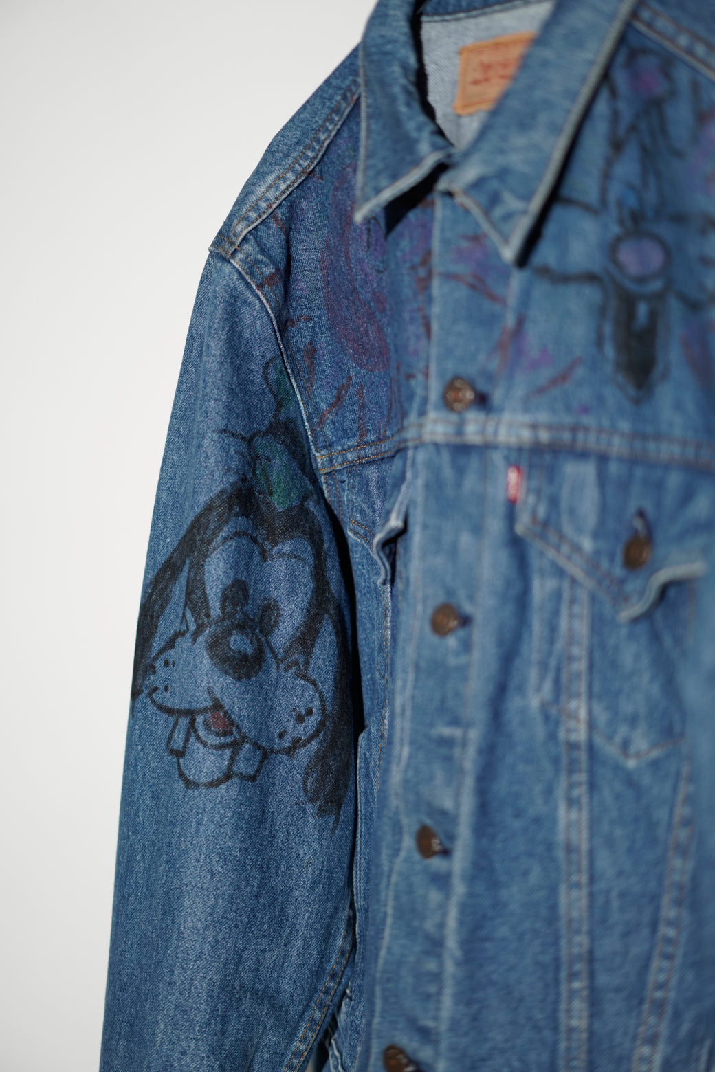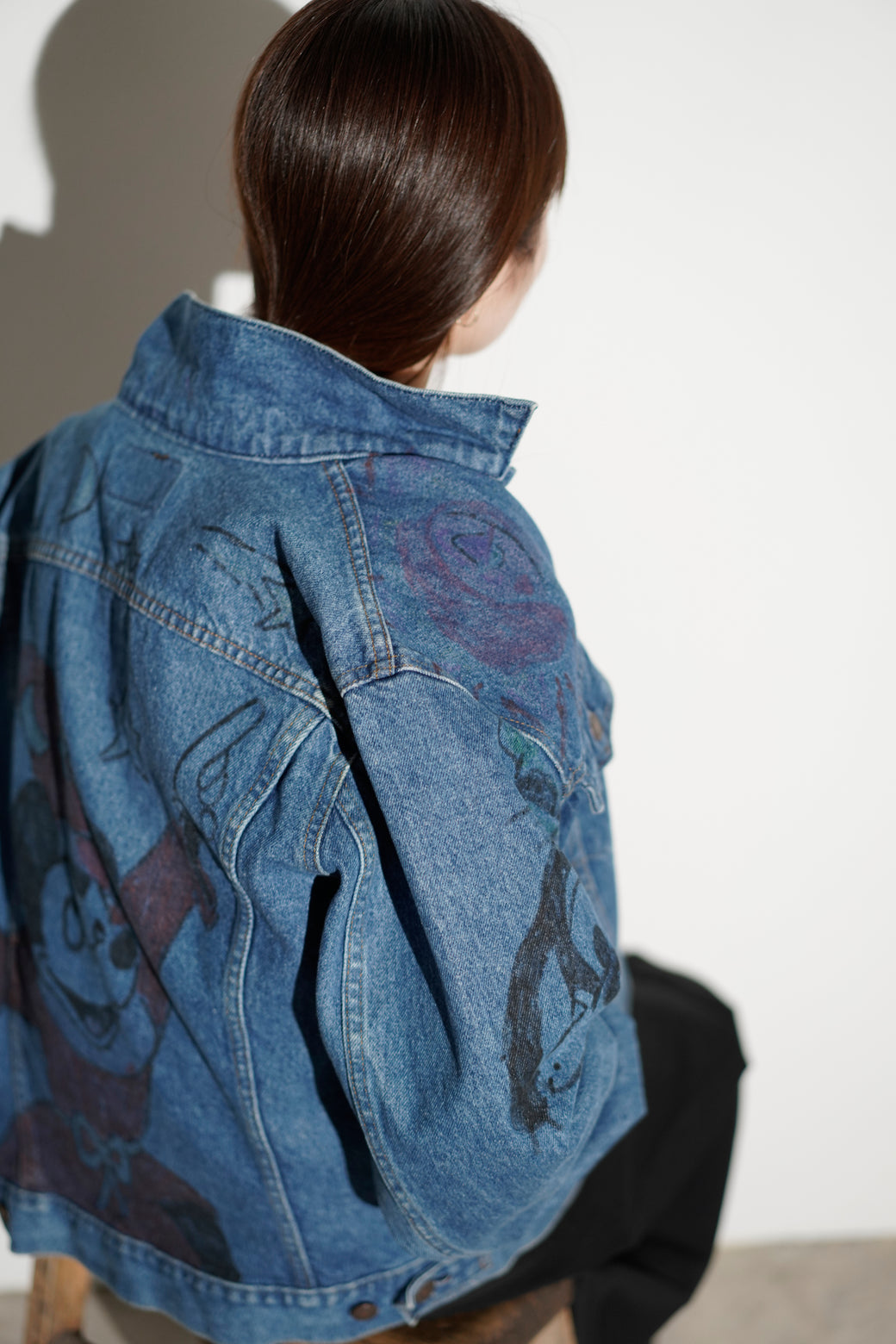 This is a 1990s “Levi’s” graffiti denim jacket. Based on the “70506-0216” model, it features hand-painted Mickey Mouse characters on the back, sleeves, and front. The harmonious blend of the denim's aging and the fading of the hand-painted details gives it high value as an art piece, yet it's a piece you'll want to wear casually. It's in good condition with an appropriate aged look.
