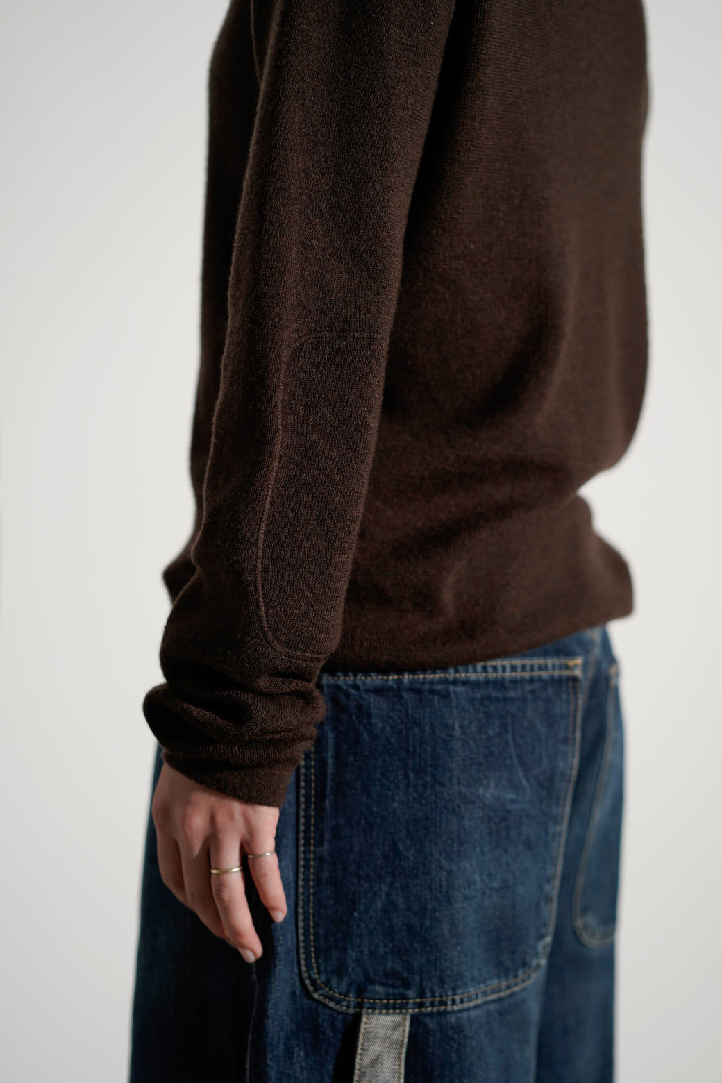 This is a Banana Republic mock neck sweater. It features a 5-button henley placket, is made from smooth merino wool, and has elbow patches on the sleeves. It is in good condition with appropriate aging characteristics.