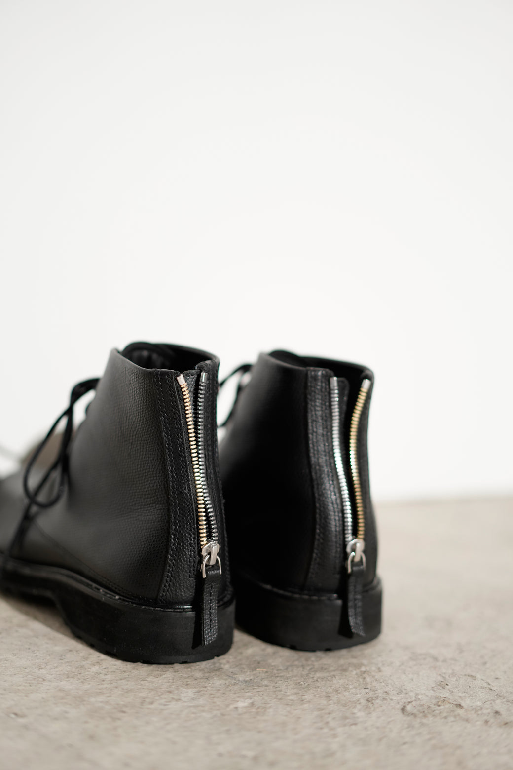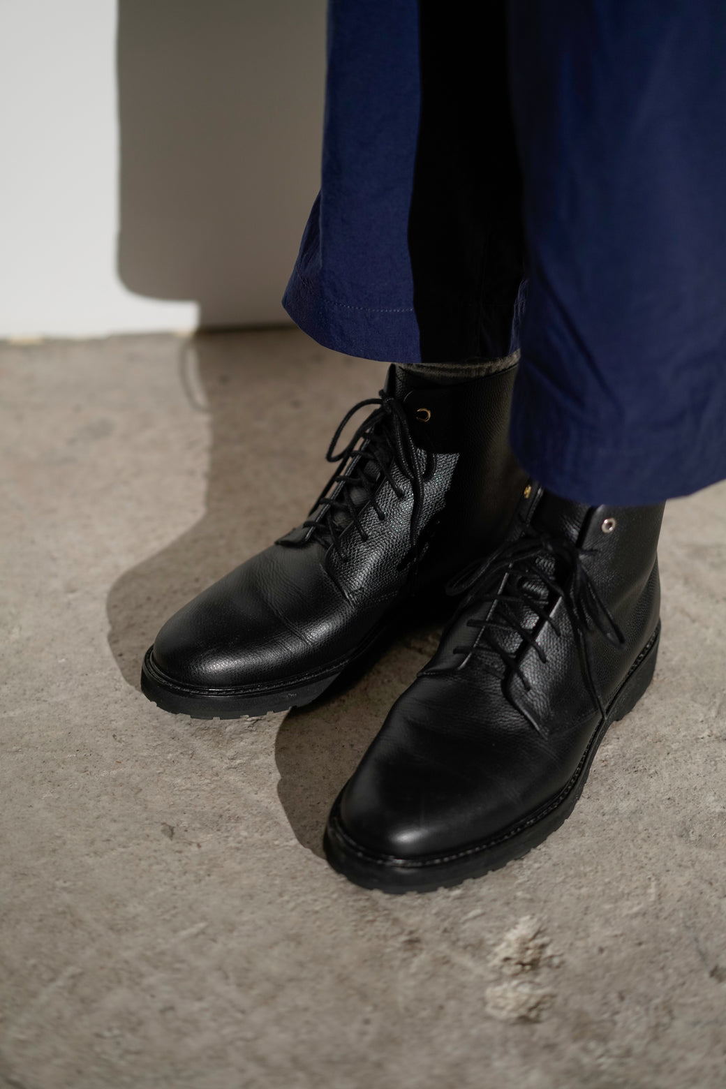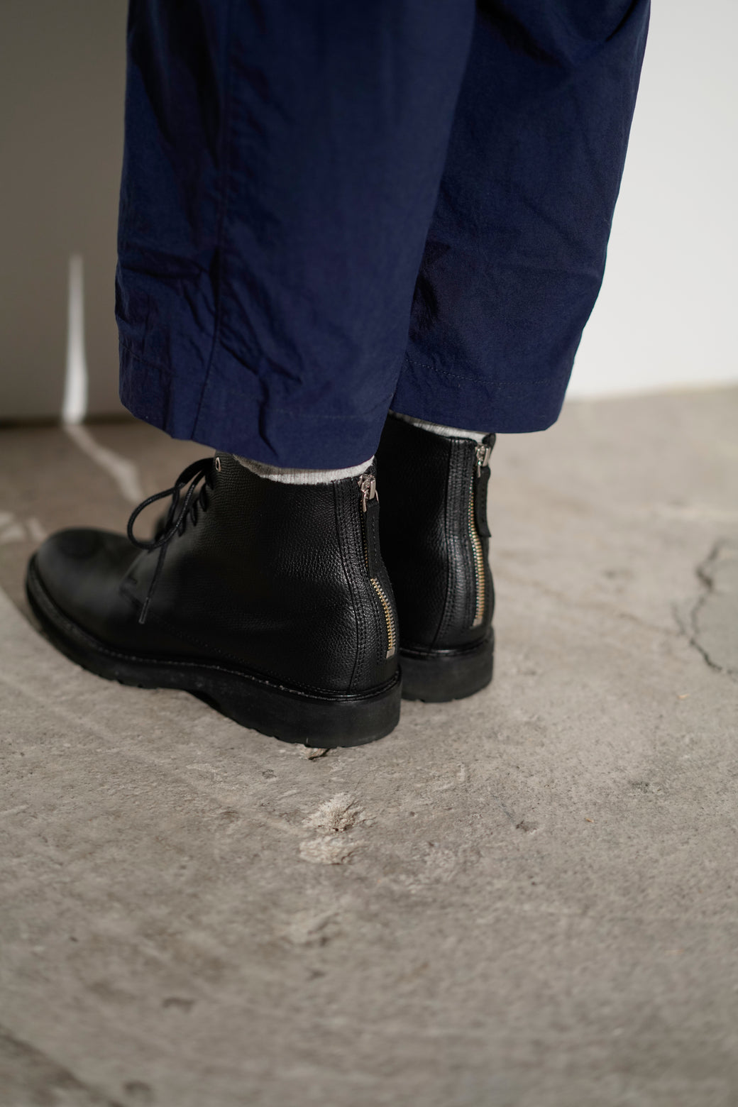 These are lace-up boots with a plain toe. Featuring a slim plain toe, the upper is made of shibori leather and includes a back zipper. It is in good condition with appropriate aging characteristics.