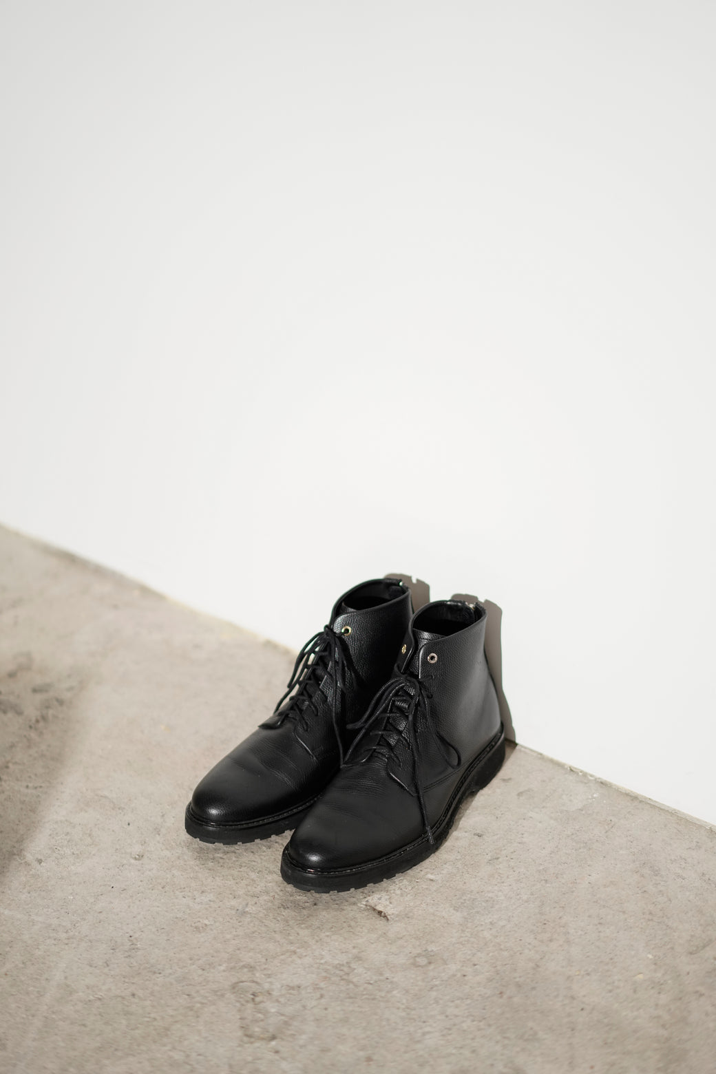 プレーントゥのレースアップブーツ。スリムなプレーントゥにアッパーはシボレザー、バックジップ付き。経年による適切な風合いを伴った良好なコンディション。