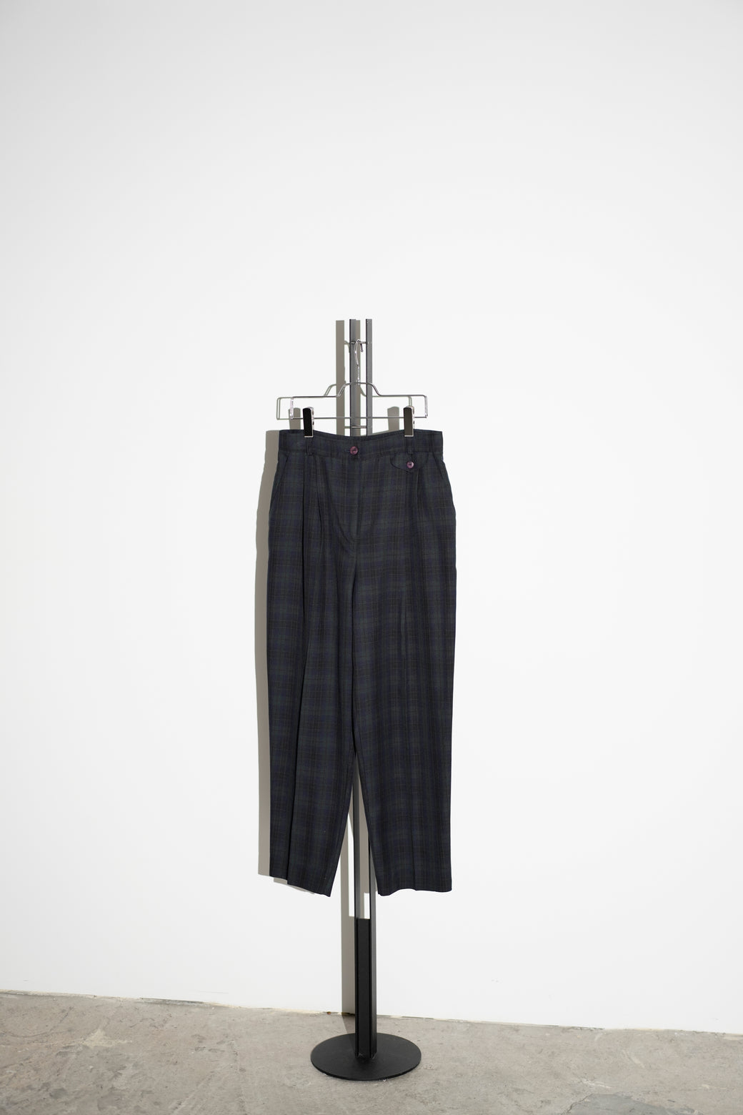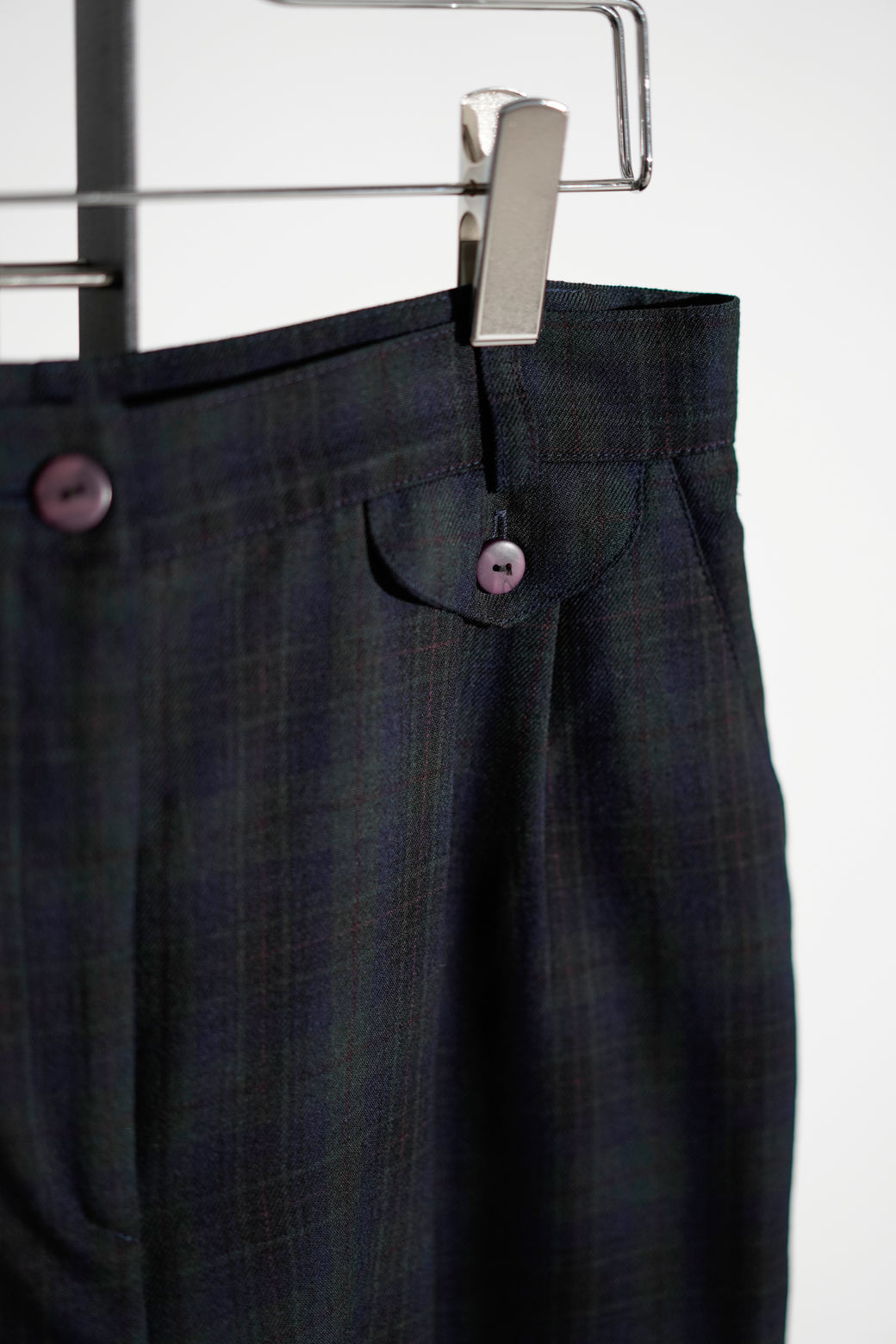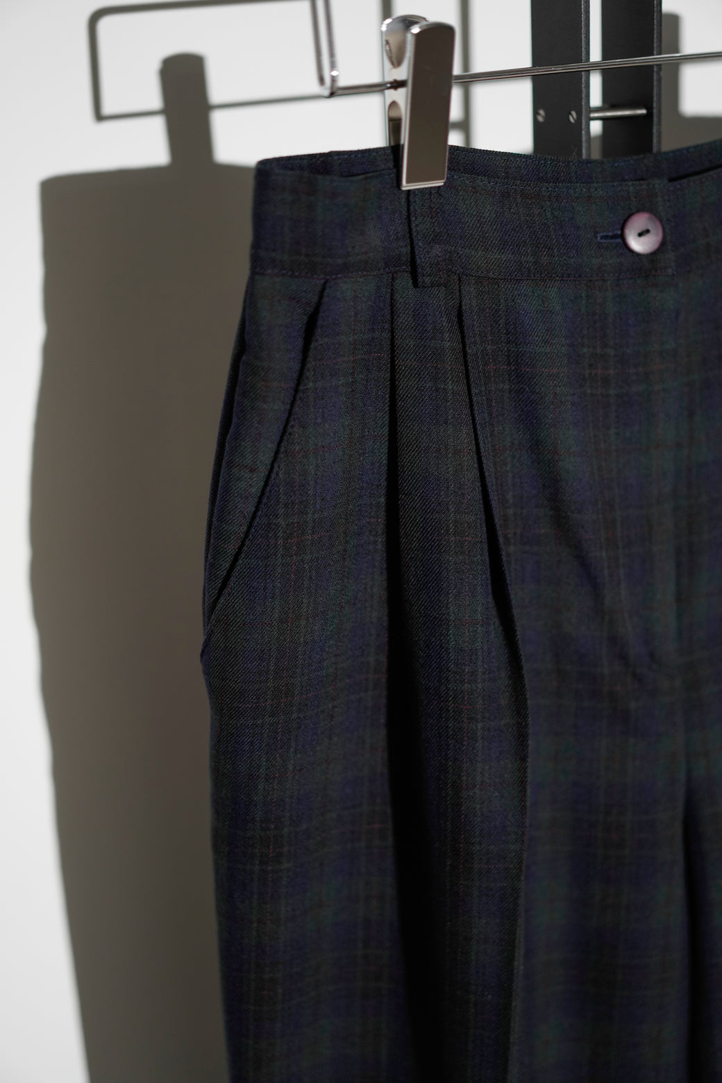 1990年代のチェック柄スラックス。深めのツータック仕様によるゆとりのある腰回りで、クラシックなドレスパンツの構造。経年による適切な風合いを伴った良好なコンディション。