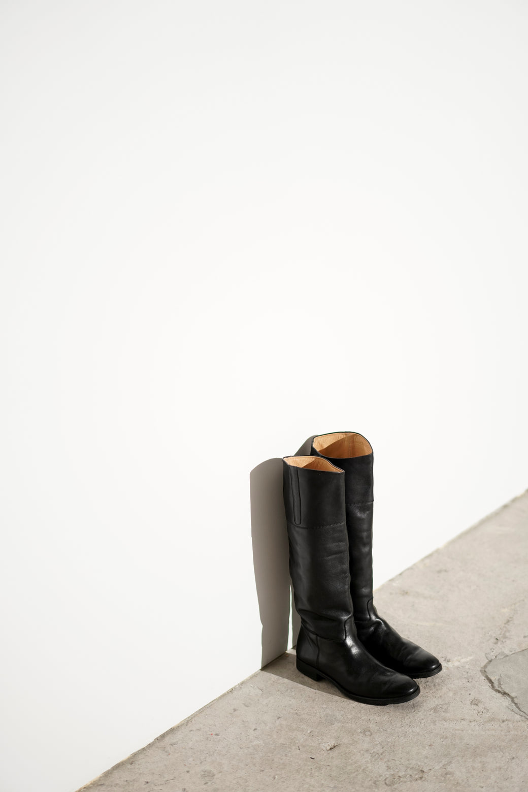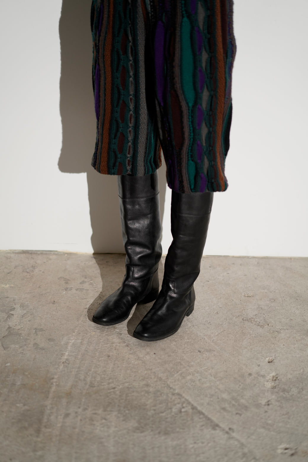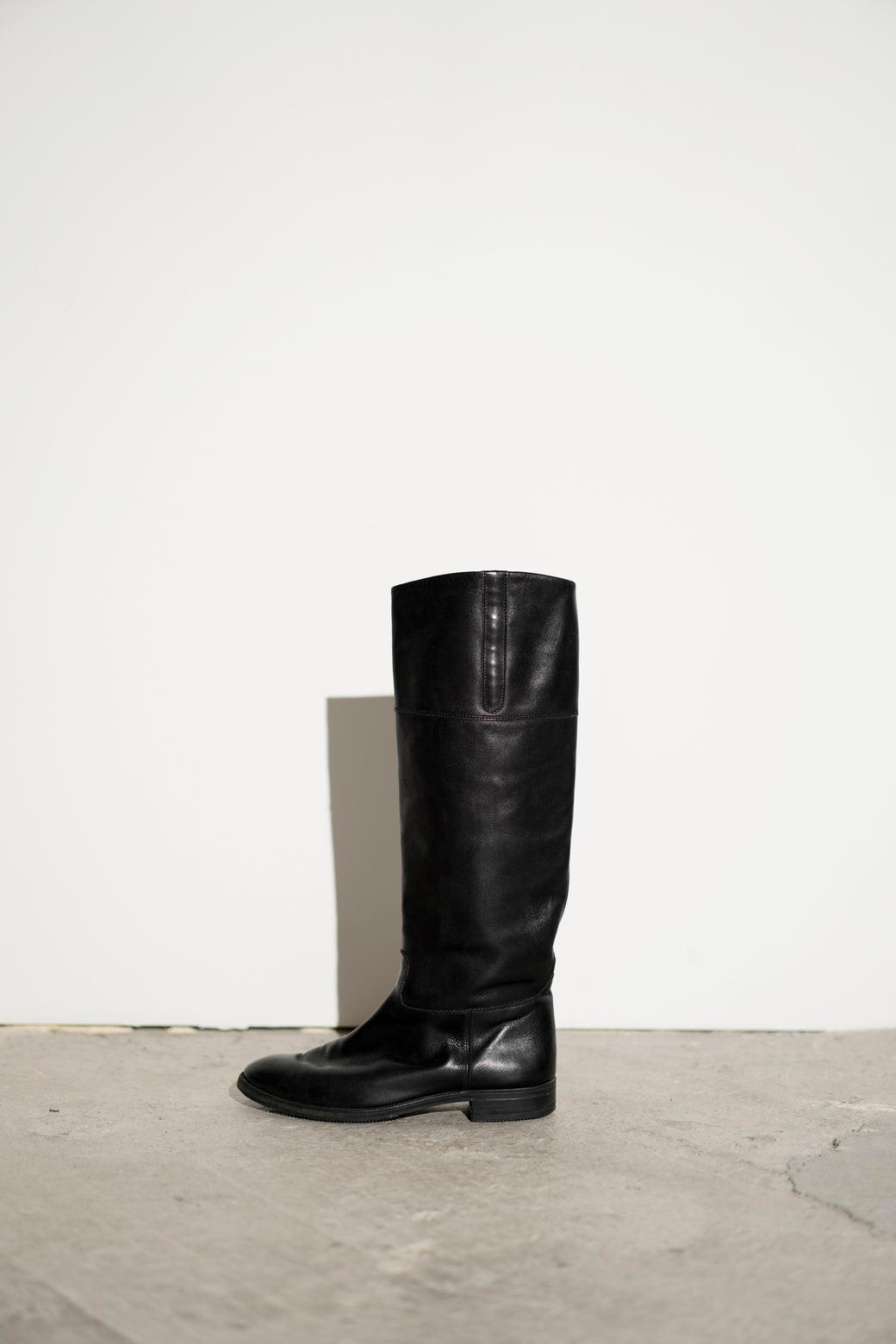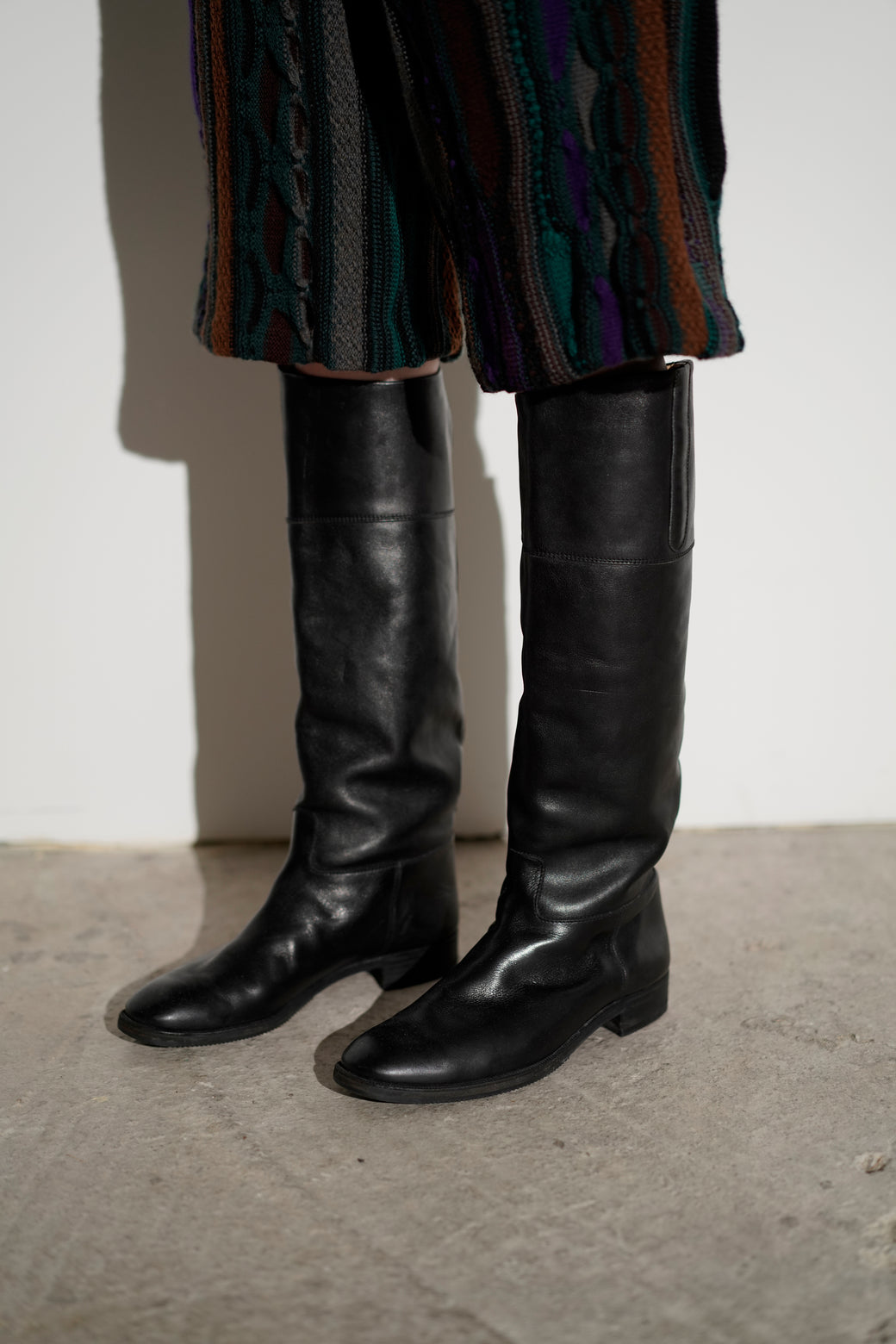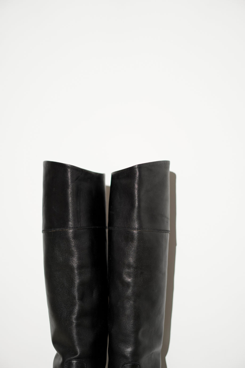 柔らかなレザーを使用したレザーロングブーツ。程よい太さとローヒール、シンプルなデザインで汎用性の高い一足。経年による適切な風合いを伴った良好なコンディション。