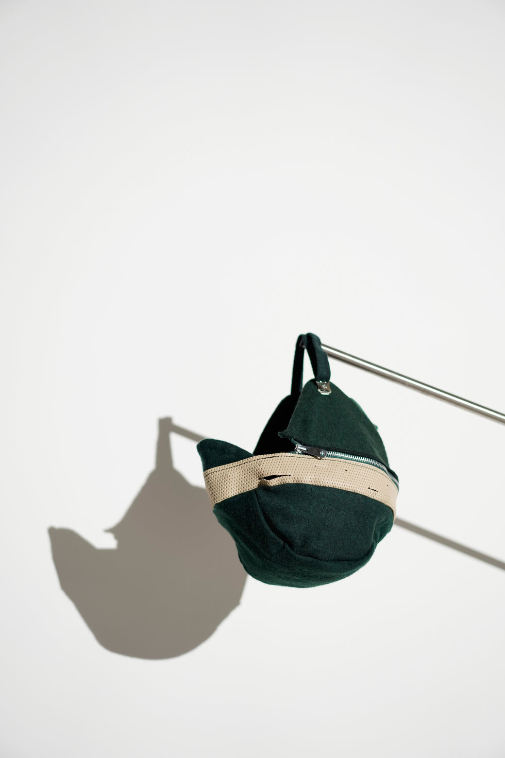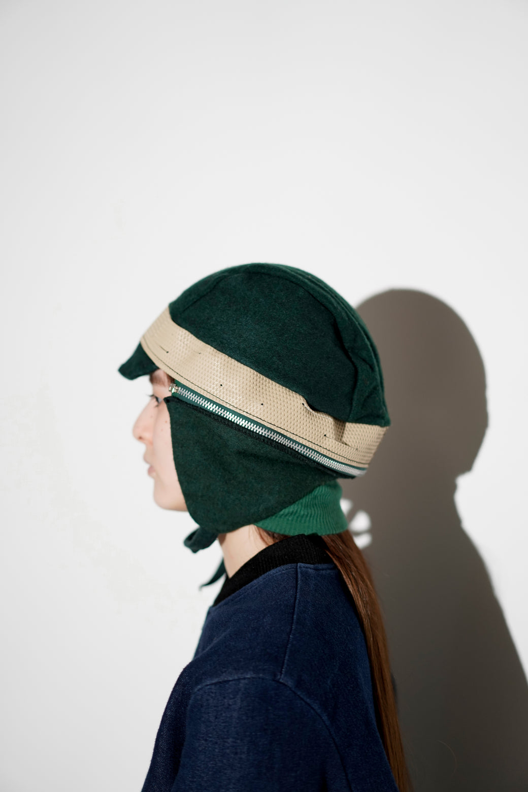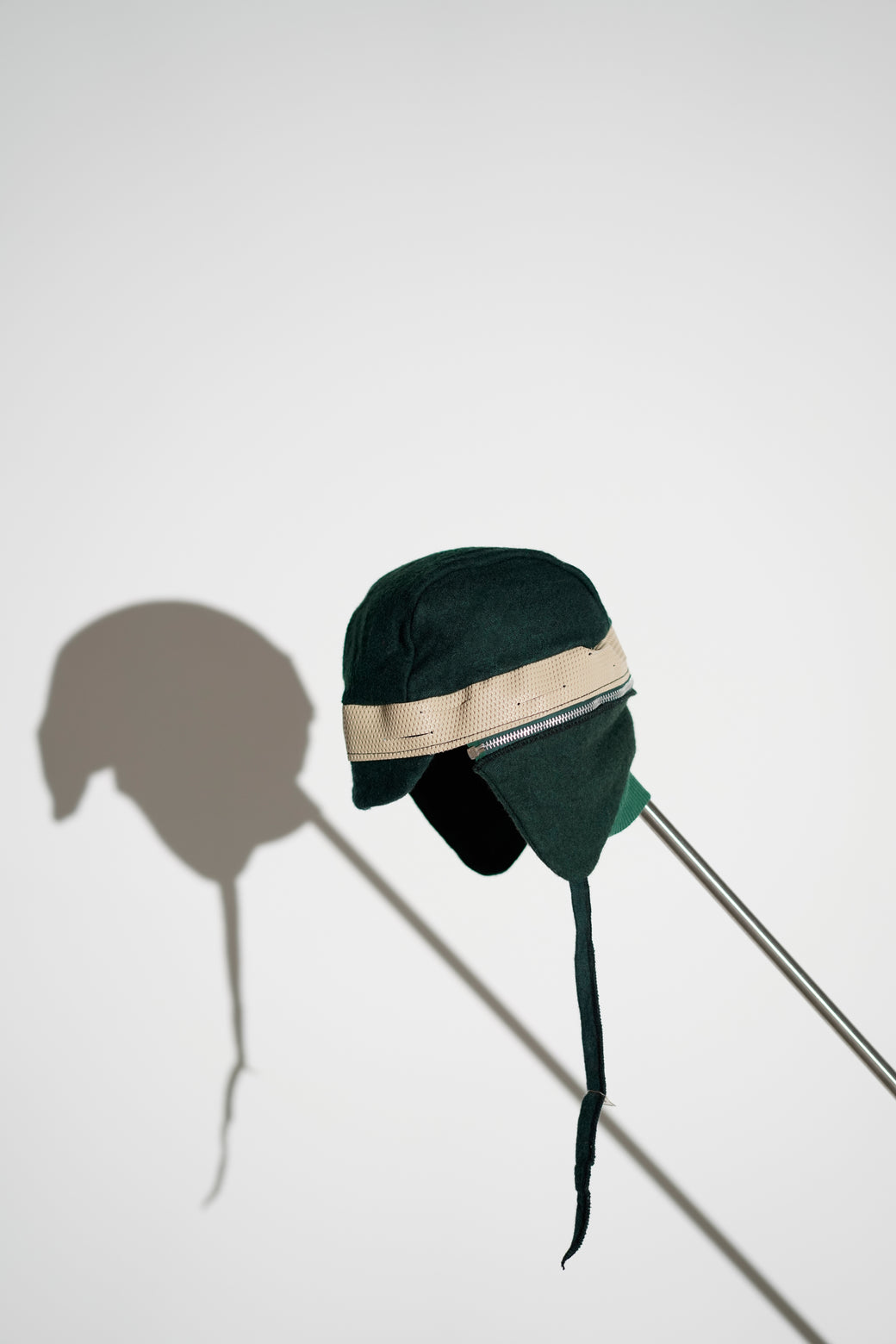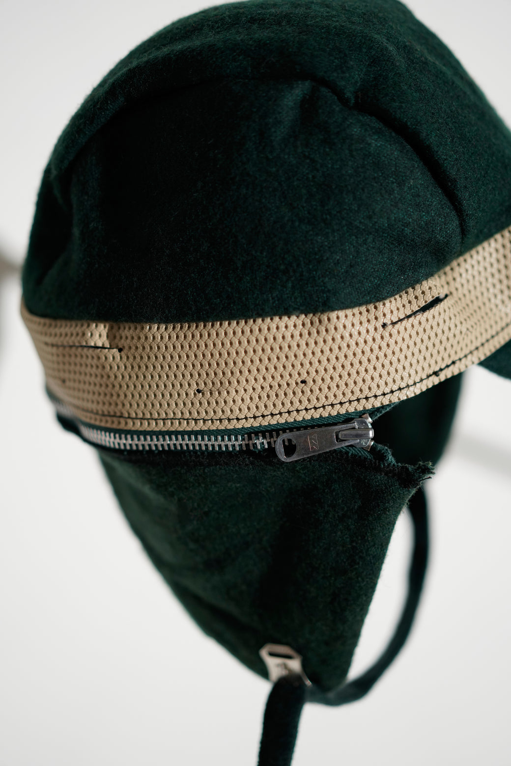 This is a wool earflap cap manufactured by “Safe-T-Clothing” in the 1990s. An outstanding design combining different material textures (wool x cotton x rubber). A unique archive piece featuring a form and design reminiscent of 1940s military gear. The earflaps are detachable via zippers. It is in good condition with appropriate patina from aging.