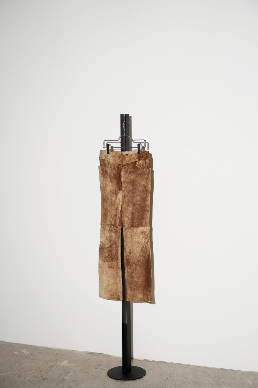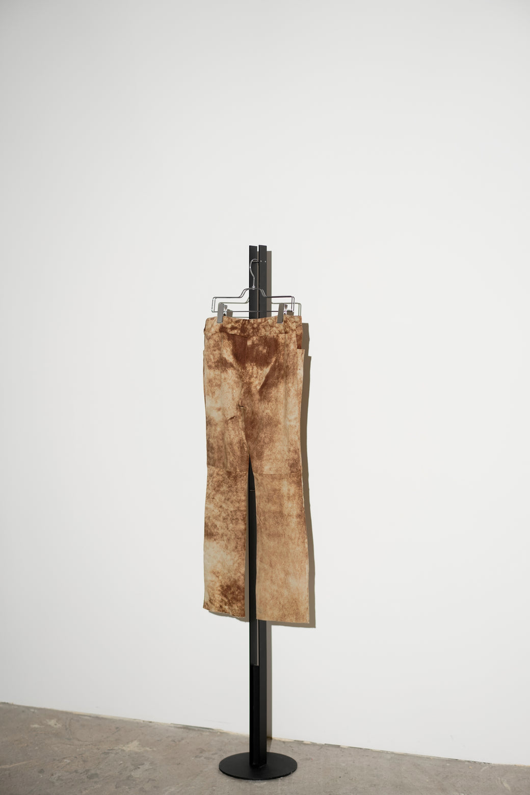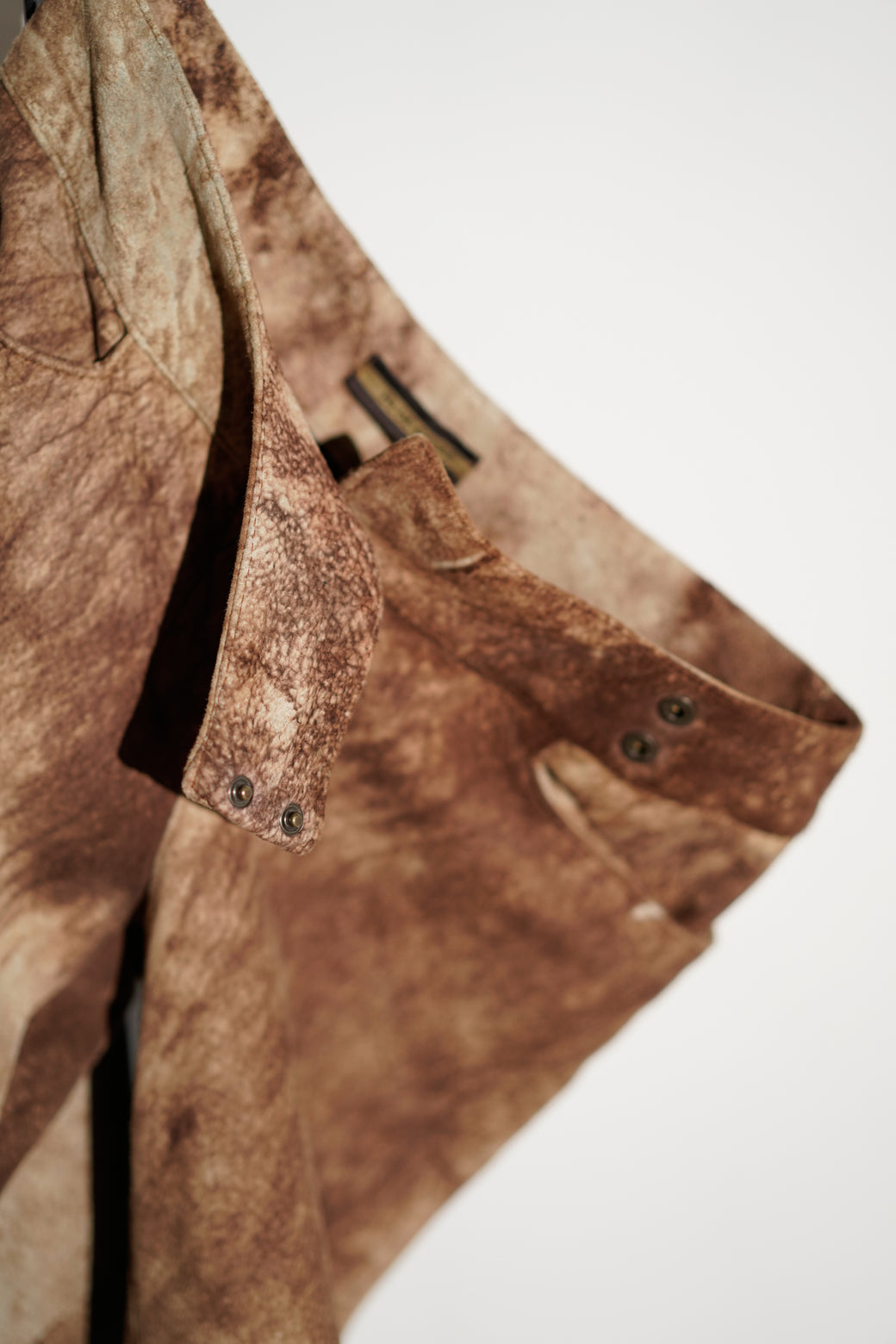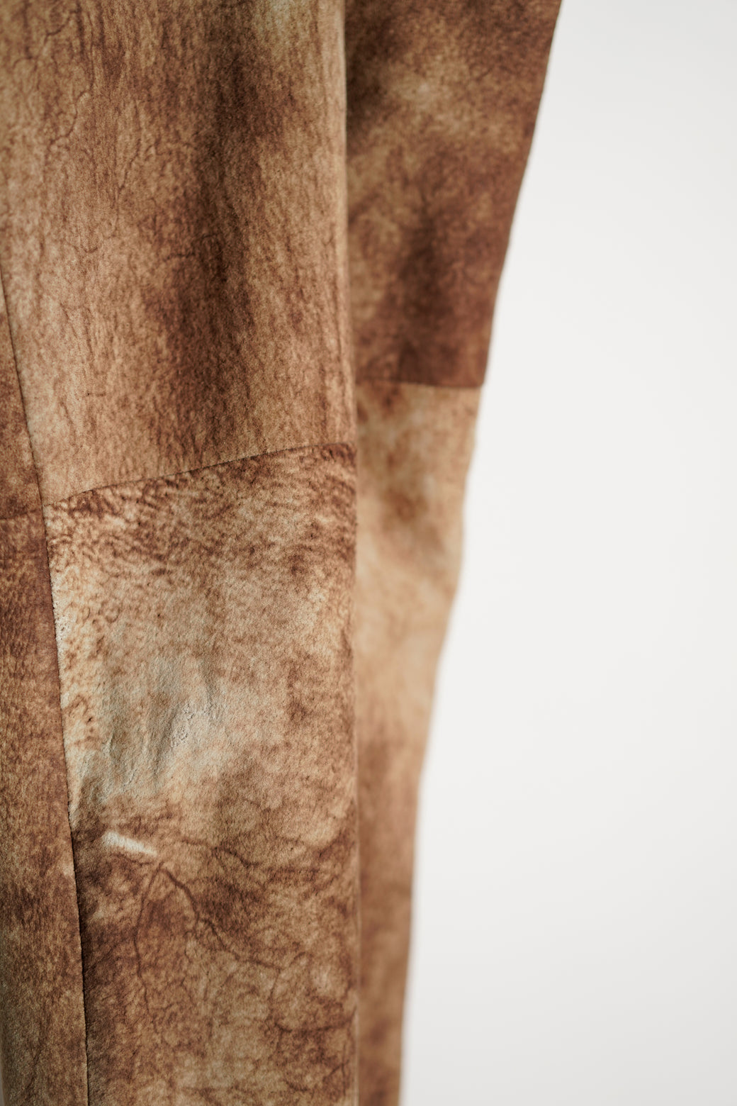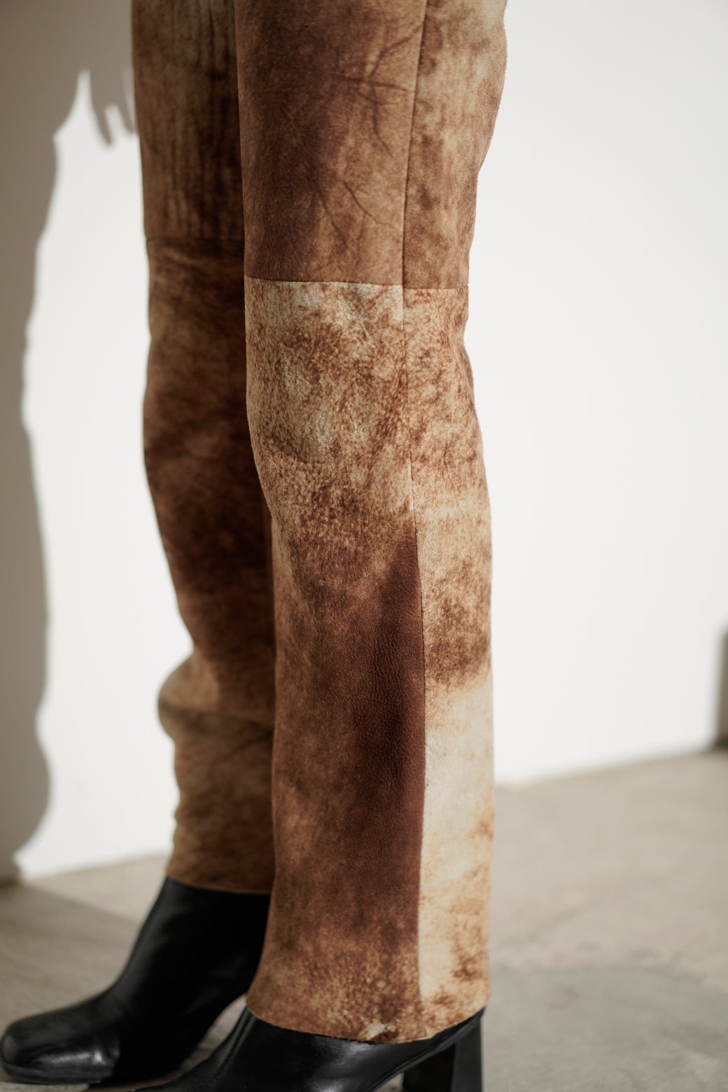 These are low-rise straight-leg pants crafted from genuine suede leather. The leather's unique grain pattern creates a distinctive design through the fabric's cut-and-sewn construction. Featuring a clean, cut-off hem and a streamlined silhouette without back pockets. It is in good condition with appropriate aging characteristics.