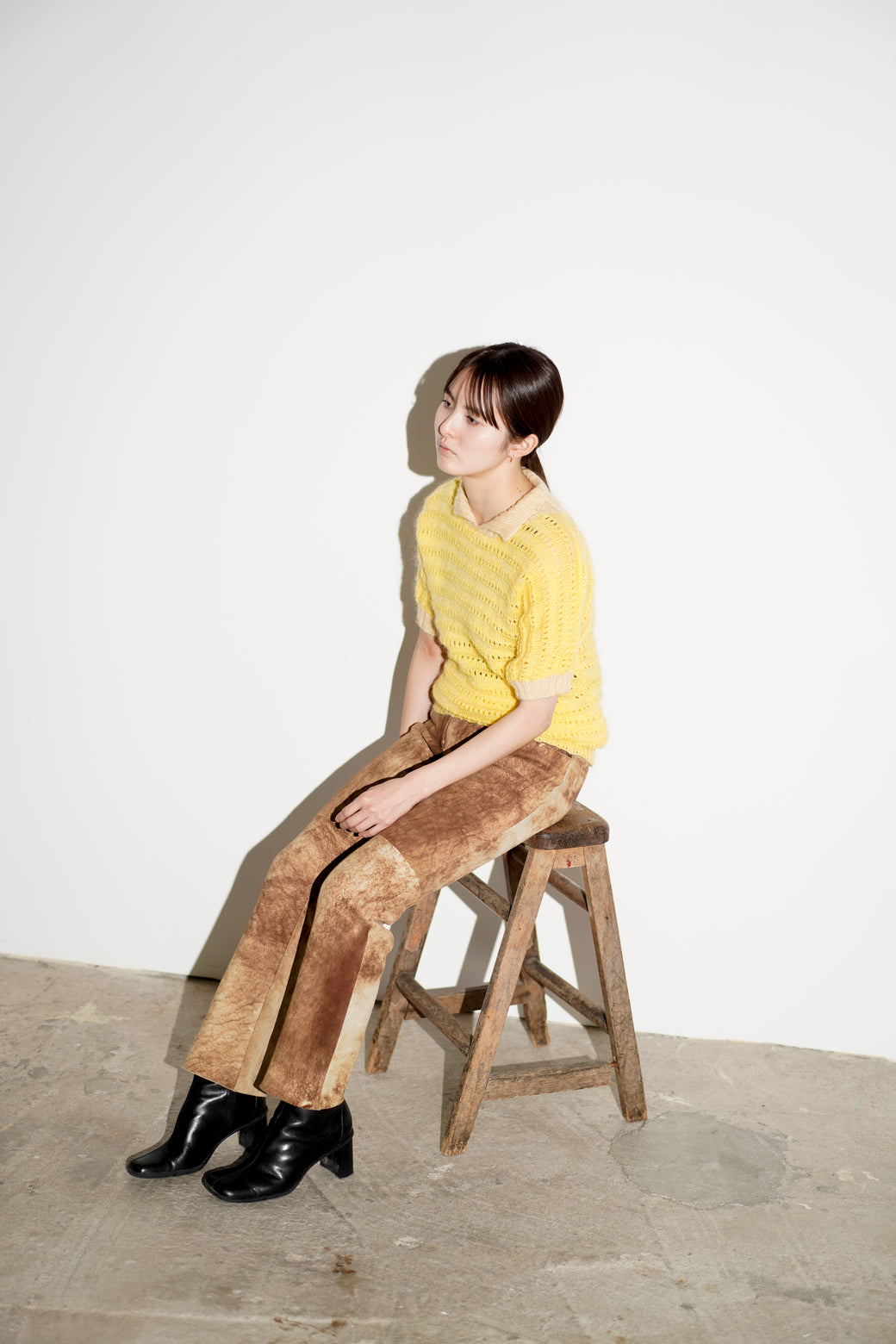 スエードのローライズストレートパンツ。レザー特有の柄が生地合わせの切り返しによって独特なデザインに。裾はカットオフ。バックポケットの無いスッキリとしたシルエット。経年による適切な風合いを伴った良好なコンディション。