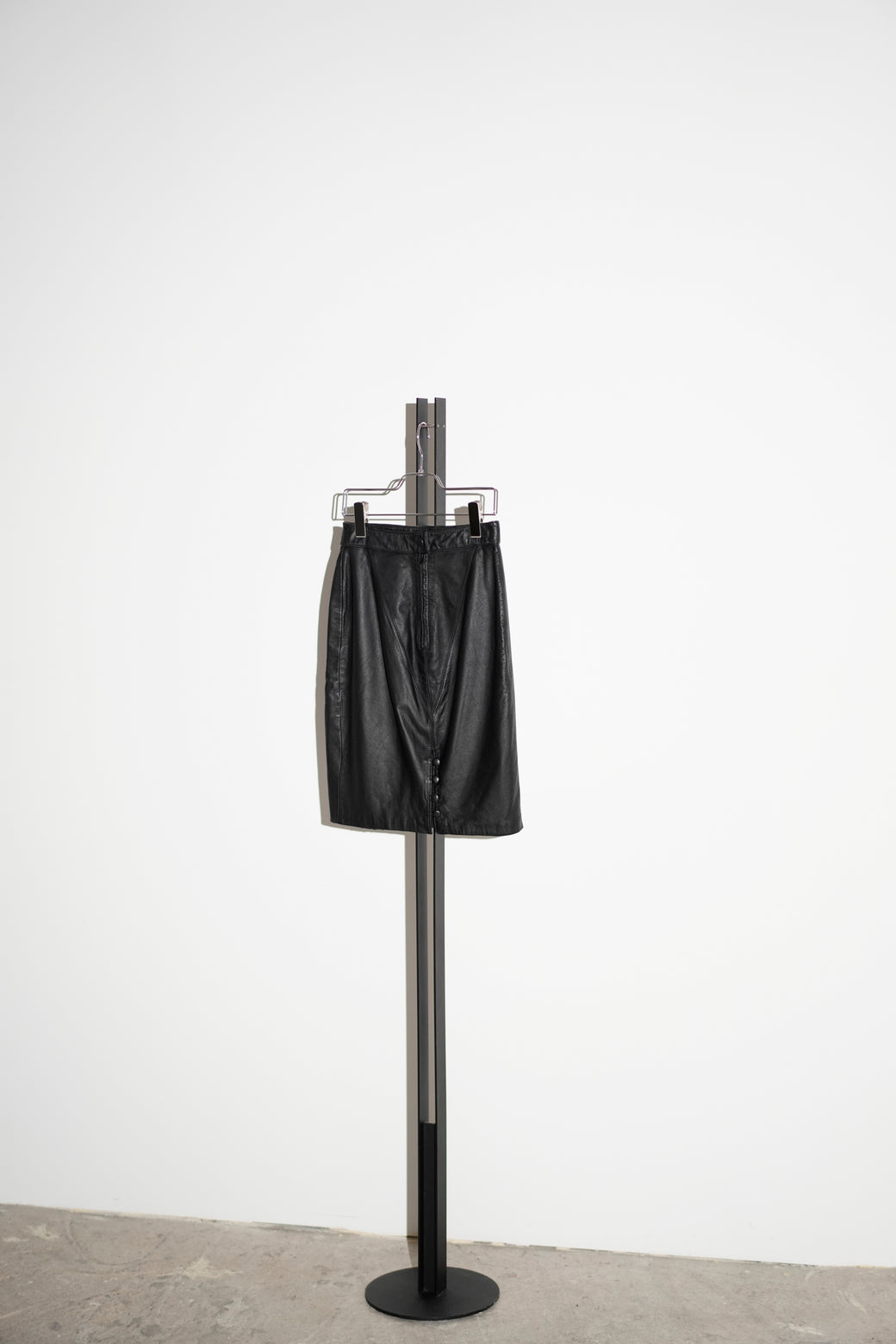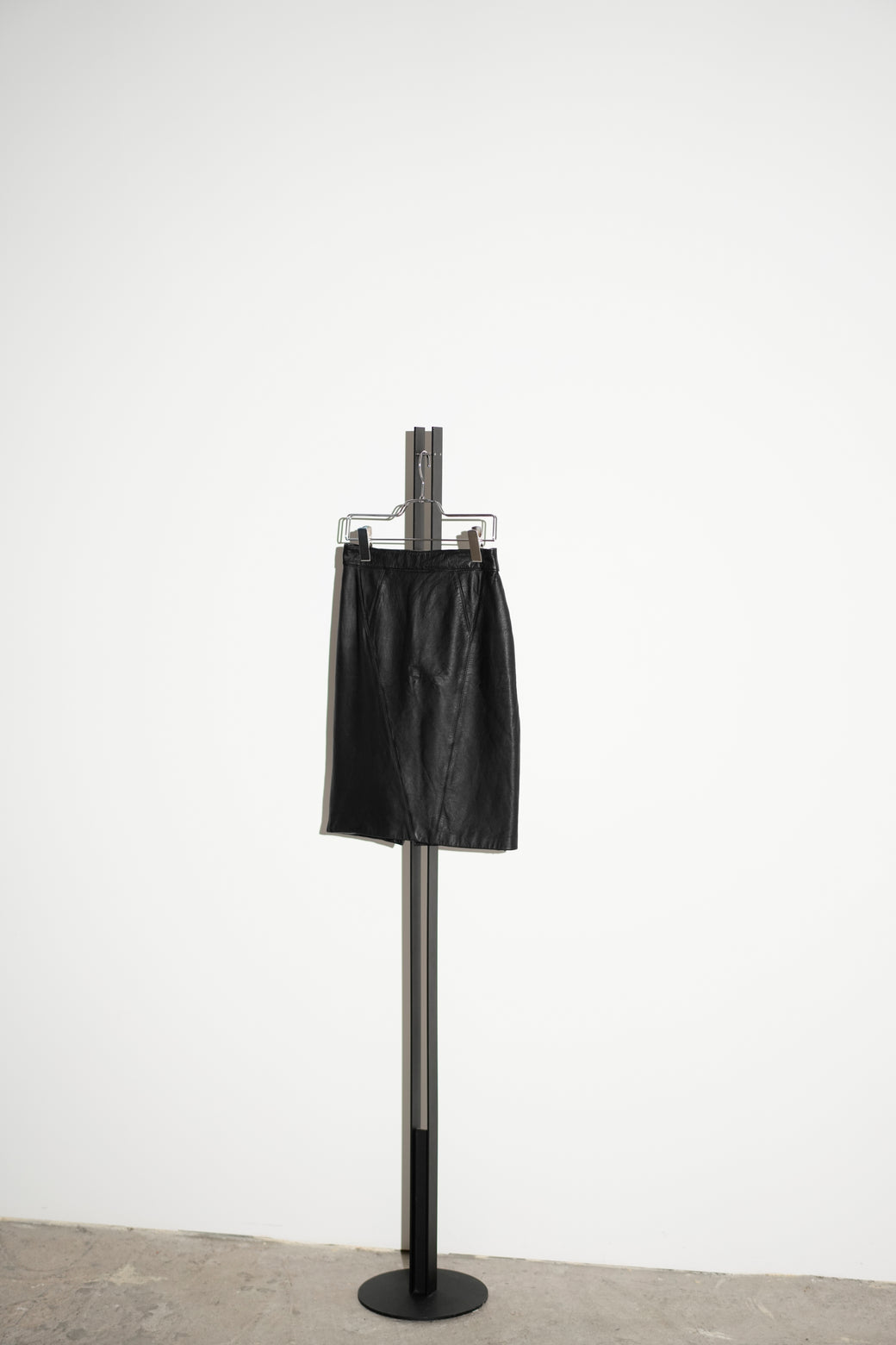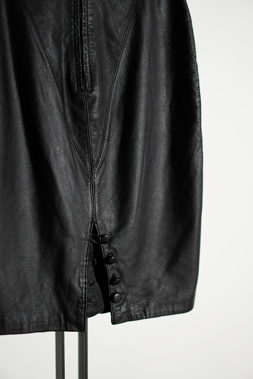 This is a mid-length leather skirt from the 1980s. Its design is characterized by a sculpted panel construction and button details at the back. The leather’s balanced thickness creates a classic and substantial silhouette.It is in good condition with appropriate aging characteristics.