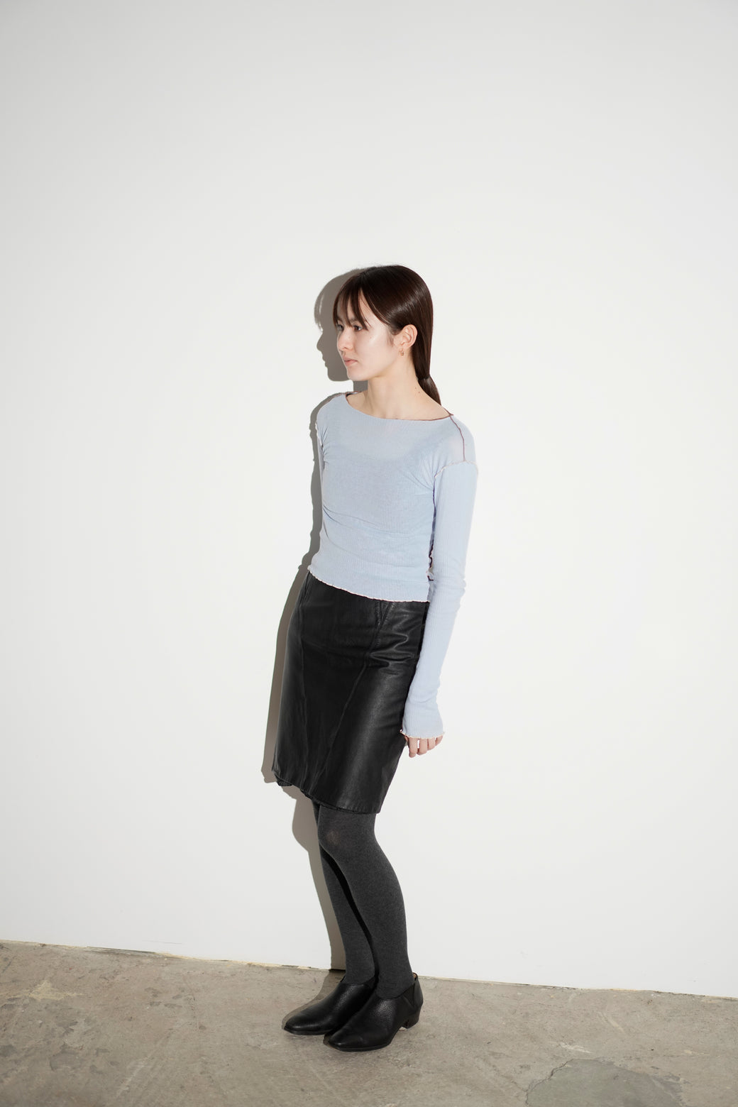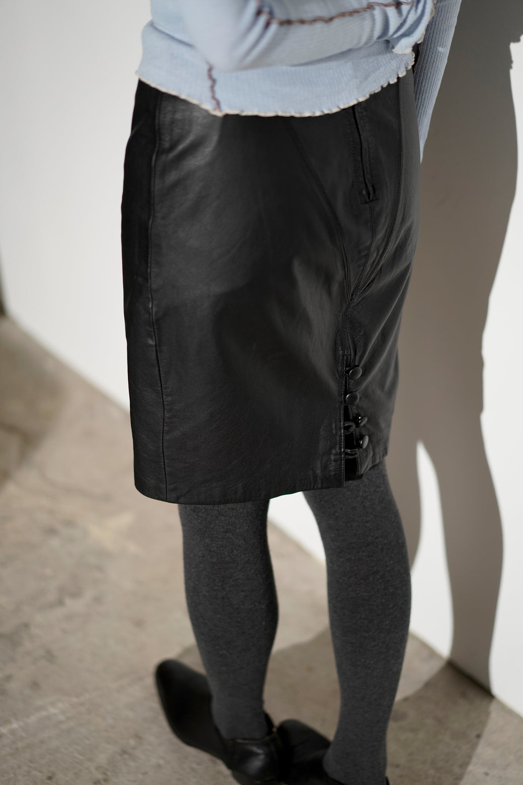 1980年代のミディアム丈レザースカート。立体的なパネル構造とバックに配されたボタンがデザインの特徴。程よい厚みのレザーが、クラシックかつ存在感のあるシルエットに。経年による適切な風合いを伴った良好なコンディション。