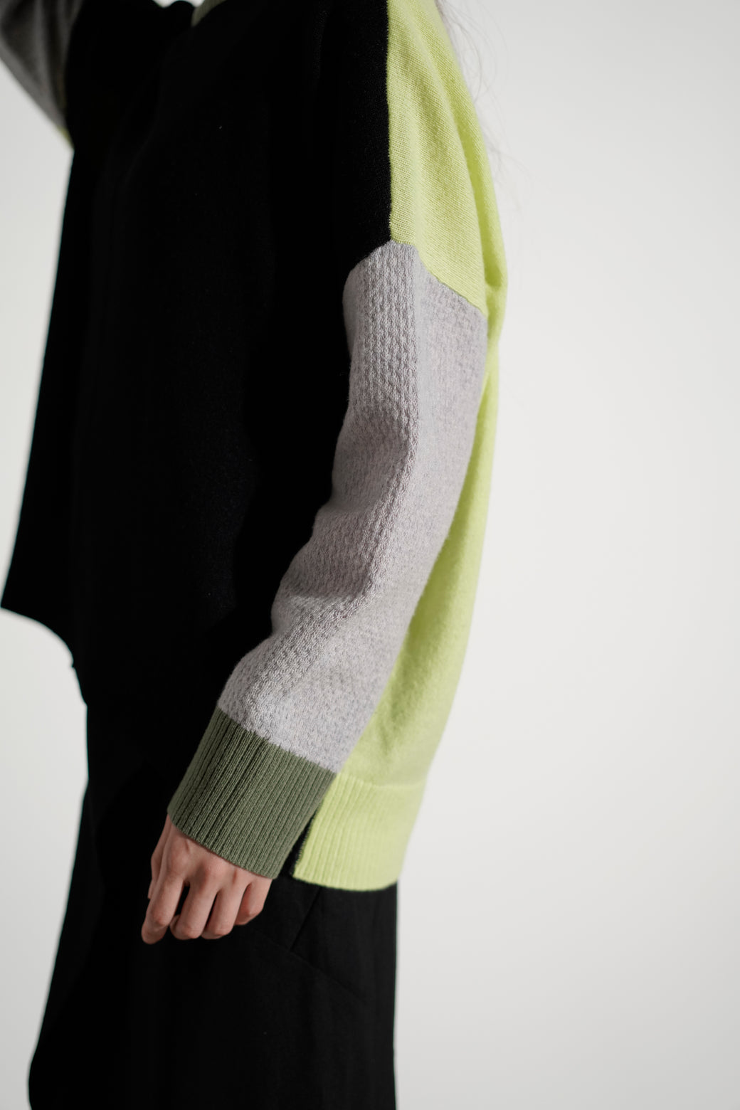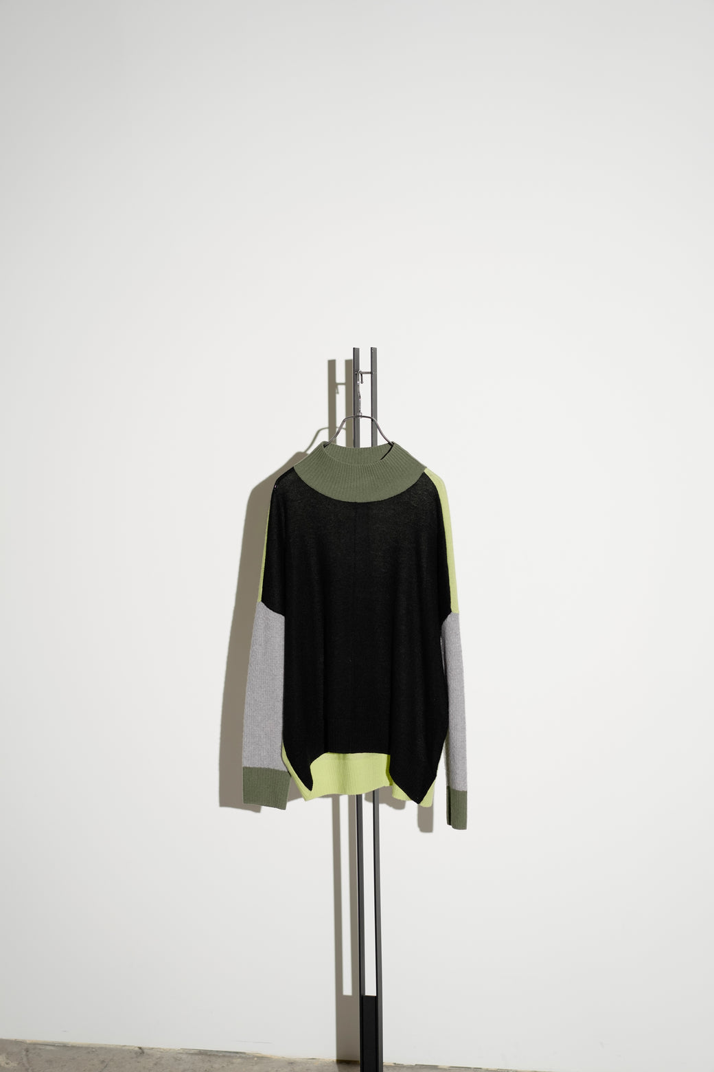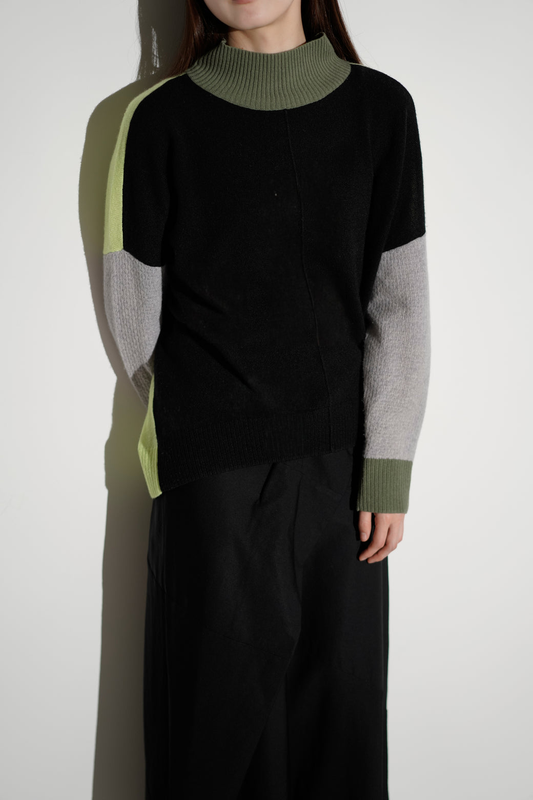 ブラックをベースに、袖と背面に配色を施したマルチカラーニット。柔らかな風合いと程よいゆとりが、リラックス感のある着心地を実現。経年による適切な風合いを伴った良好なコンディション。
