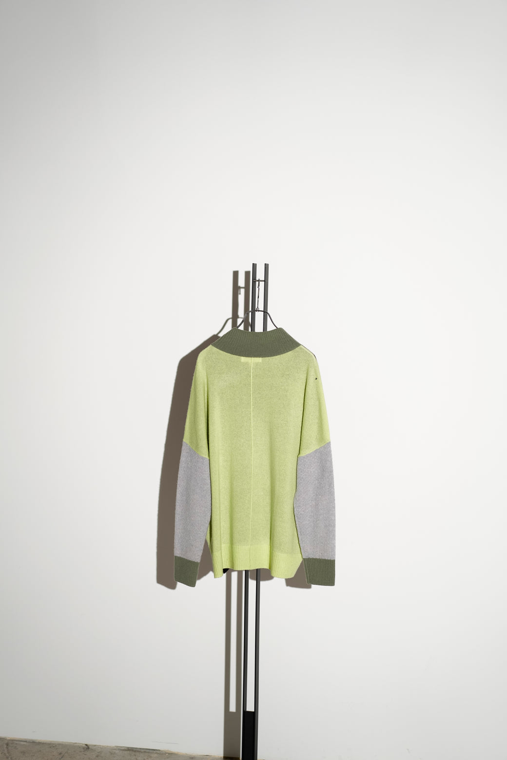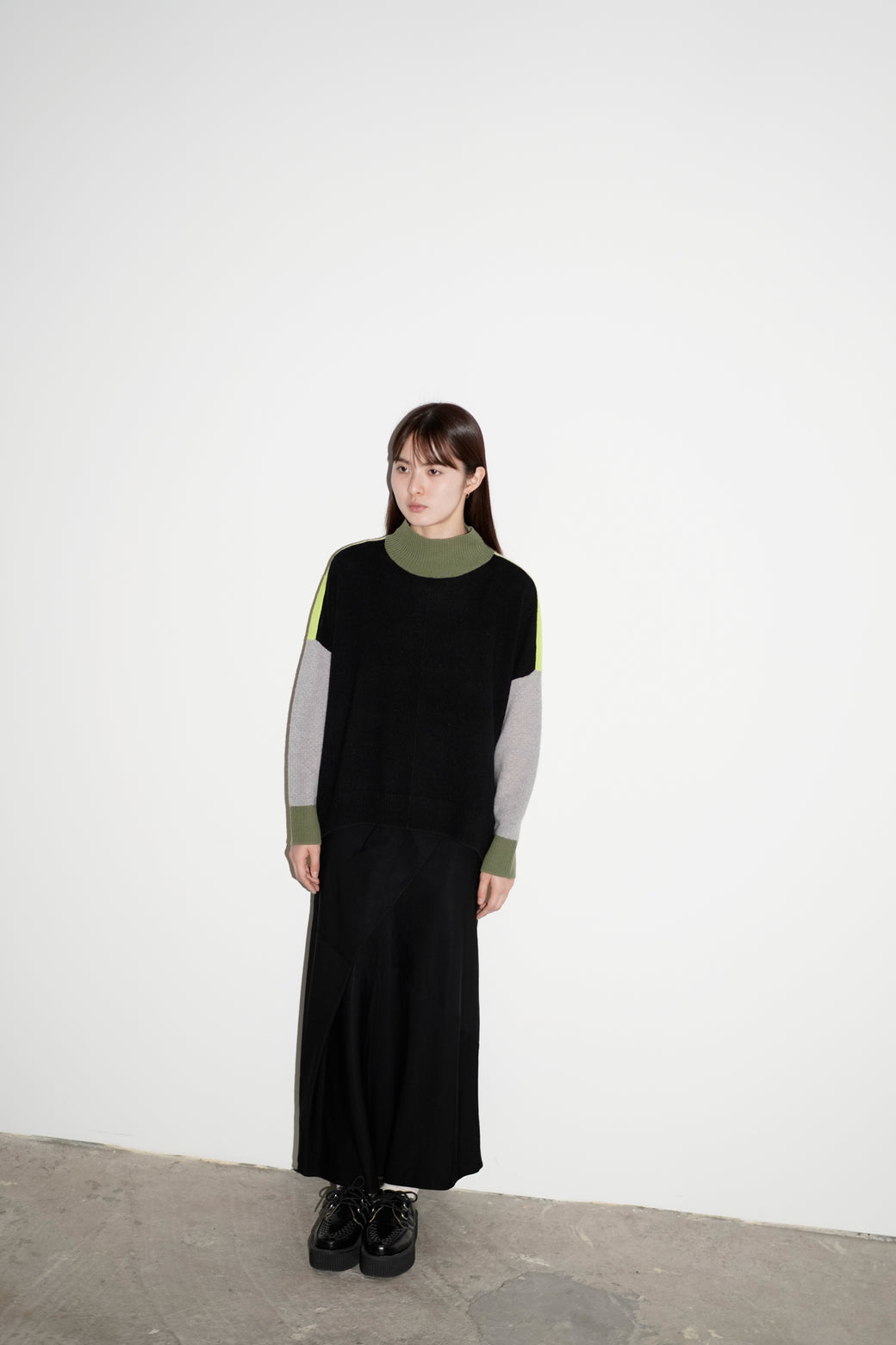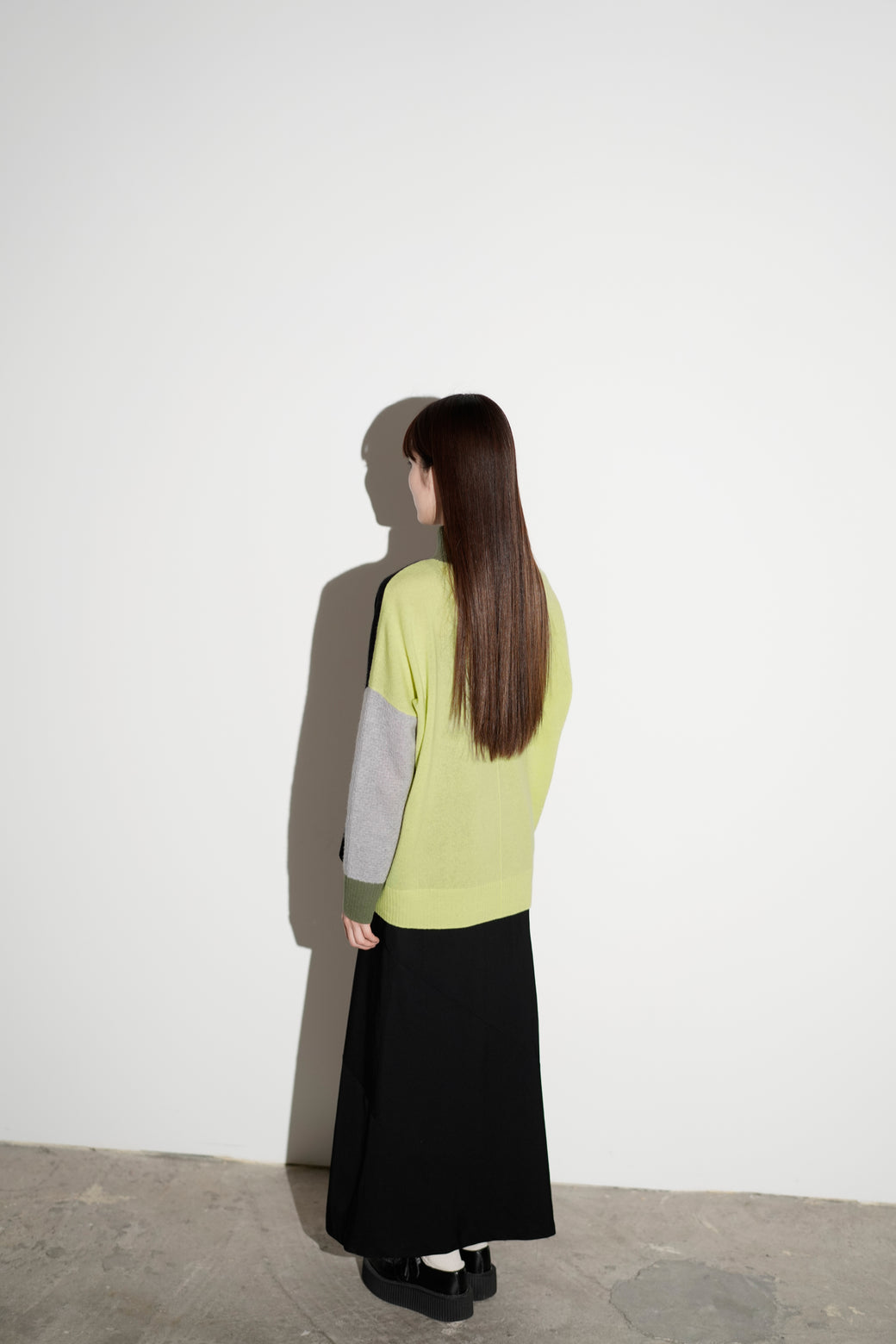 ブラックをベースに、袖と背面に配色を施したマルチカラーニット。柔らかな風合いと程よいゆとりが、リラックス感のある着心地を実現。経年による適切な風合いを伴った良好なコンディション。