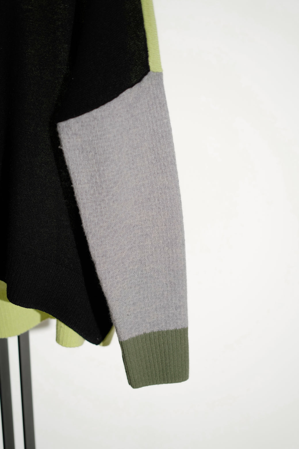This is a multi-color knit with a black base, featuring contrasting colors on the sleeves and back.The soft texture and relaxed fit provide a comfortable wearing experience. It is in good condition with appropriate aging characteristics.