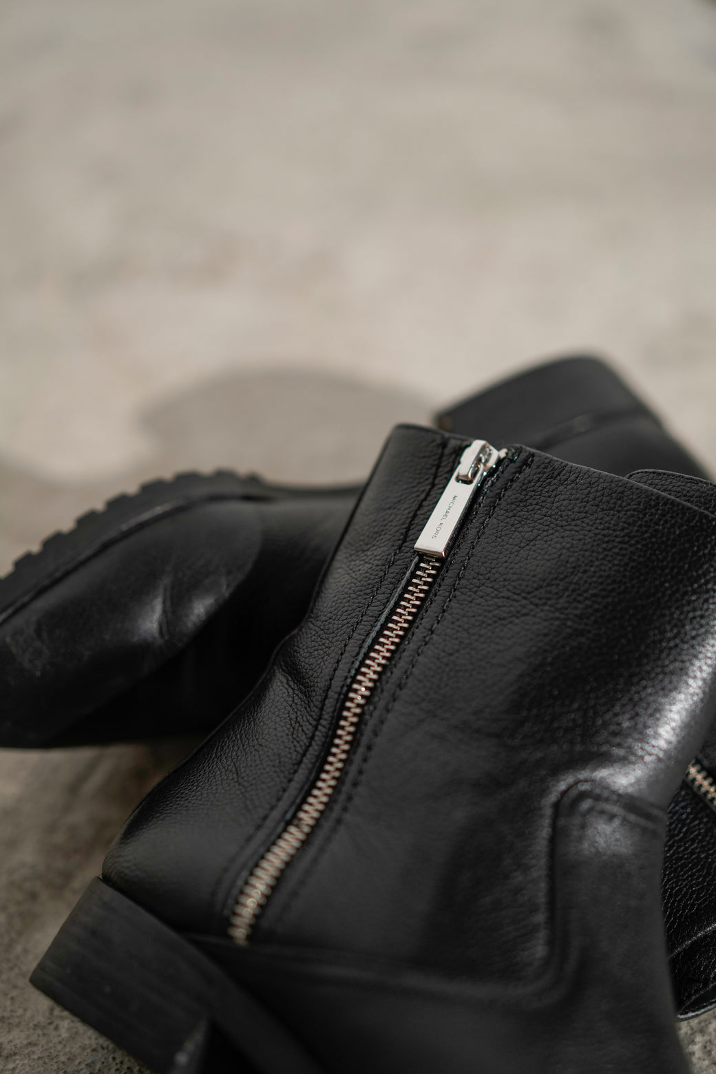 This is a pair of MICHAEL KORS leather ankle boots from the 2000s. The silhouette features a clean, uncomplicated design with a plain toe and ankle length, constructed solely with a side zip. The upper uses black leather with a textured grain. While there is some scuffing on the inside, the surface maintains good condition with an appropriate patina from age.