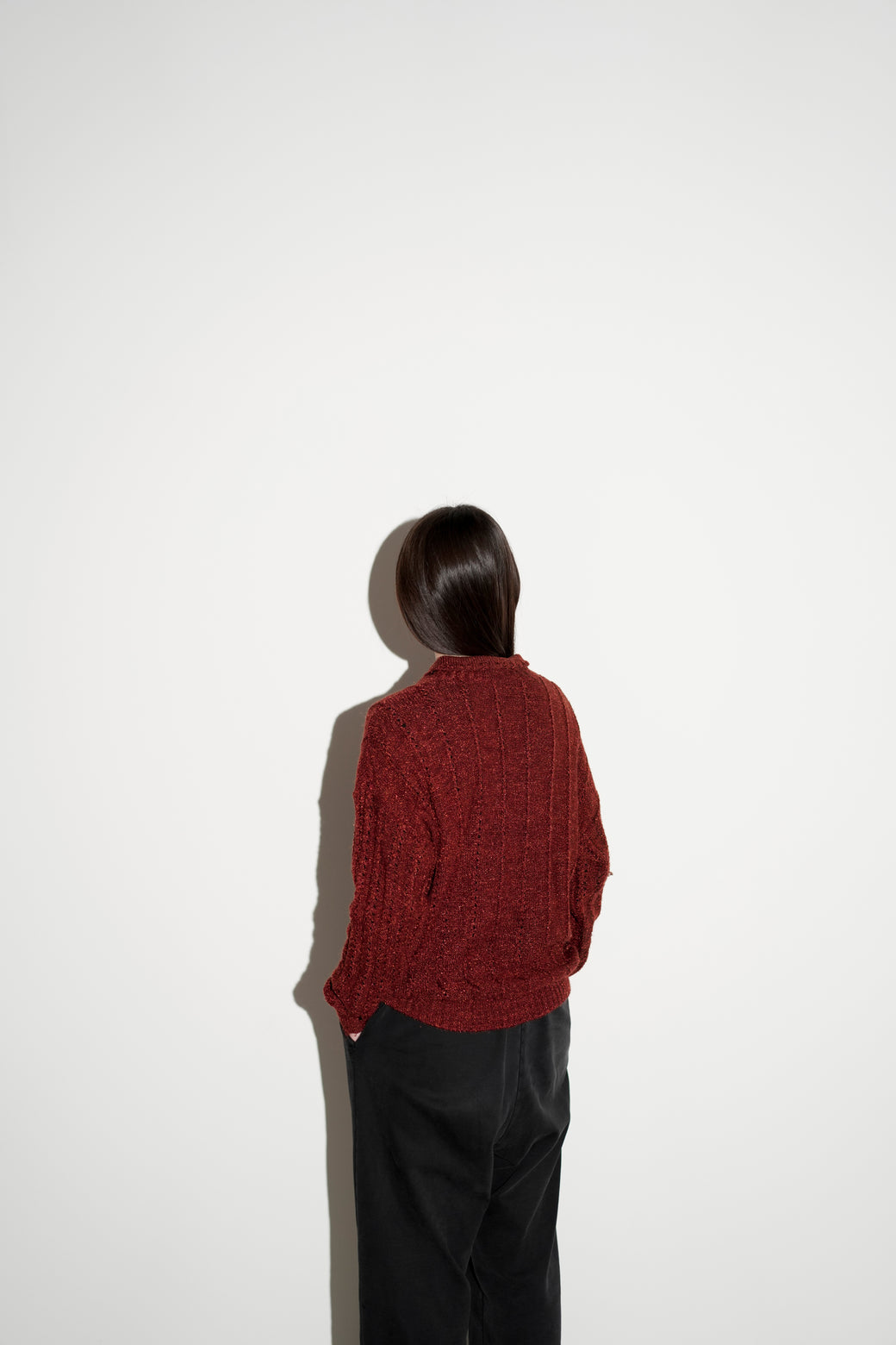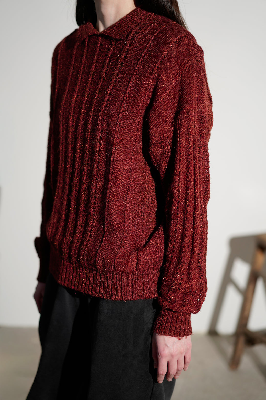This is a knit polo from the 2000s. It features a fabric with a subtle shimmer, openwork knitting, and a lightweight feel. It is in good condition with appropriate aging characteristics.