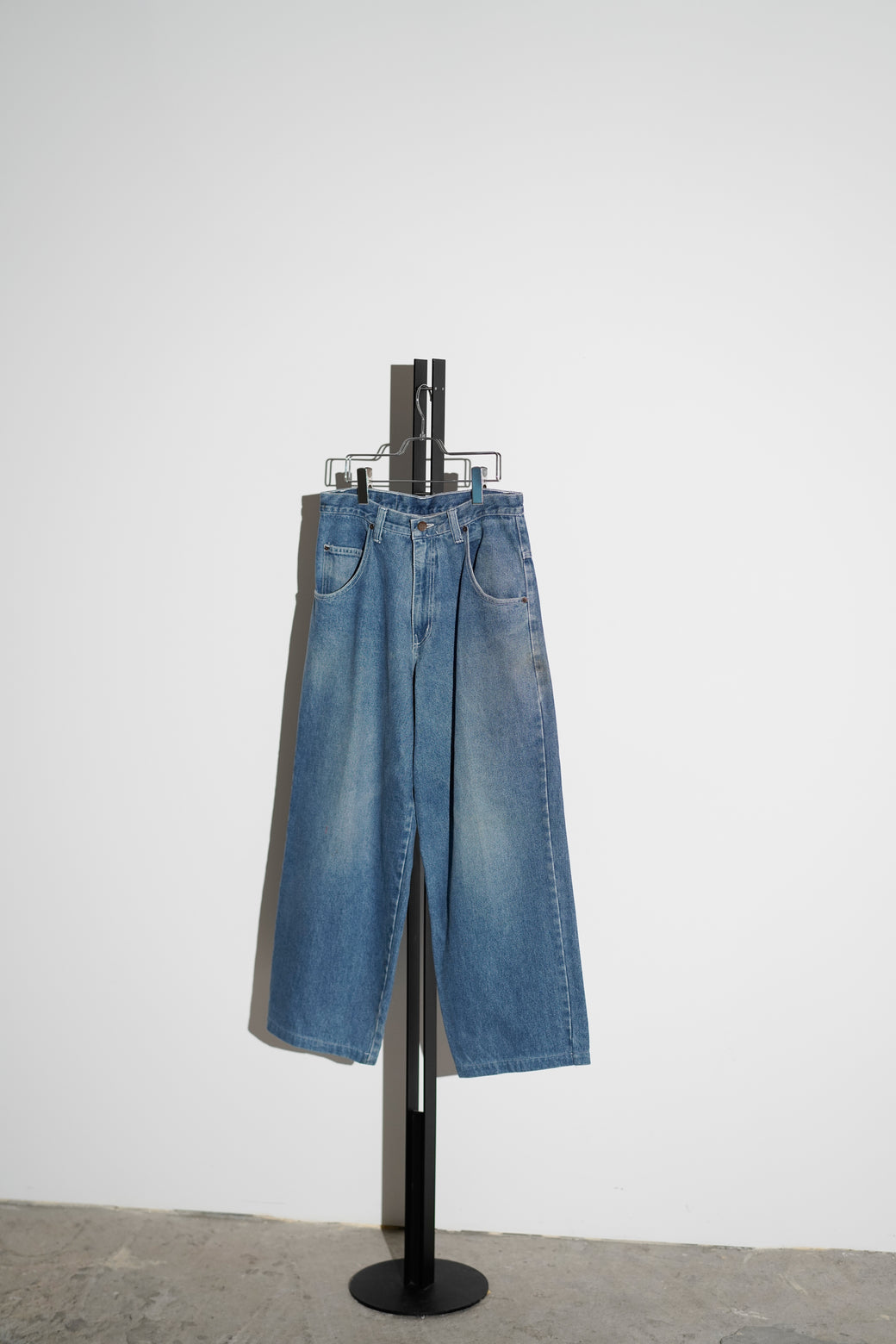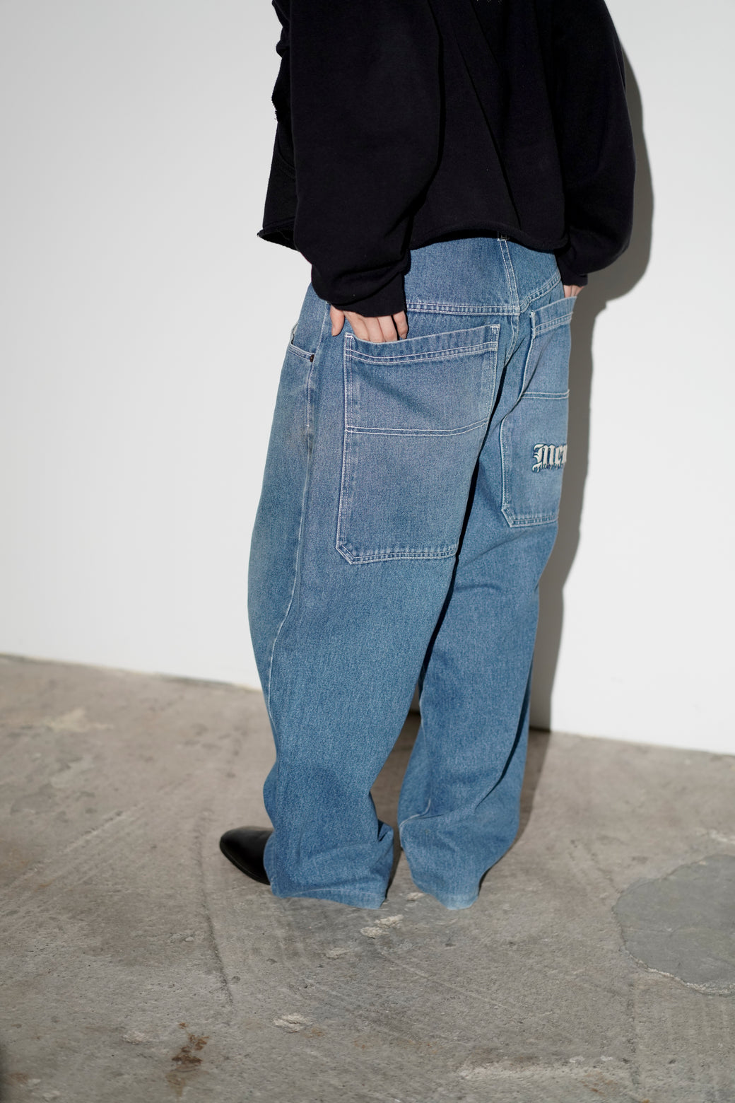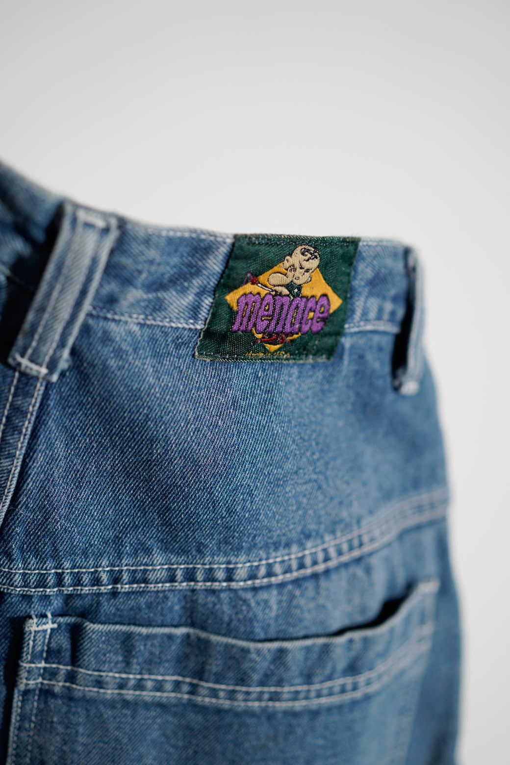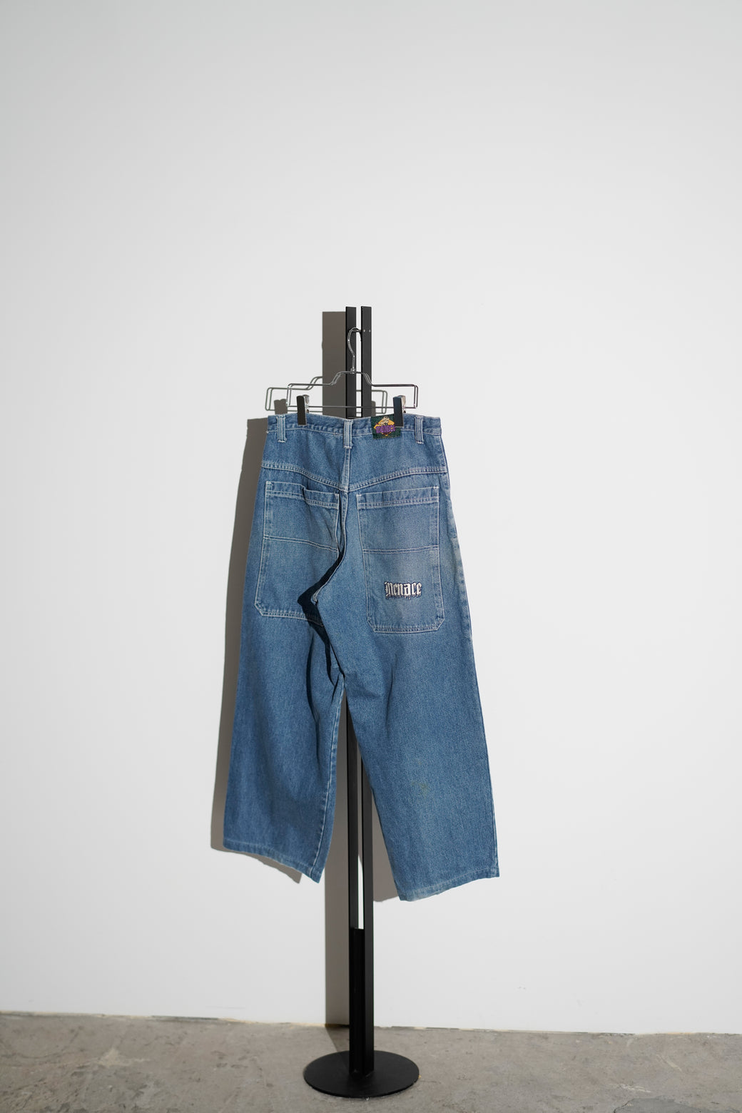 1990-2000年代MENACEのワイドデニム。深めの股上で、ヒップから裾まで直線的に落ちるワイドシルエット。バックには大ぶりなスクエア型パッチポケットが配置されています。MADE IN USA。経年による適切な風合いを伴った良好なコンディション。