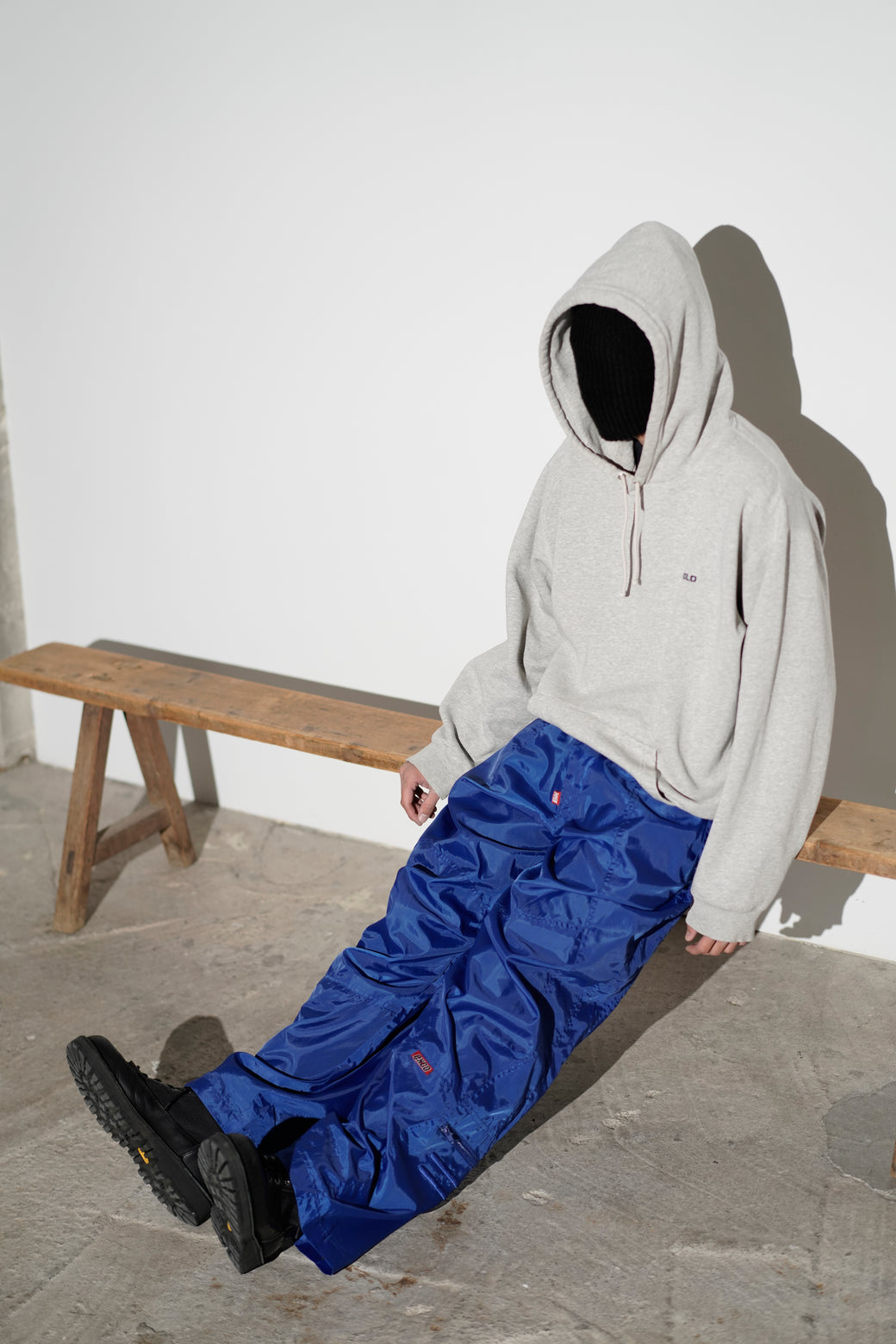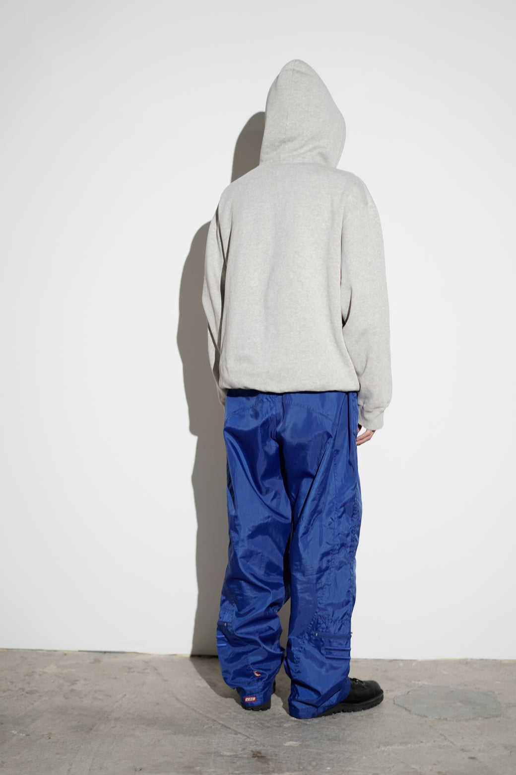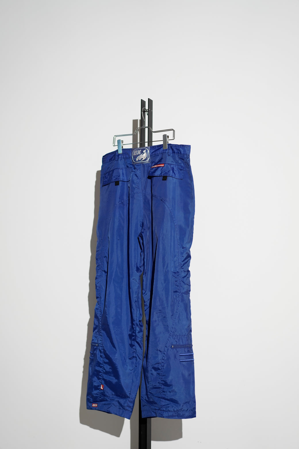 These are EXCO tech nylon pants from the 2000s. Crafted from voluminous, lustrous nylon fabric, they feature intricate details and a cyber-inspired back patch, retaining that quintessential Y2K aesthetic. They are in excellent condition with a well-aged patina.
