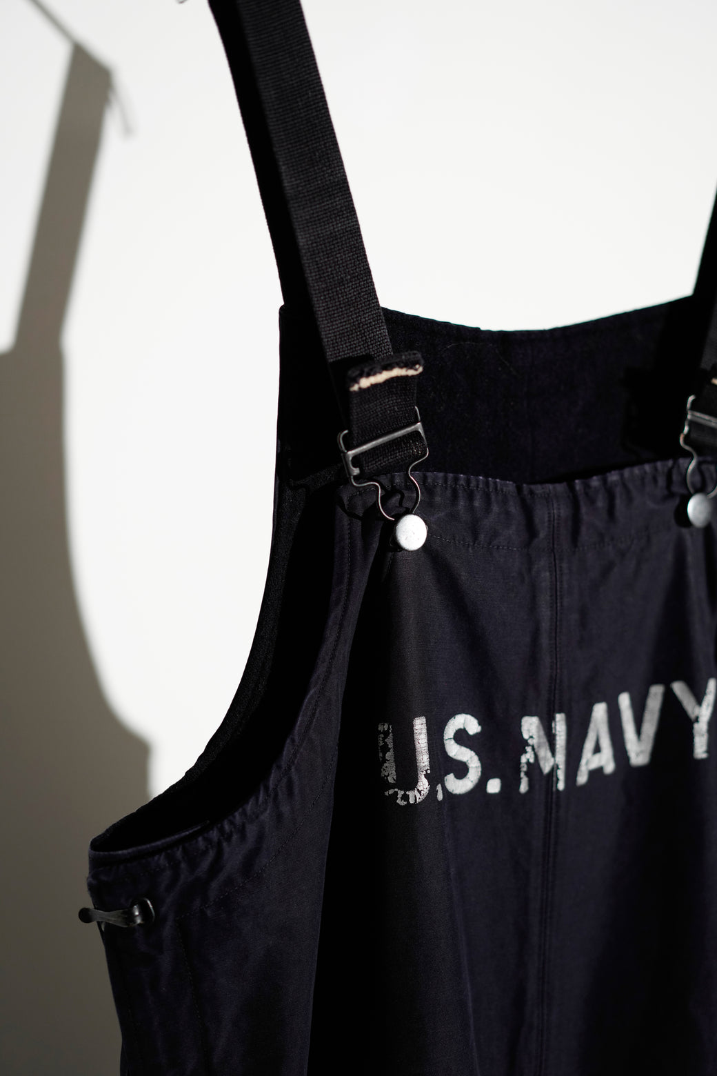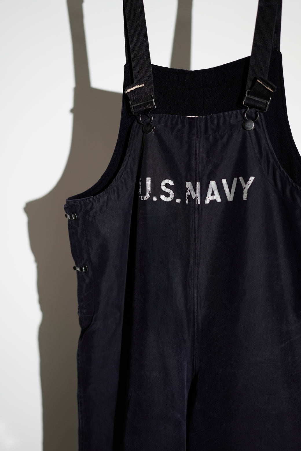 1960年代以降の 「U.S. NAVY」の オーバーオール。全体的に程よいフェード感とフロントの "U.S. NAVY"の ステンシルが雰囲気のあるアーカイブ。コットンツイル素材でライニングは厚手のウール地仕様。経年による適切な風合いを伴ったコンディション。