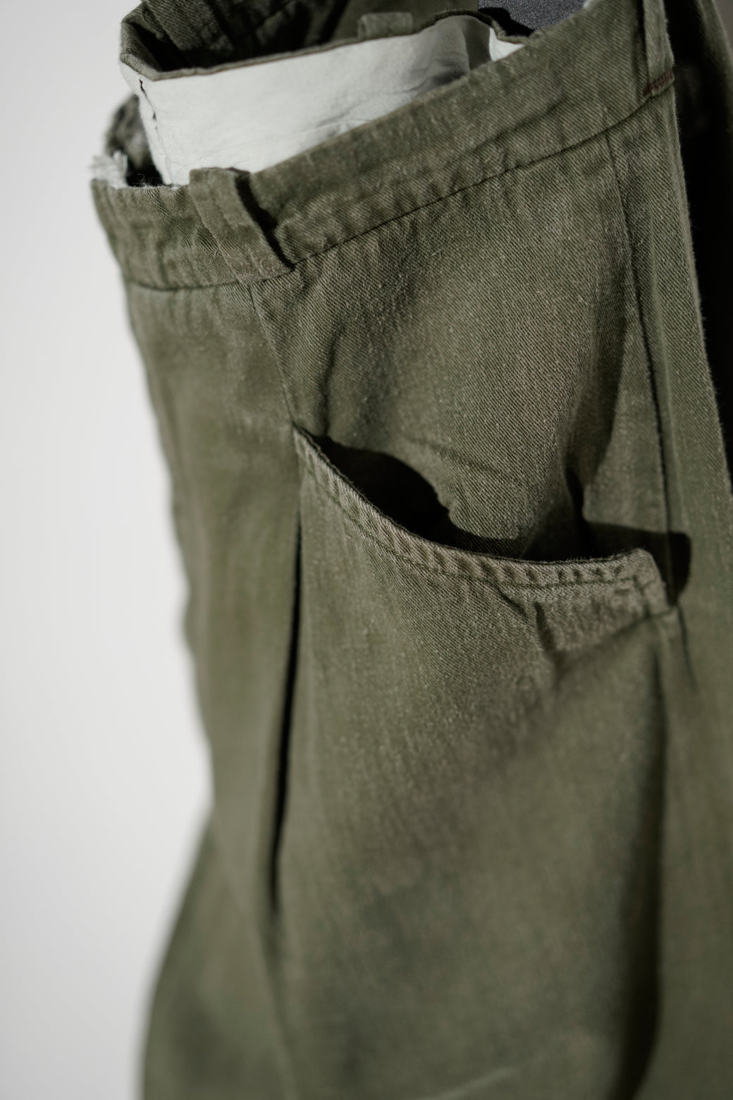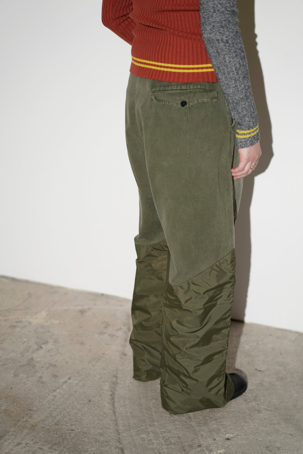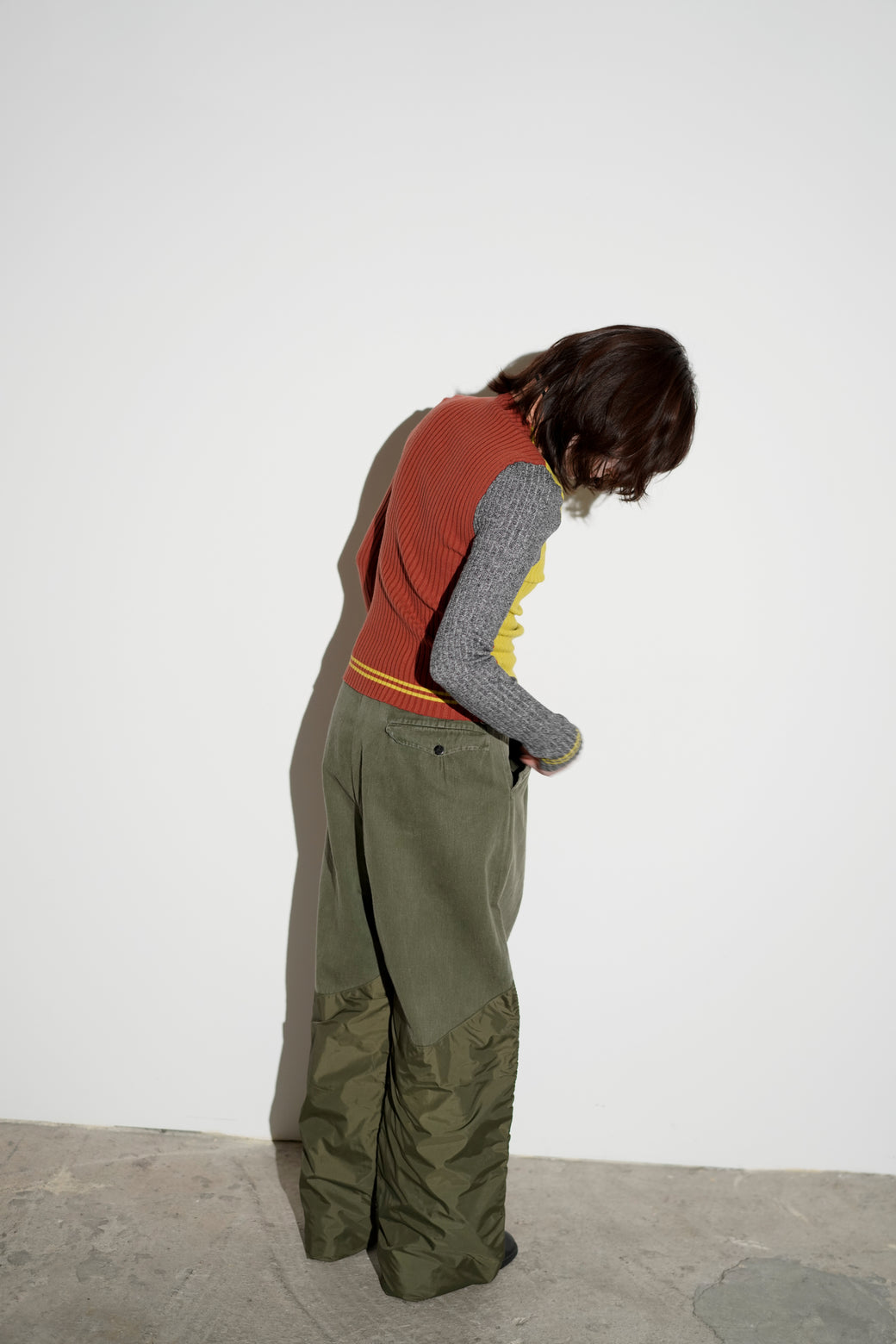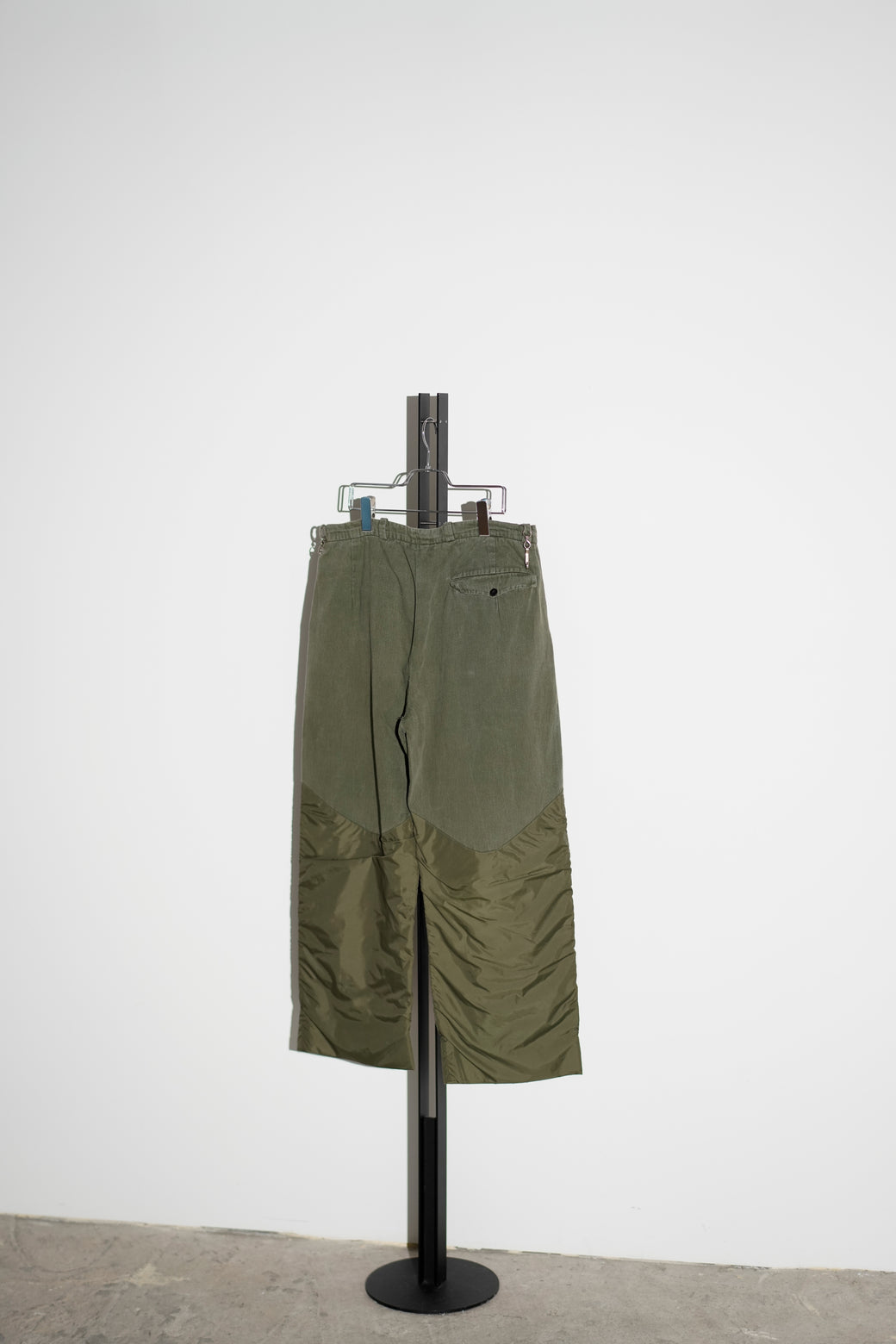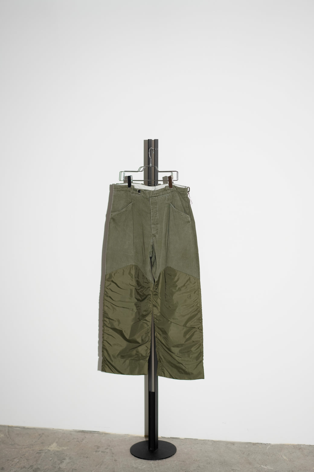 異素材切替を施したミリタリーテイストのワイドトラウザー。立体的なパネル構成と分量感のあるシルエットが特徴。ワークウェアやミリタリーウェアに見られる構造的要素を、日常着として再構成した一本。経年による適切な風合いを伴った良好なコンディション。
