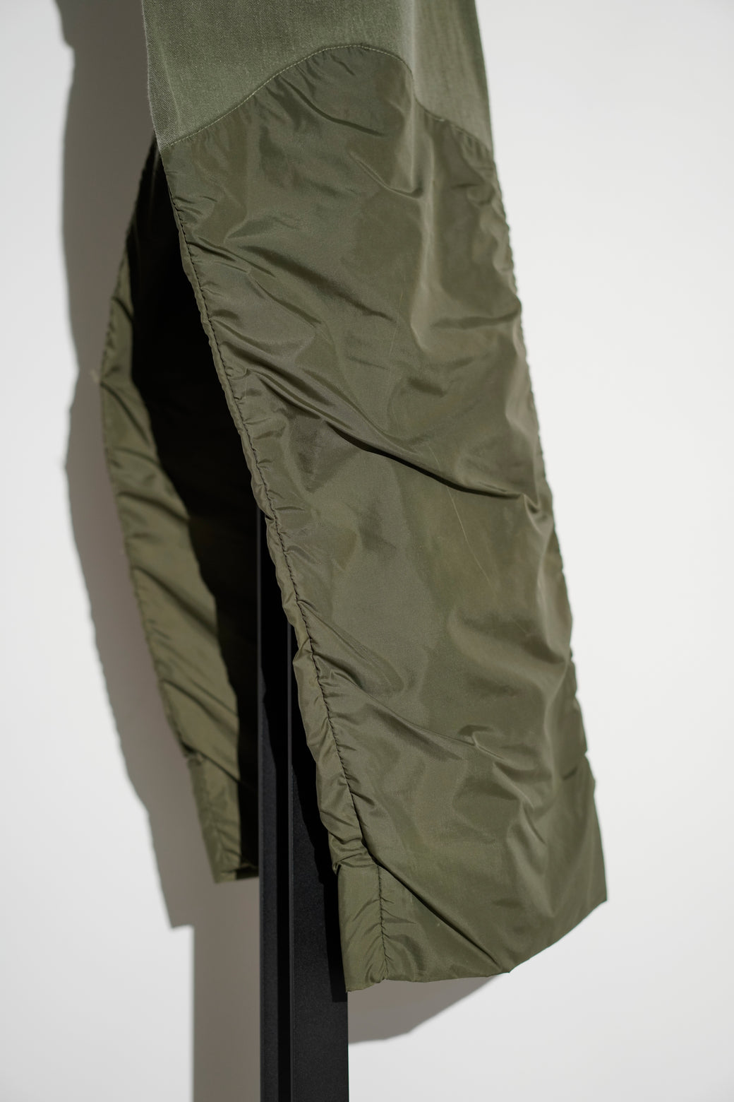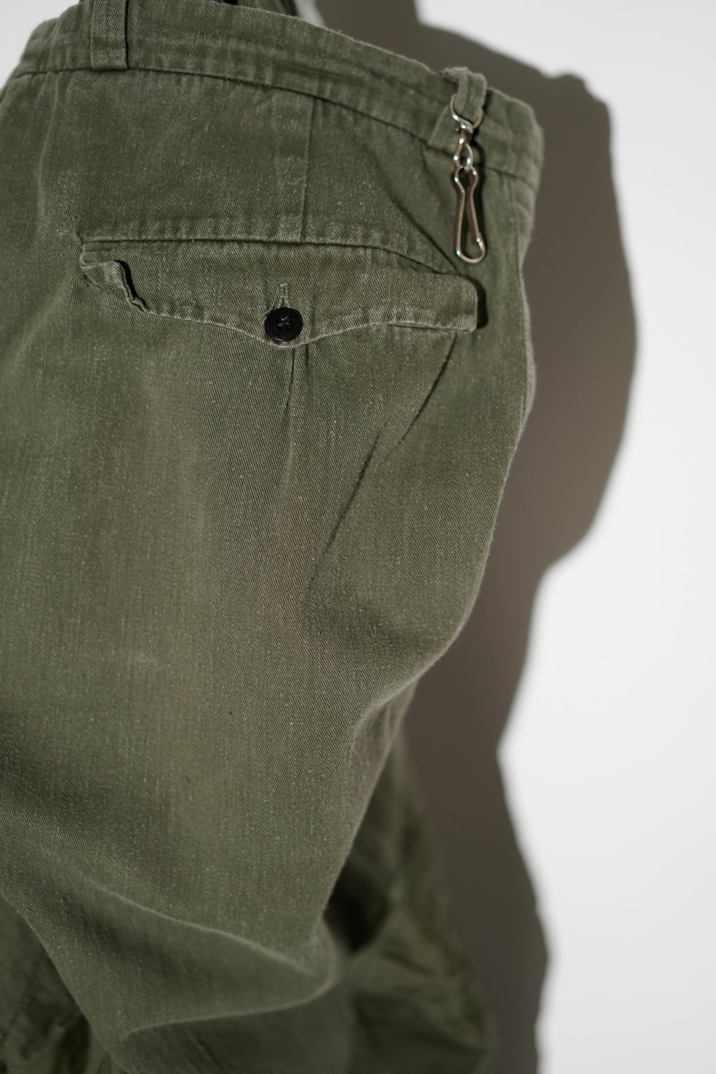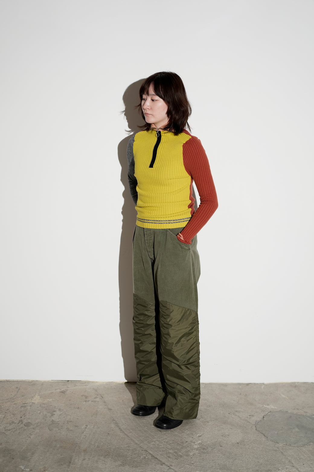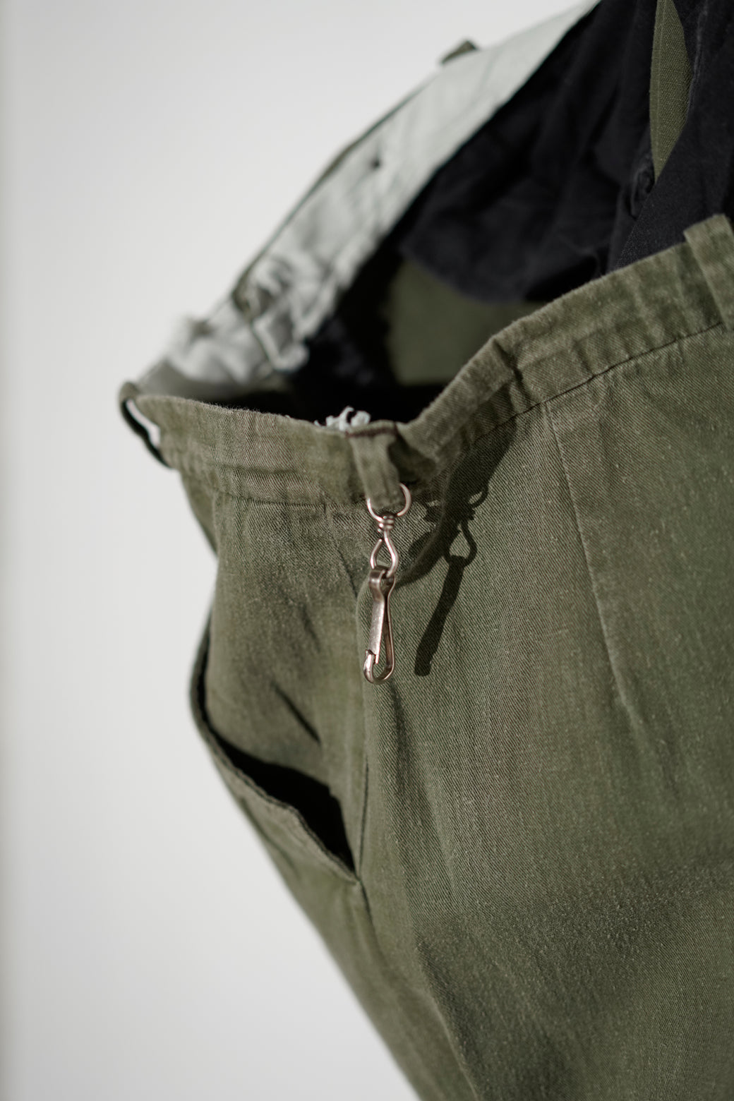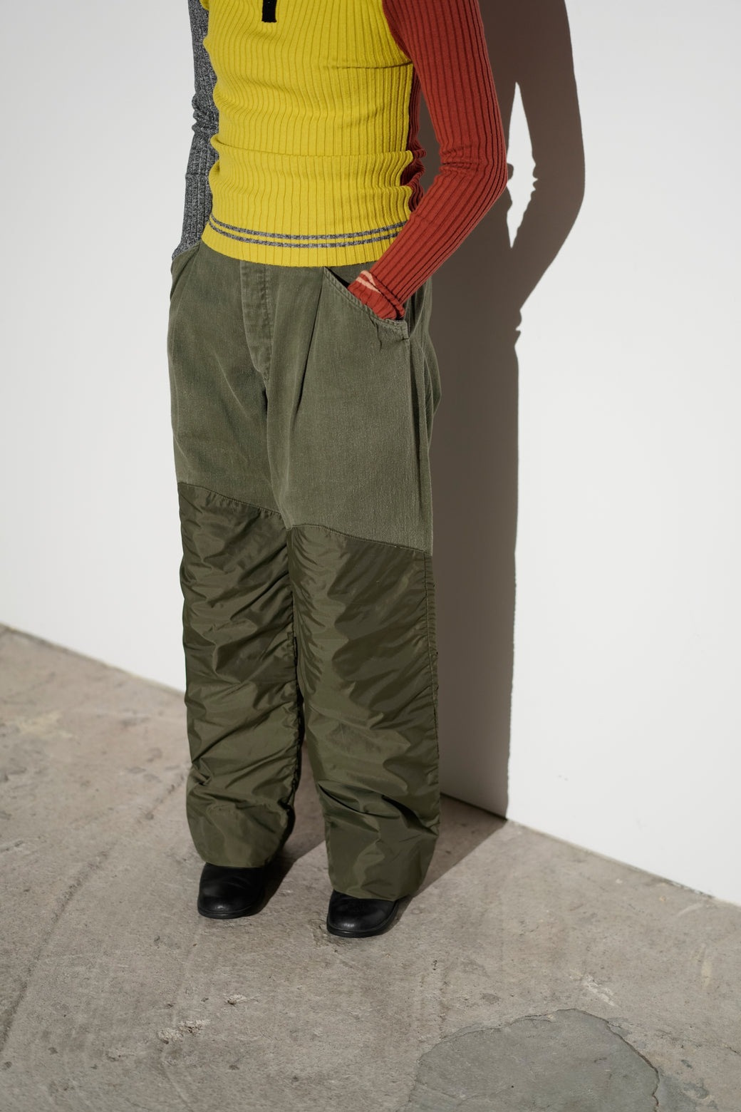 異素材切替を施したミリタリーテイストのワイドトラウザー。立体的なパネル構成と分量感のあるシルエットが特徴。ワークウェアやミリタリーウェアに見られる構造的要素を、日常着として再構成した一本。経年による適切な風合いを伴った良好なコンディション。