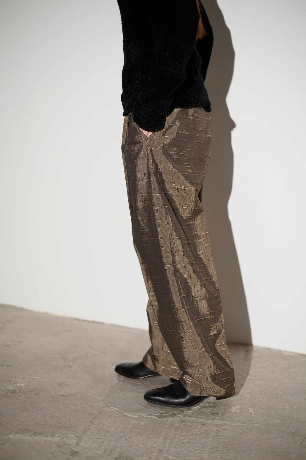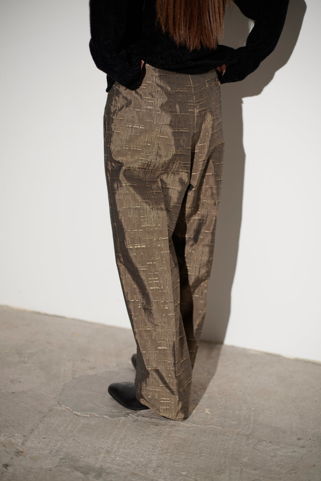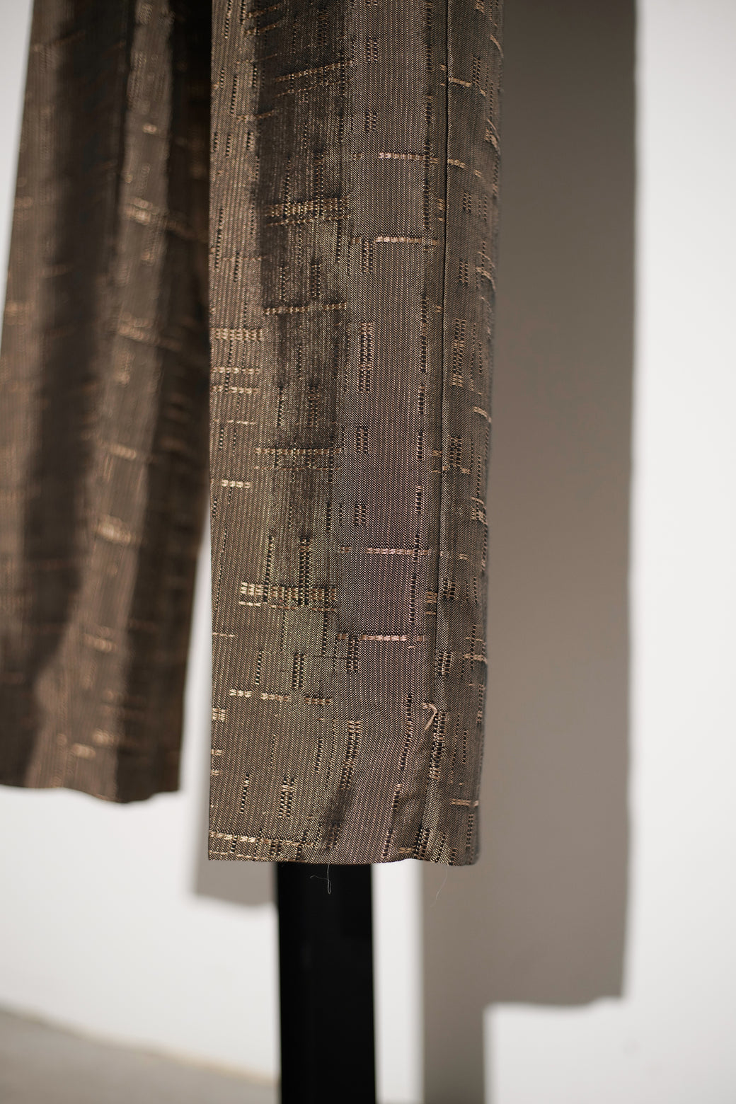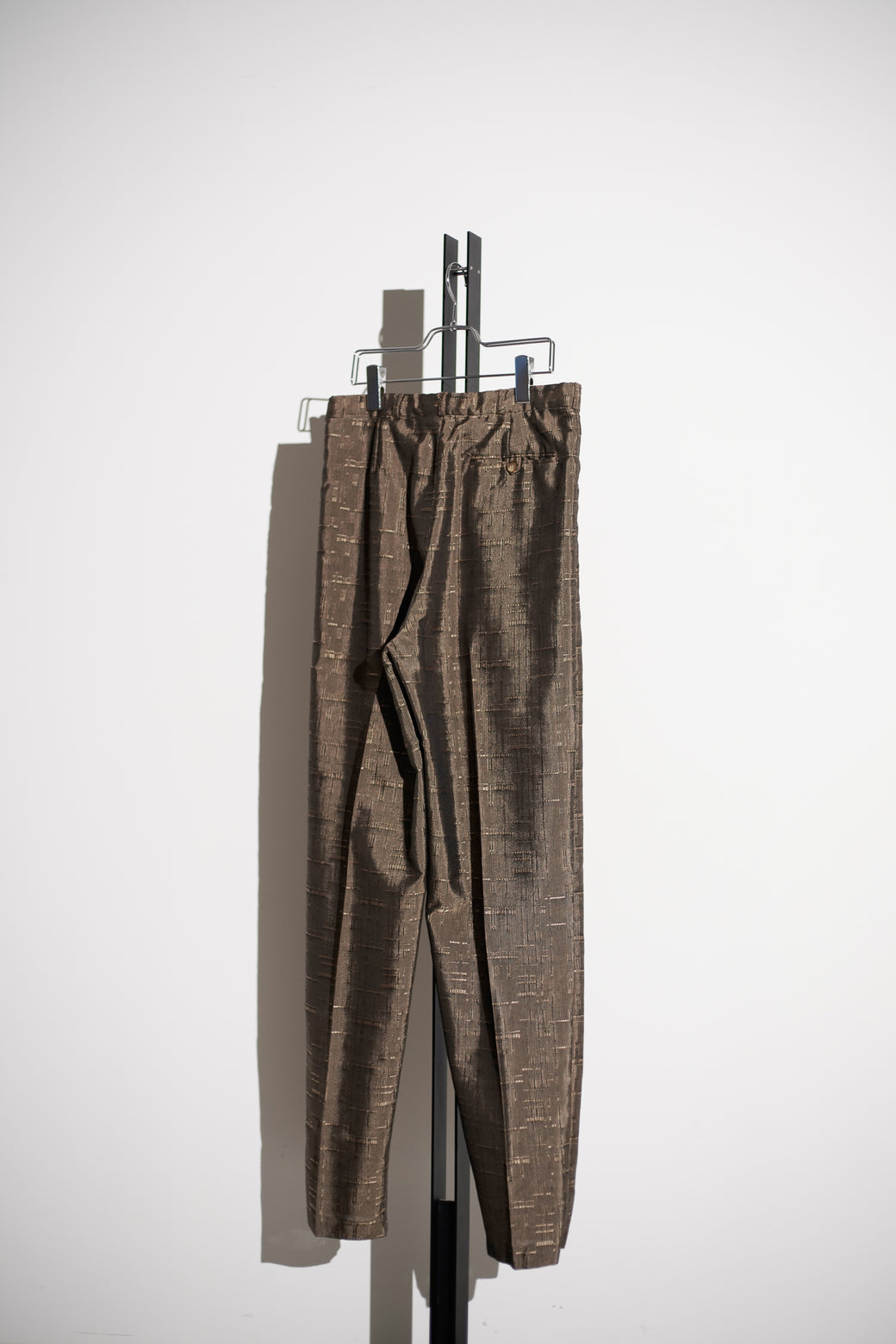 織りによる不規則な柄が入るテクスチャードファブリックのテーパードパンツ。 腰まわりにゆとりを持たせ、裾にかけて細くなるシルエット。程よい太さと品のある生地感がスタイルある1本。経年による適切な風合いを伴った良好なコンディション。