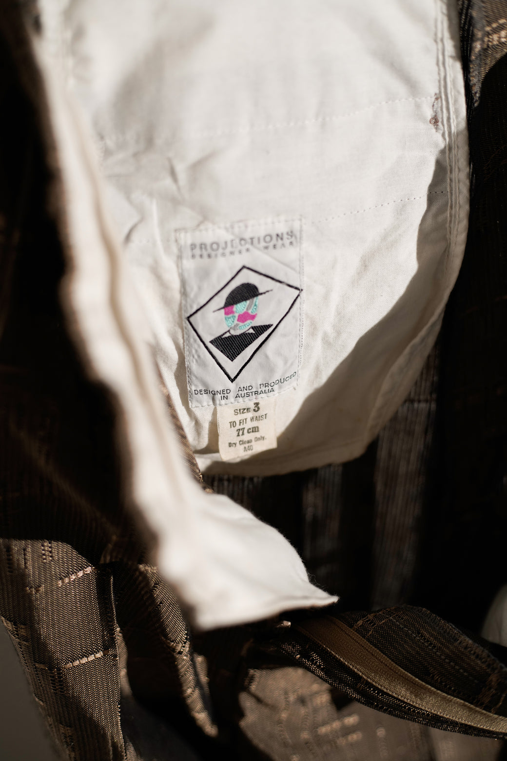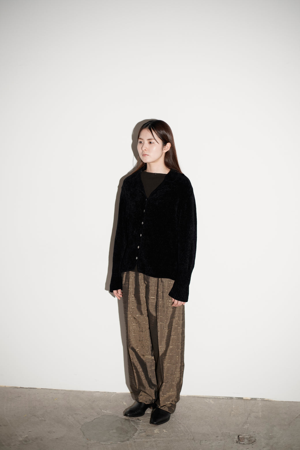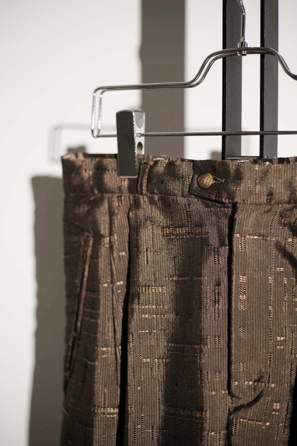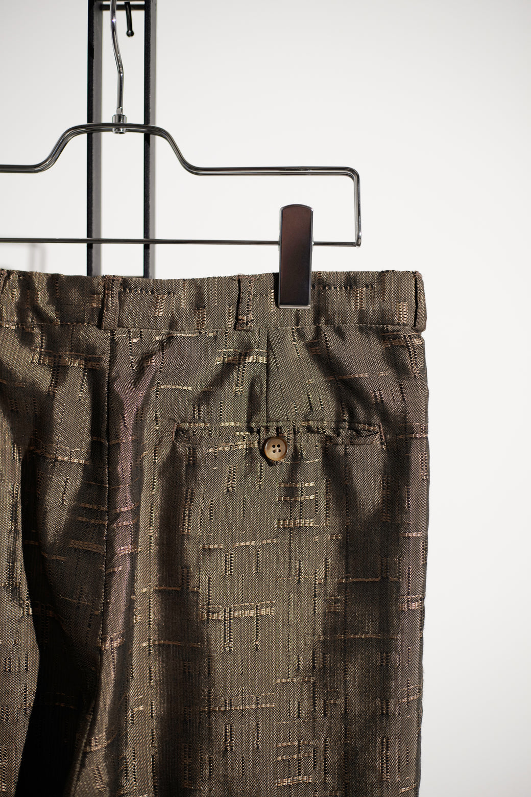 織りによる不規則な柄が入るテクスチャードファブリックのテーパードパンツ。 腰まわりにゆとりを持たせ、裾にかけて細くなるシルエット。程よい太さと品のある生地感がスタイルある1本。経年による適切な風合いを伴った良好なコンディション。