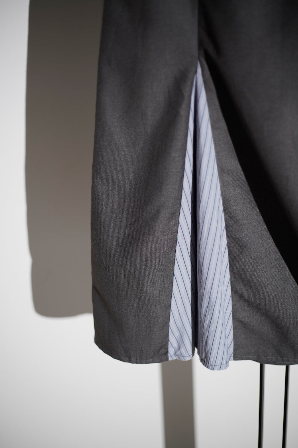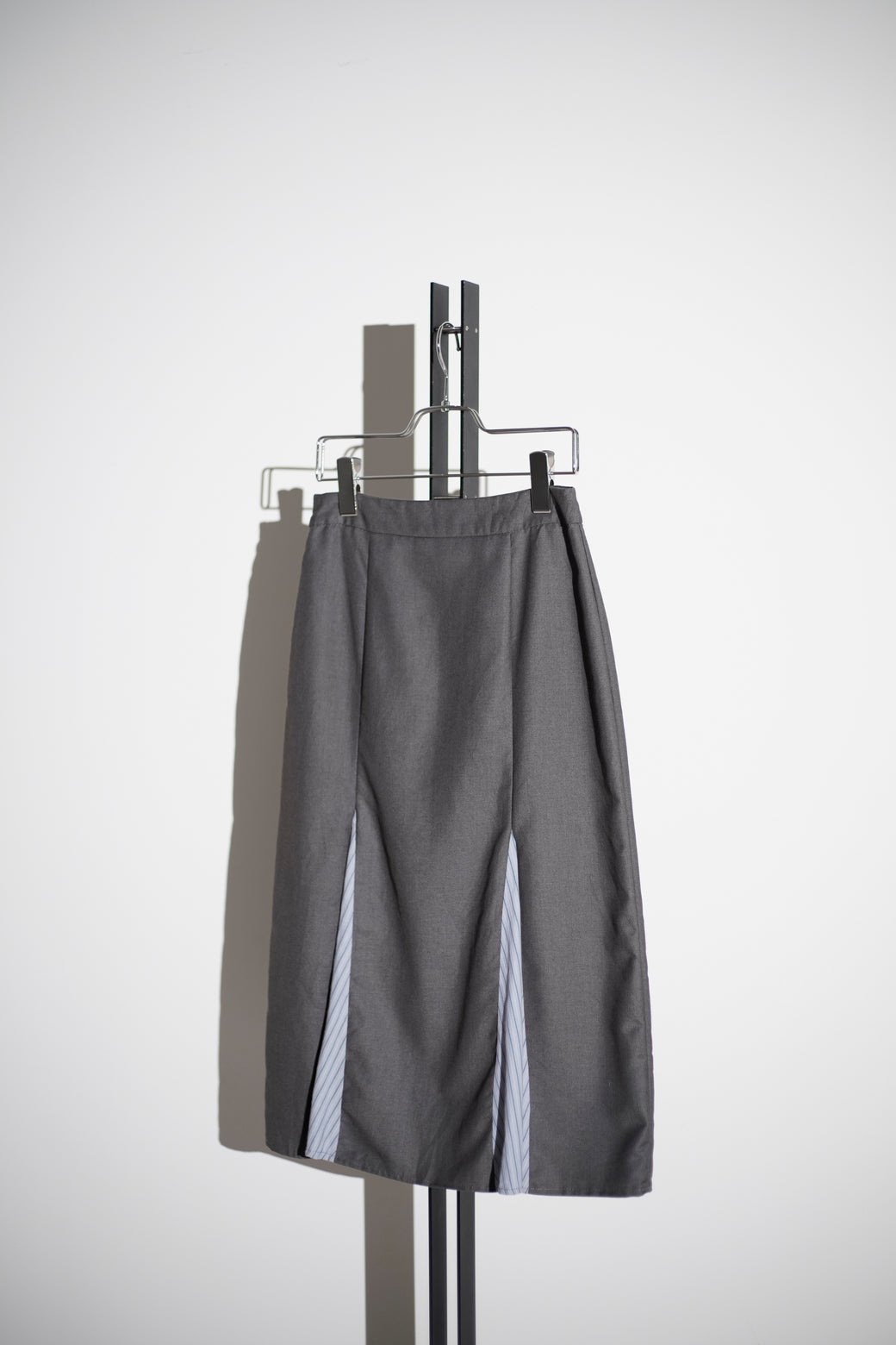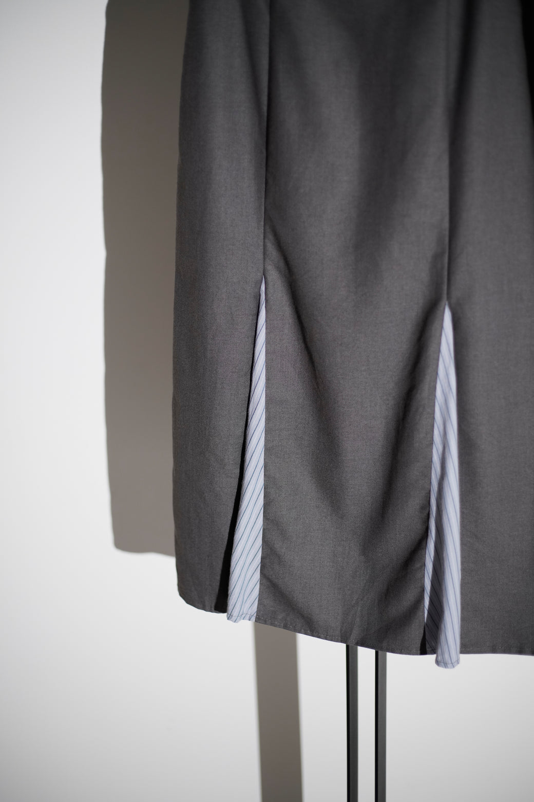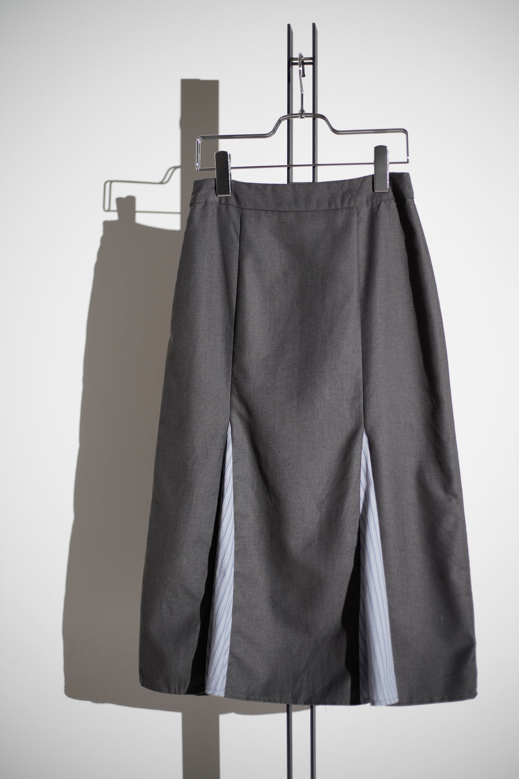 ミディ丈のレイヤードスカート。前後にストライプ地のプリーツパネルを配したデザインが特徴。経年による適切な風合いを伴った良好なコンディション。