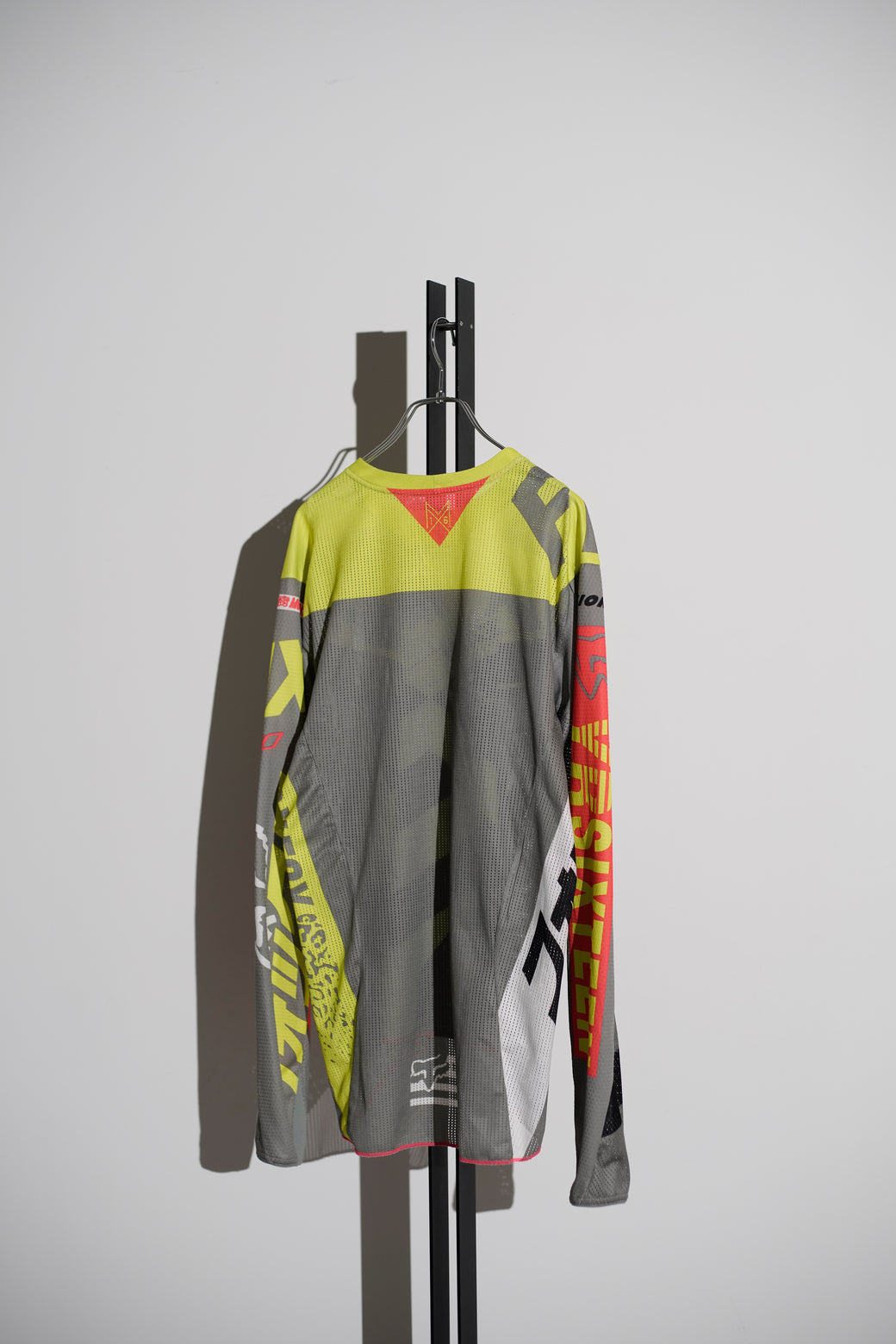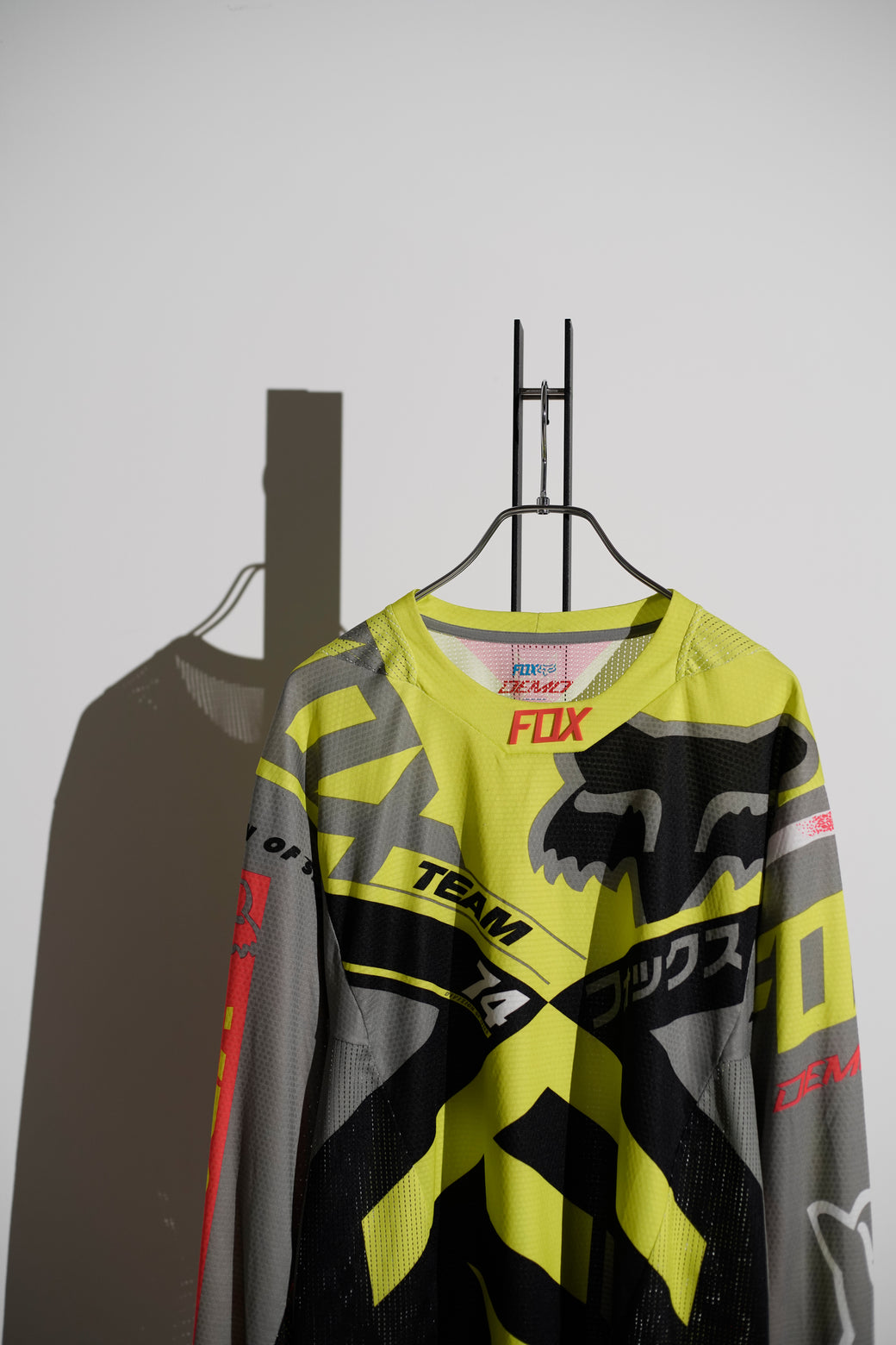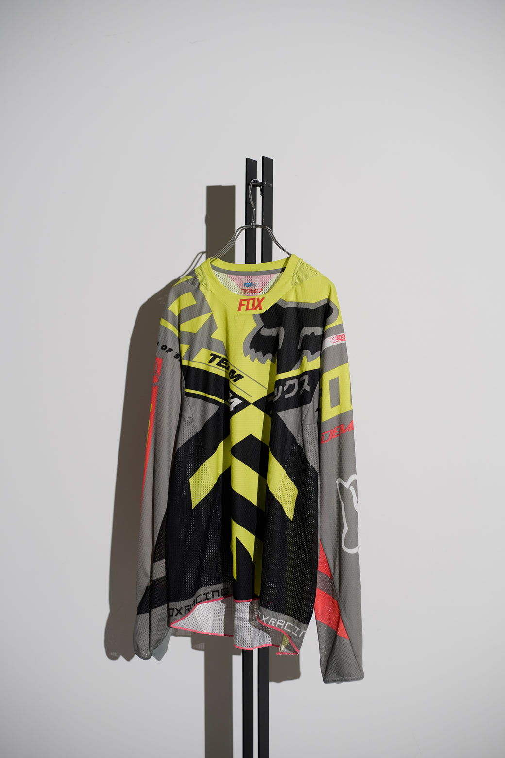 2000年代の"FOX Racing"のモトクロスレーシングジャージ。通気性の高いメッシュ素材を使用した長袖仕様。蛍光イエローを基調とした配色に、多様なグラフィックを全面に配置したデザイン。経年による適切な風合いを伴った良好なコンディション。
